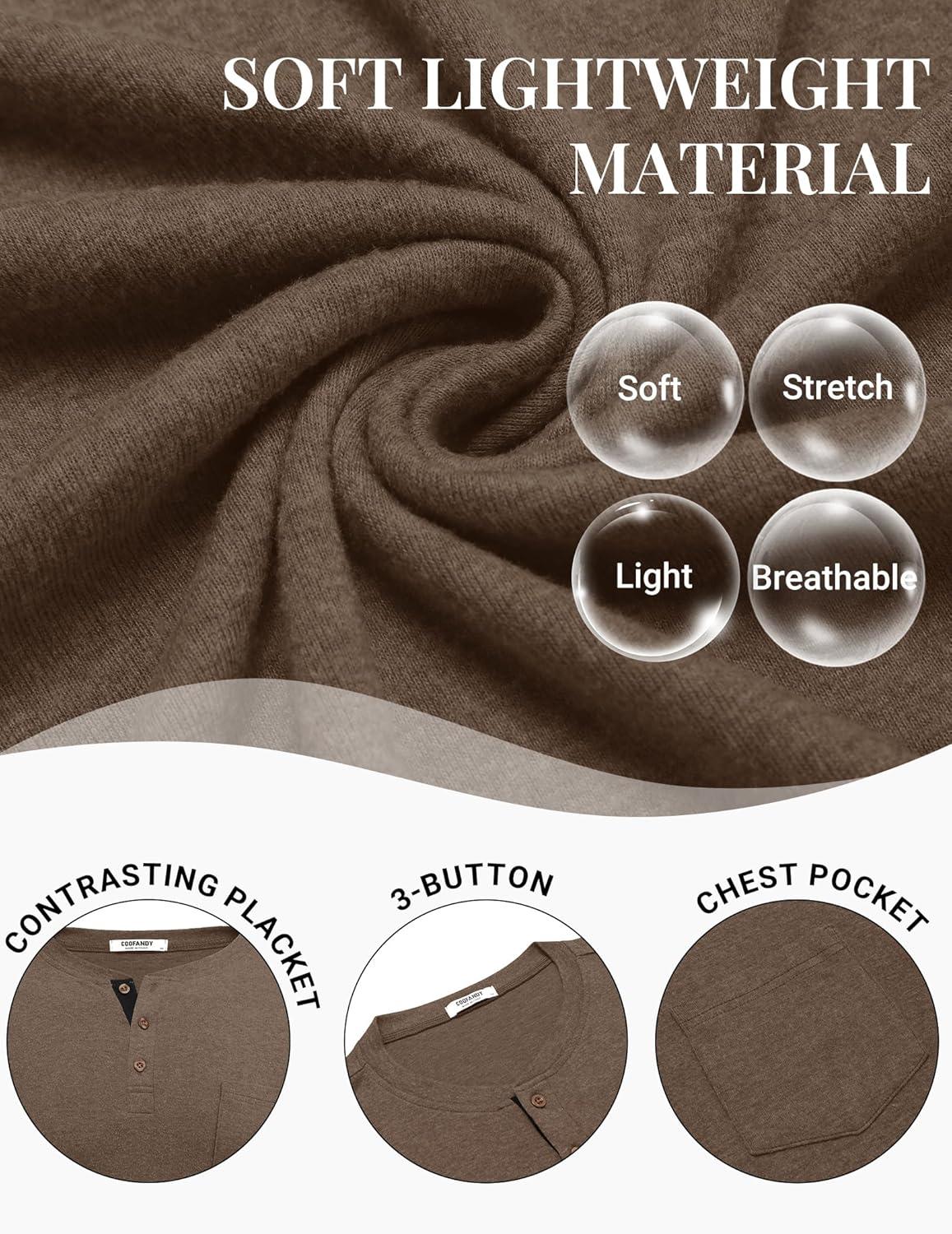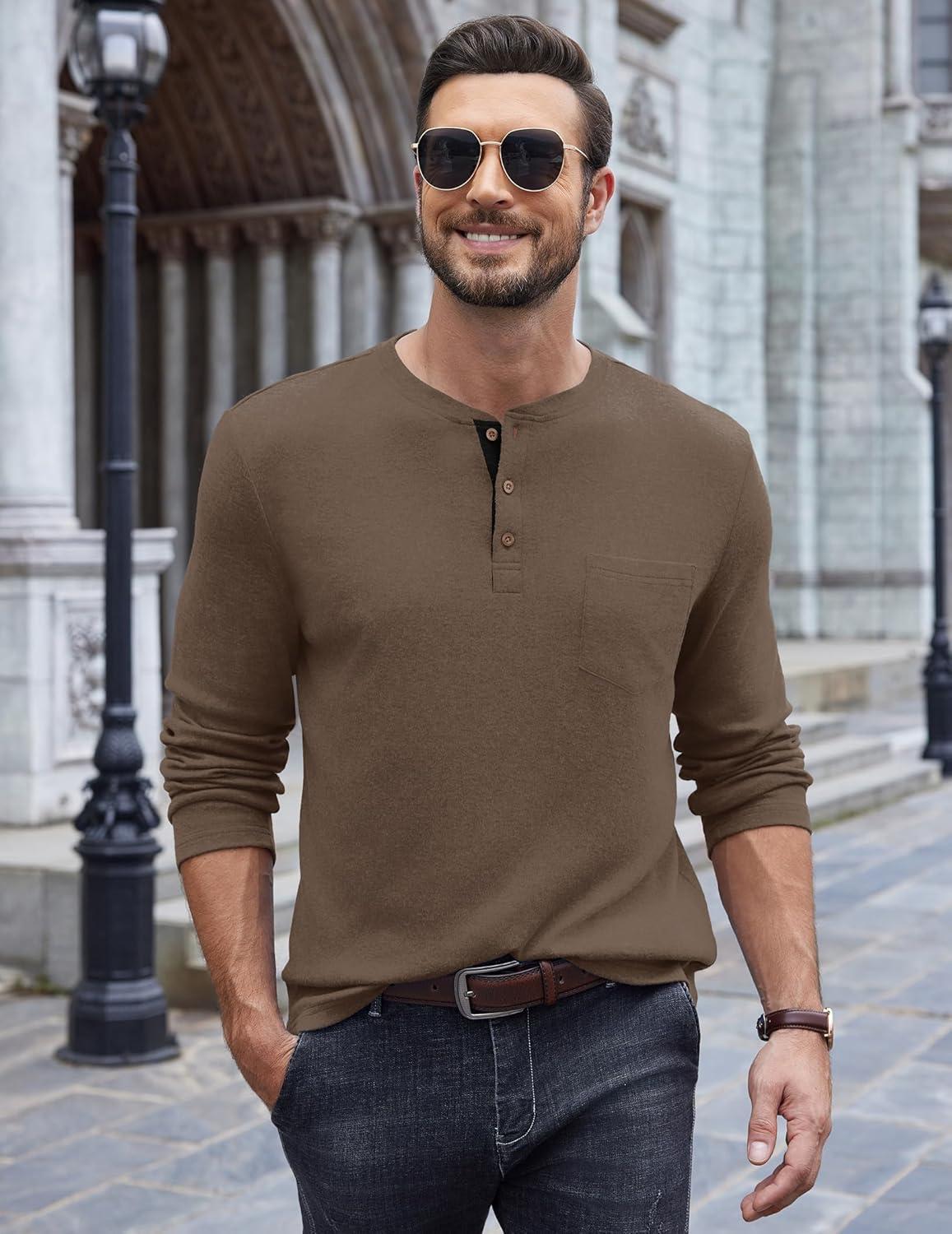 COOFANDY Men Long Sleeve Henley Shirs Casual Basic T Shirts Soild Button Tees with Pockets(Coffee)