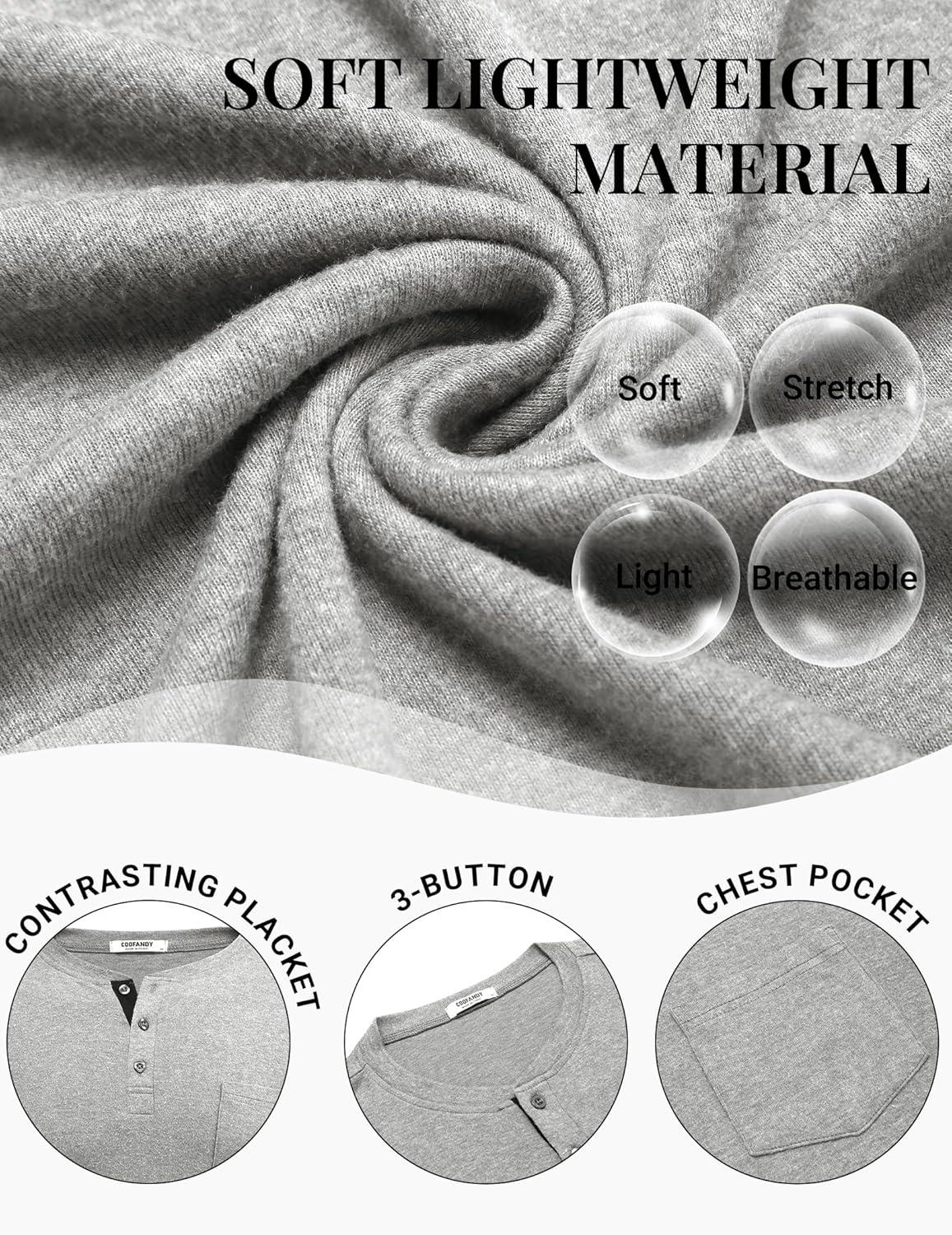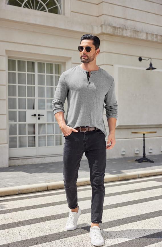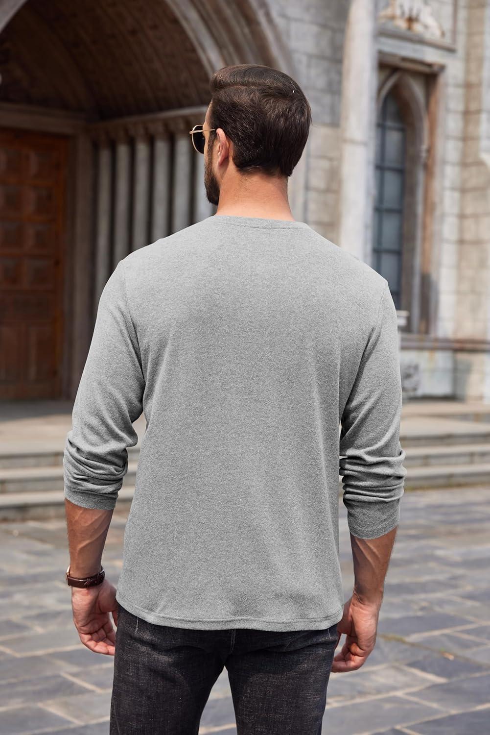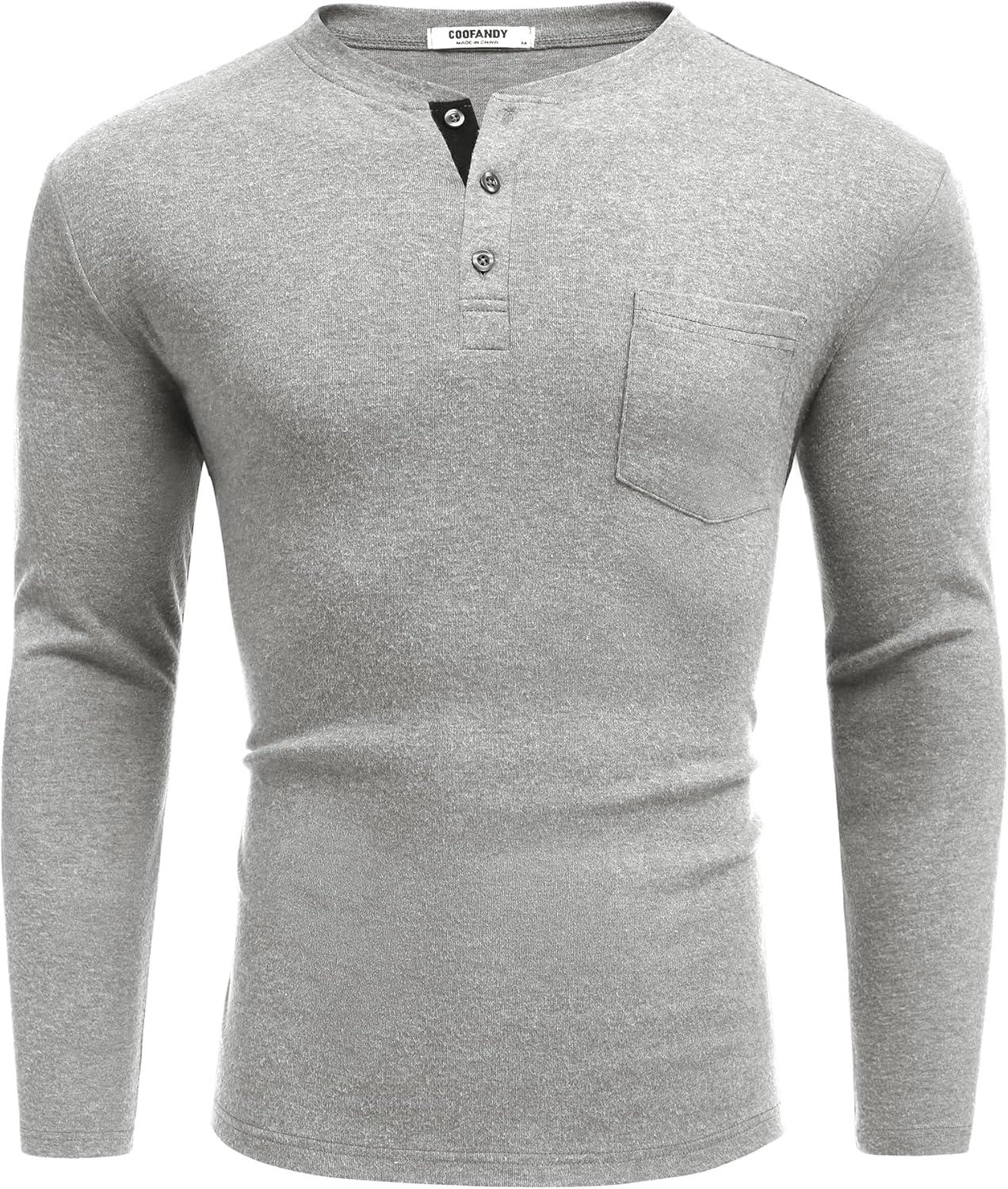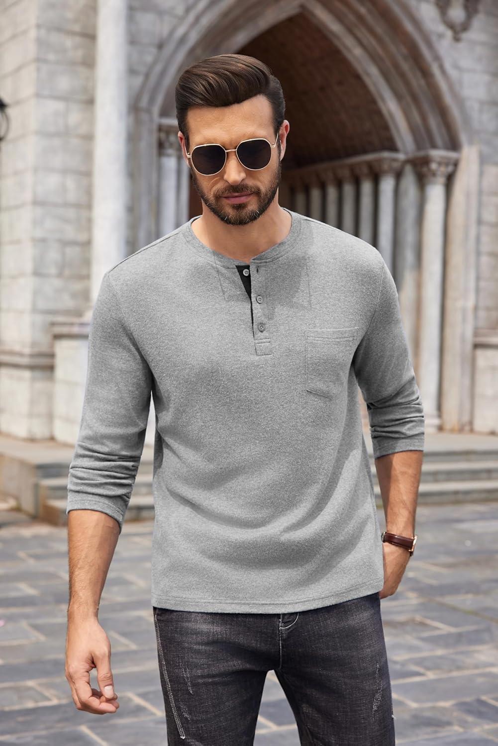 COOFANDY Men Long Sleeve Henley Shirs Casual Basic T Shirts Soild Button Tees with Pockets(Light Gray)
