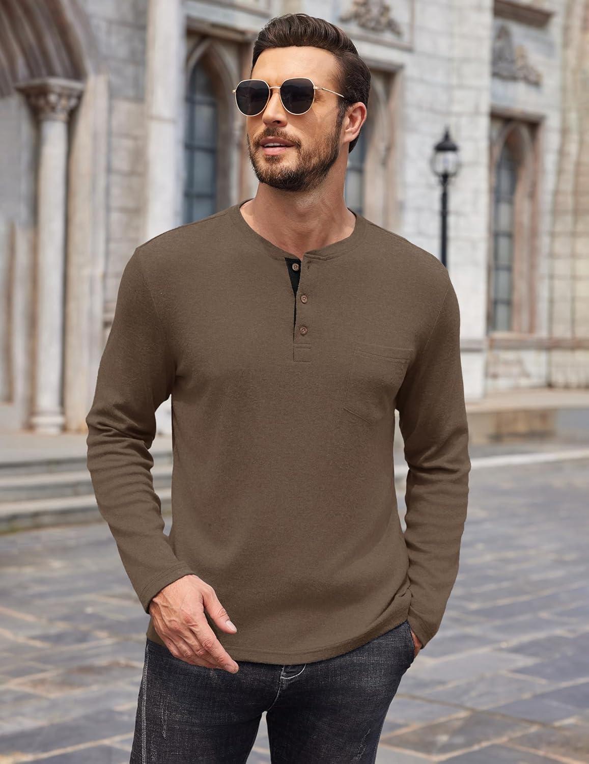 COOFANDY Men Long Sleeve Henley T-Shirs Casual Basic Lightweight Fashion Shirts Soild Tees with Pockets(Brown)
