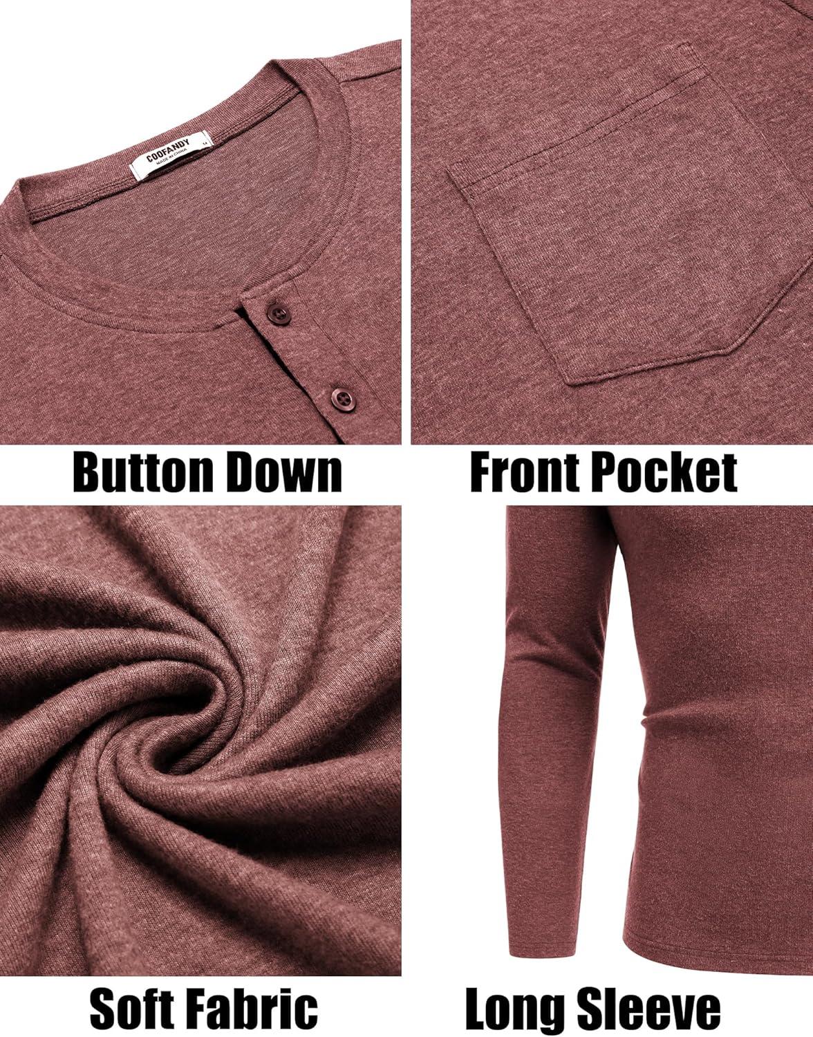COOFANDY Men Long Sleeve Henley T-Shirs Casual Basic Lightweight Fashion Shirts Soild Tees with Pockets(Purple Red)