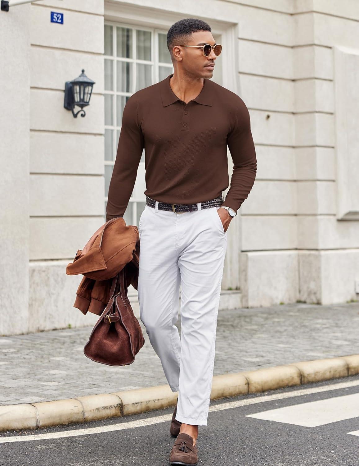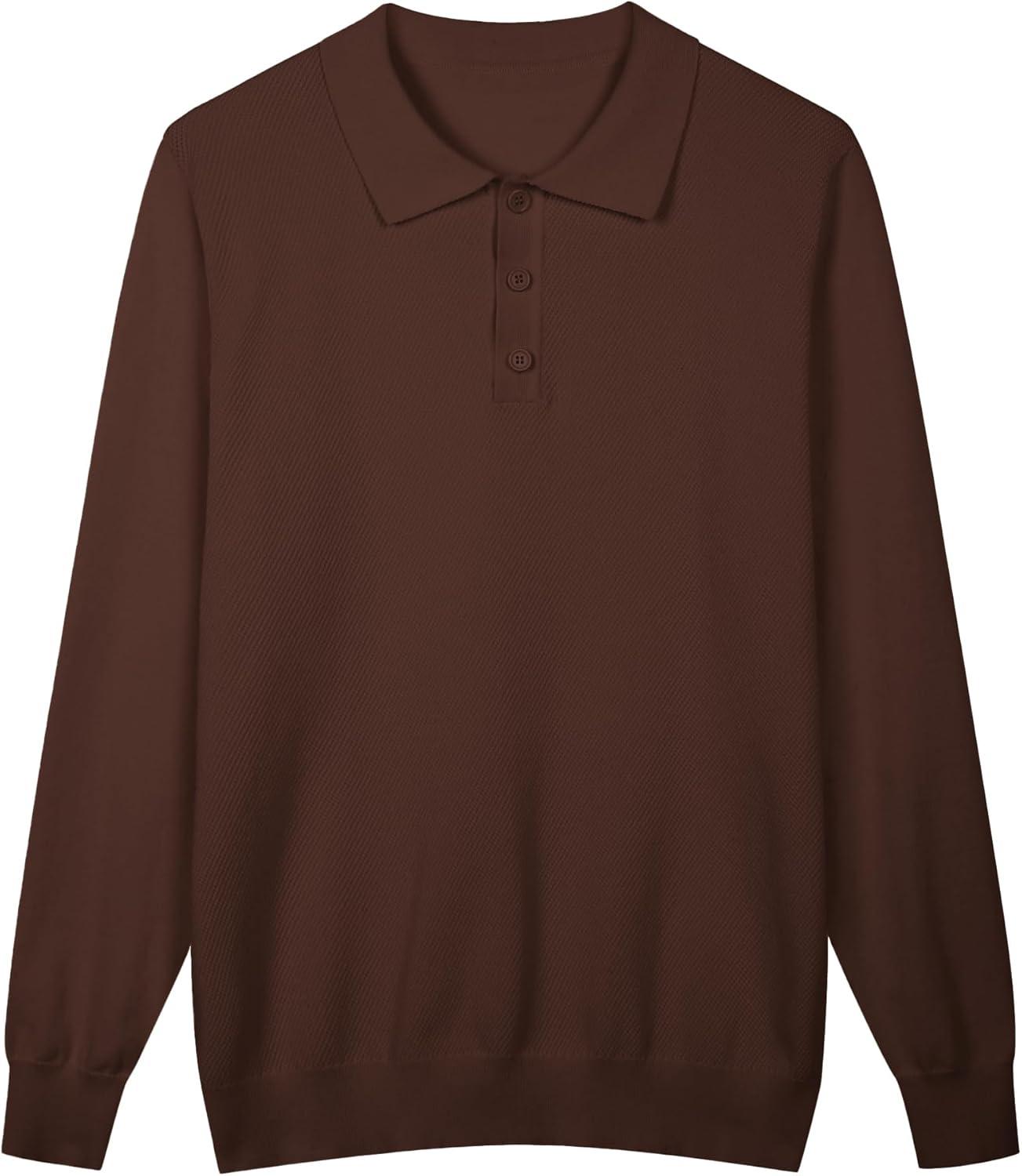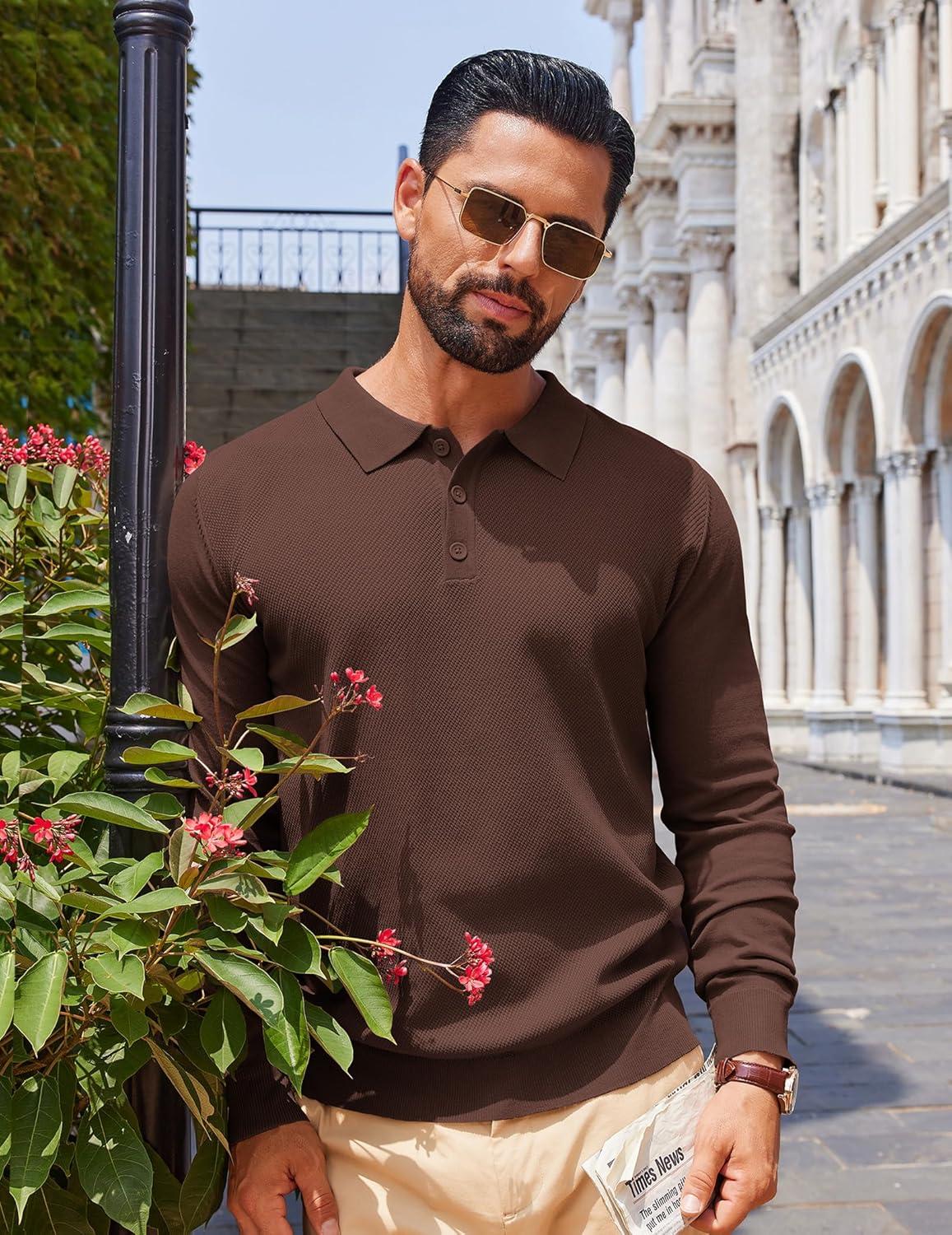 COOFANDY Men Long Sleeve Polo Sweater Knitted Polo Slim Fit Waffle Collared Pullover Sweater(Brown)