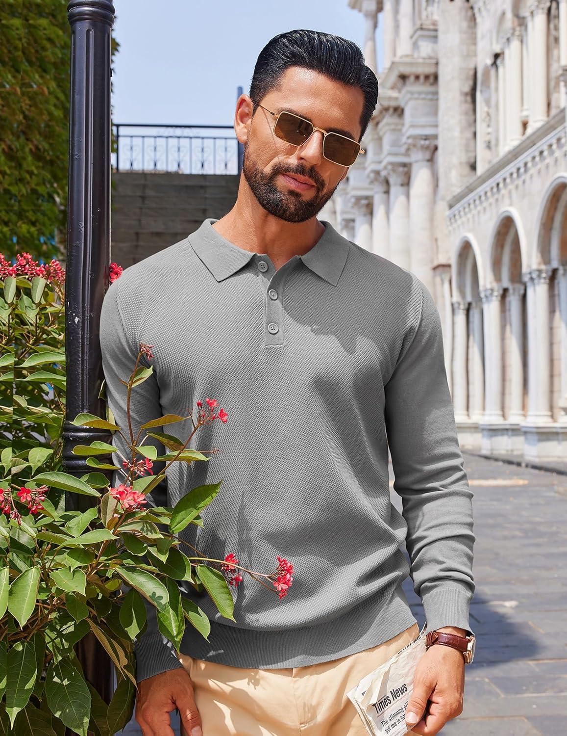 COOFANDY Men Long Sleeve Polo Sweater Knitted Polo Slim Fit Waffle Collared Pullover Sweater(Grey)