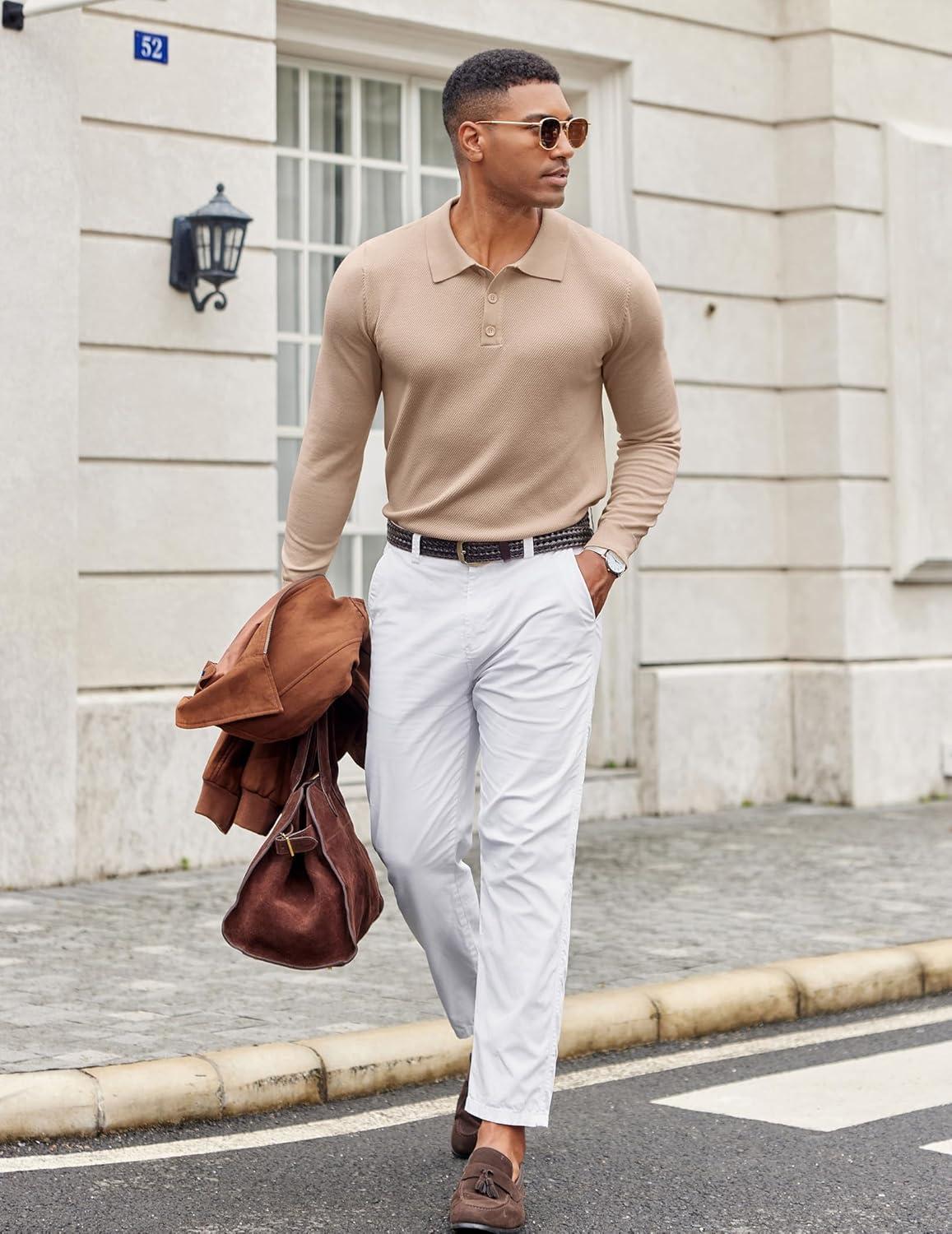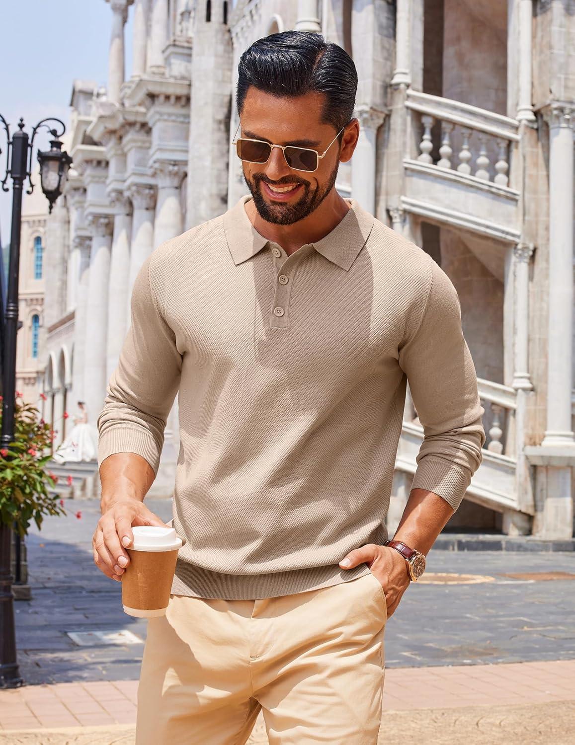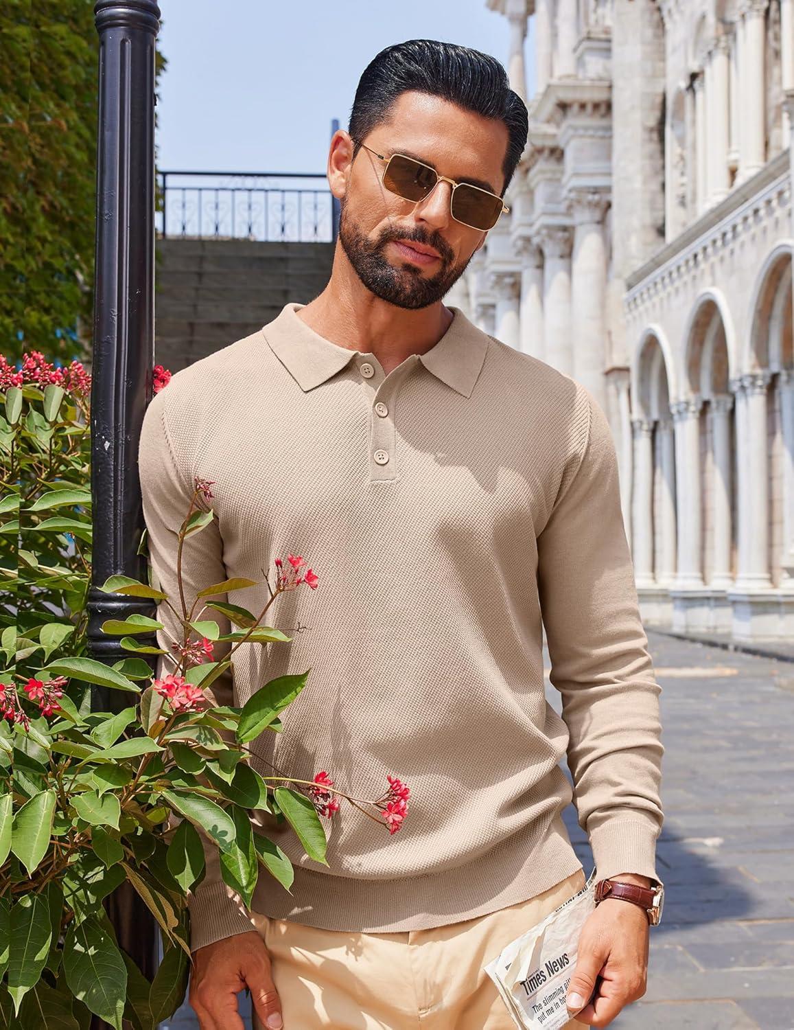 COOFANDY Men Long Sleeve Polo Sweater Knitted Polo Slim Fit Waffle Collared Pullover Sweater(Khaki)