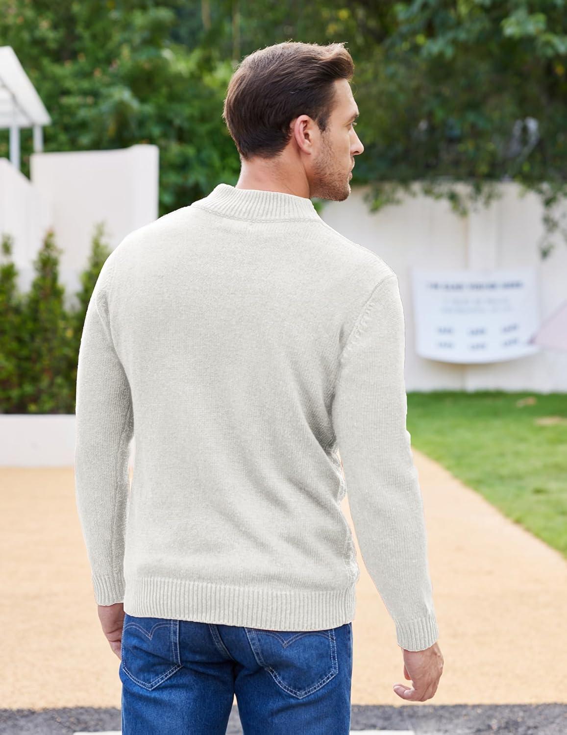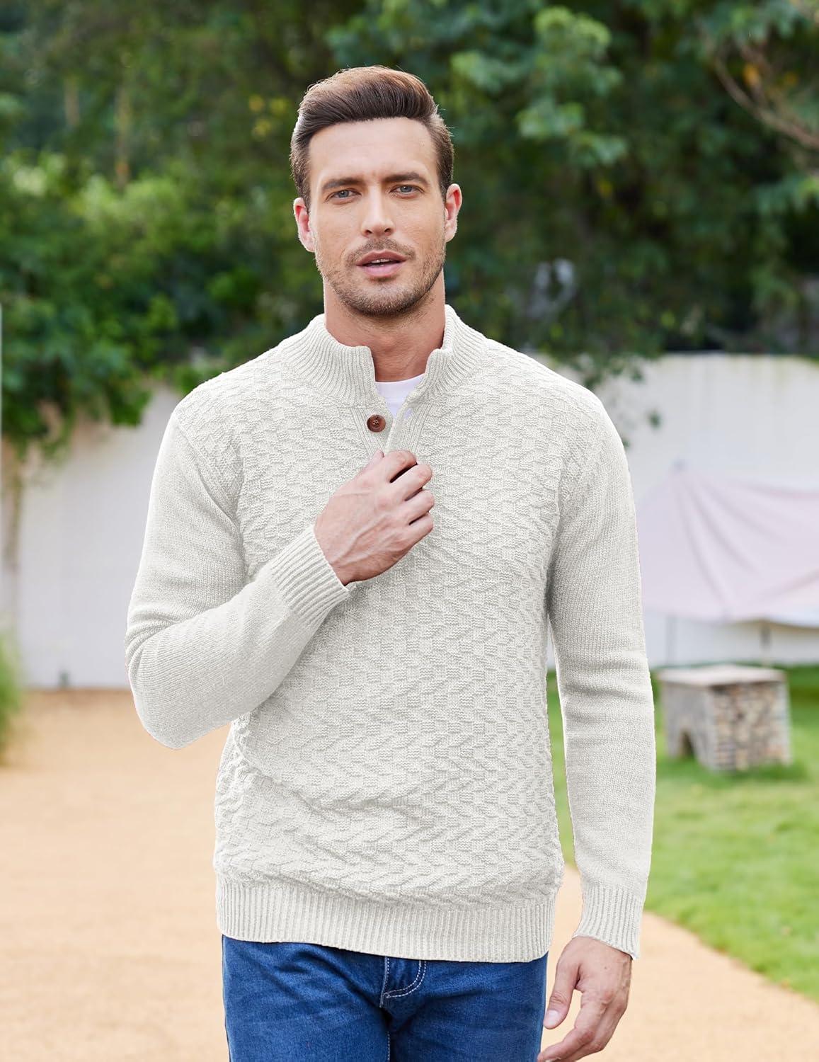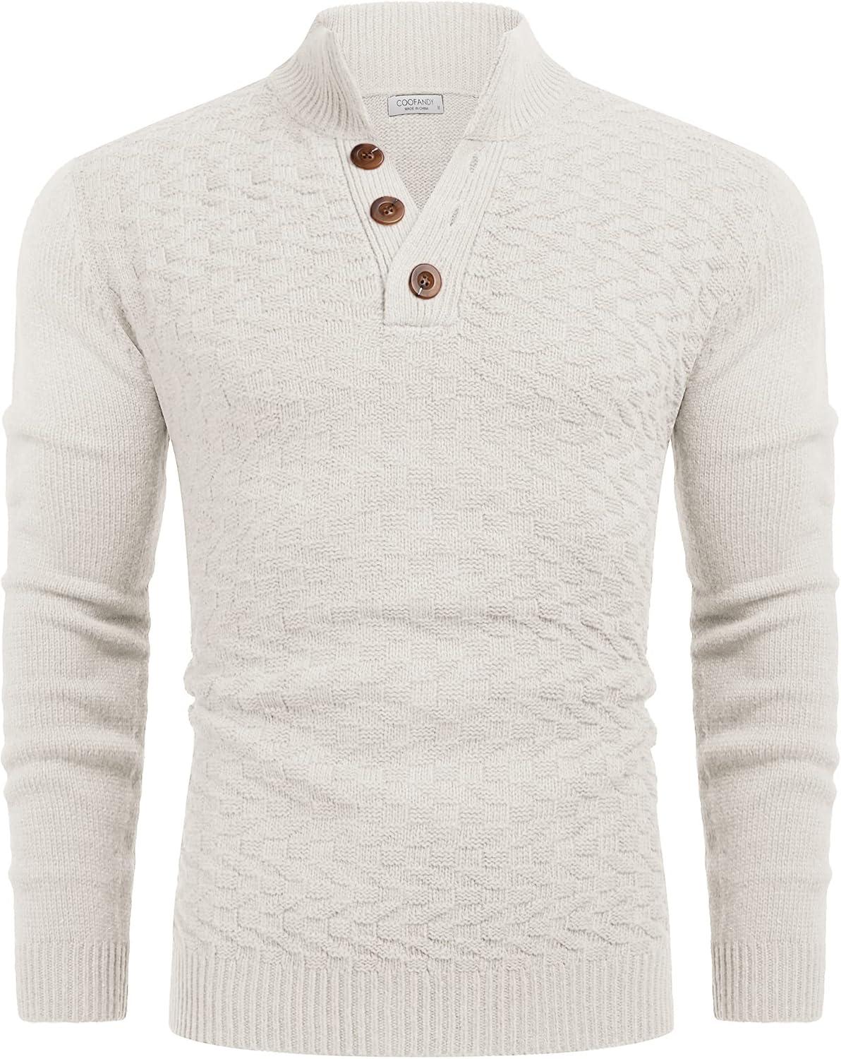 COOFANDY Men Mock Neck Button Sweater Casual Knitted Sweaters Fashion Henley Sweater(White)