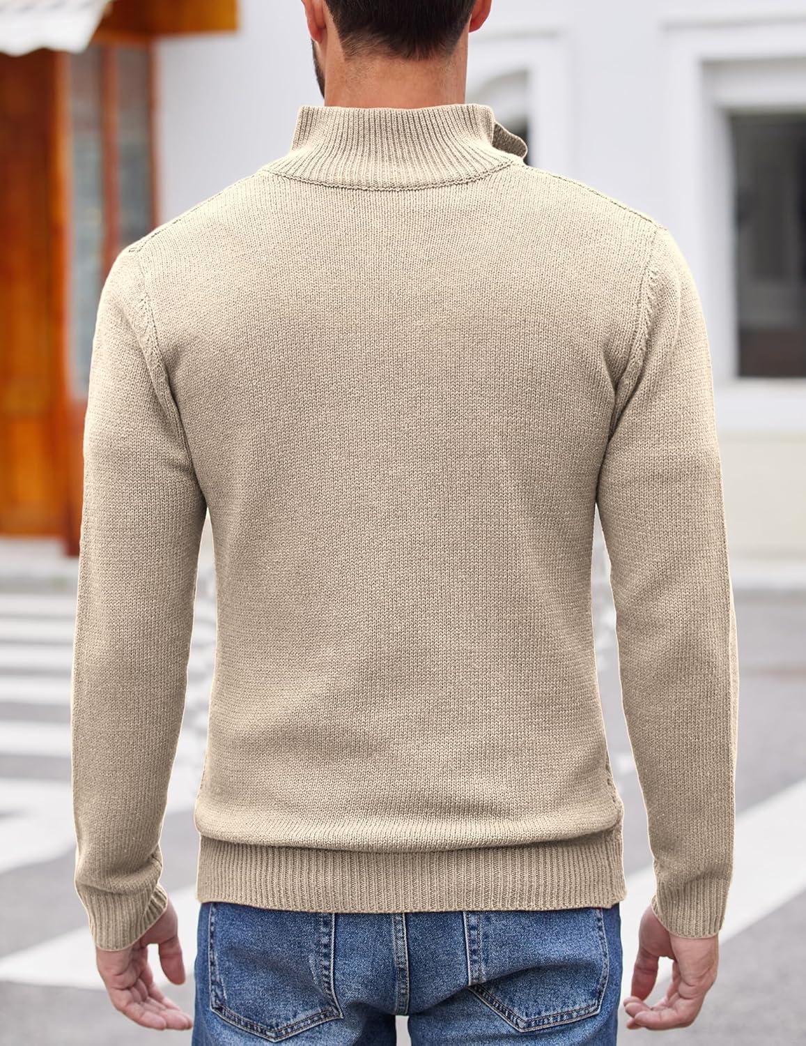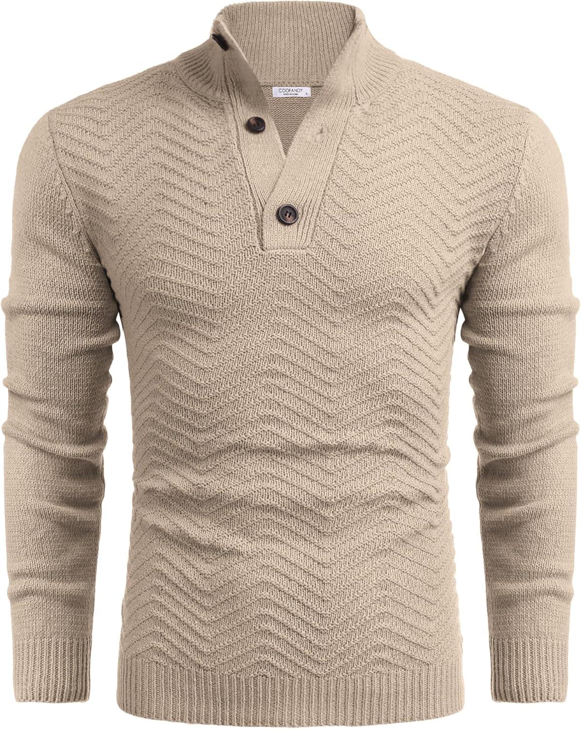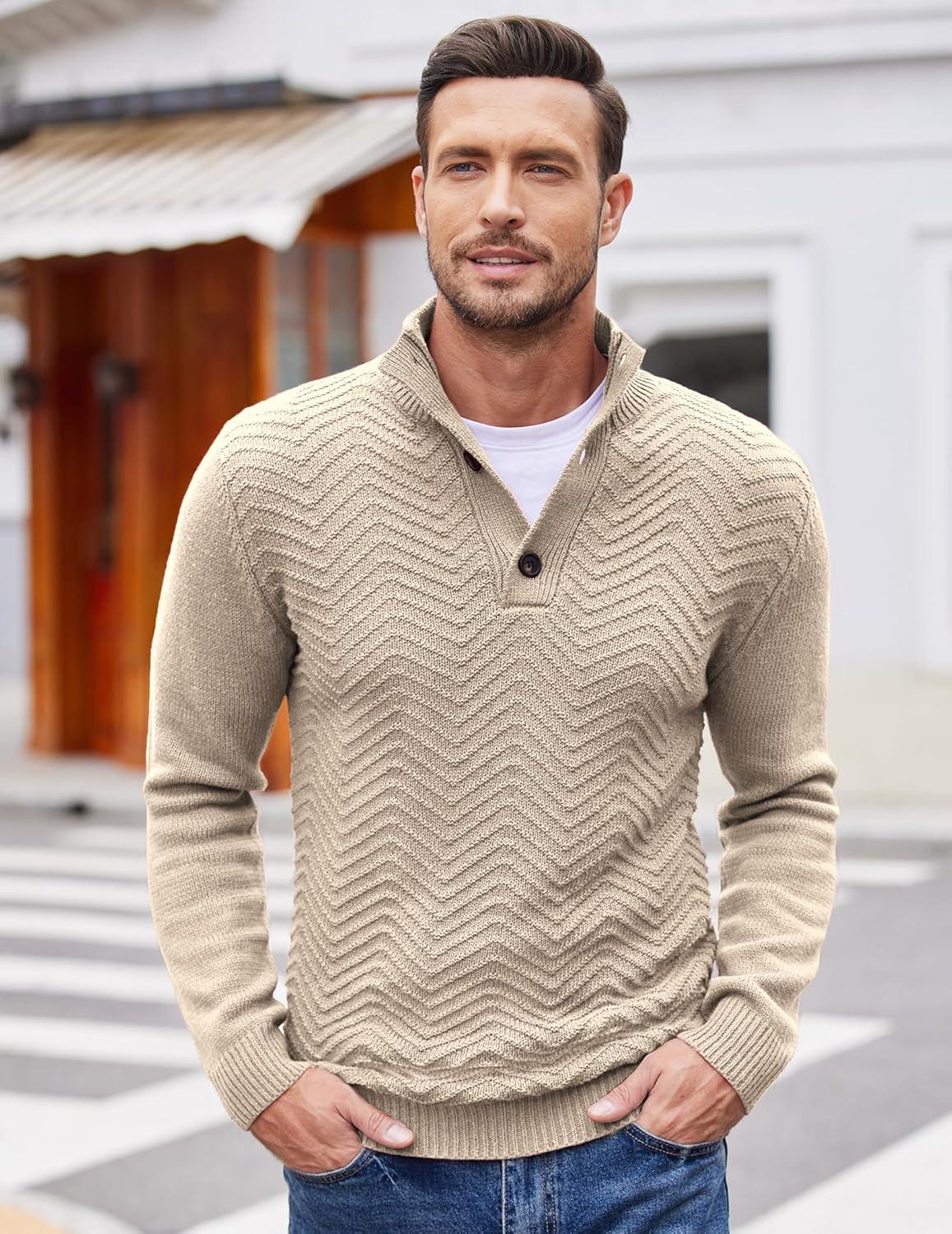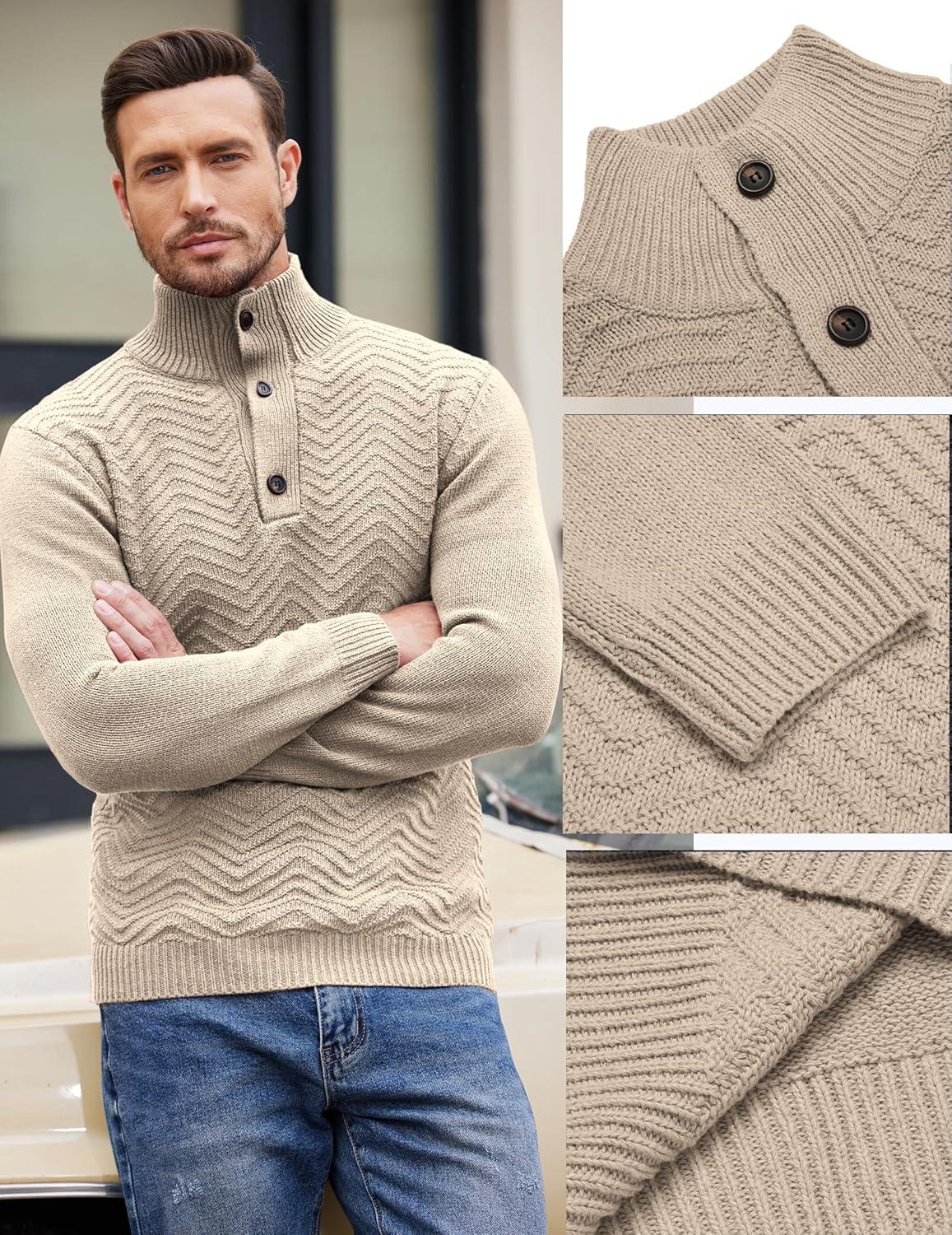 COOFANDY Men Quarter Button Sweater Pullover Cable Knit Henley Mock Neck Sweater(Beige)