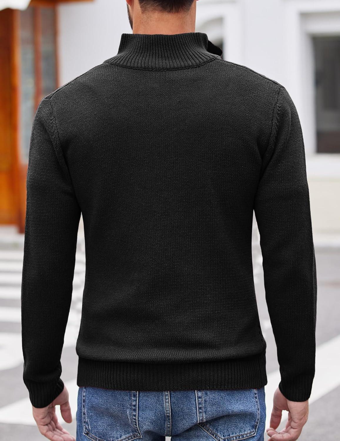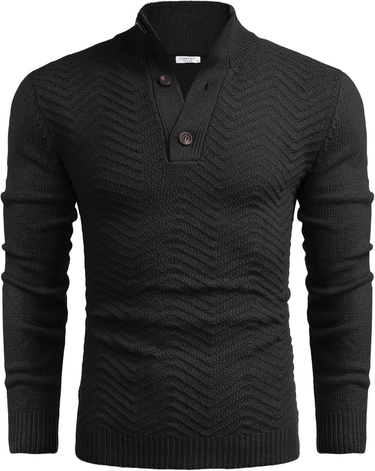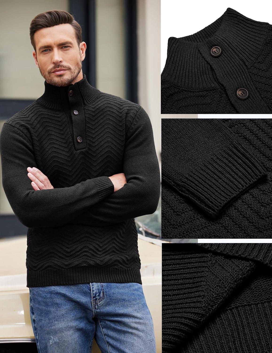 COOFANDY Men Quarter Button Sweater Pullover Cable Knit Henley Mock Neck Sweater(Black)