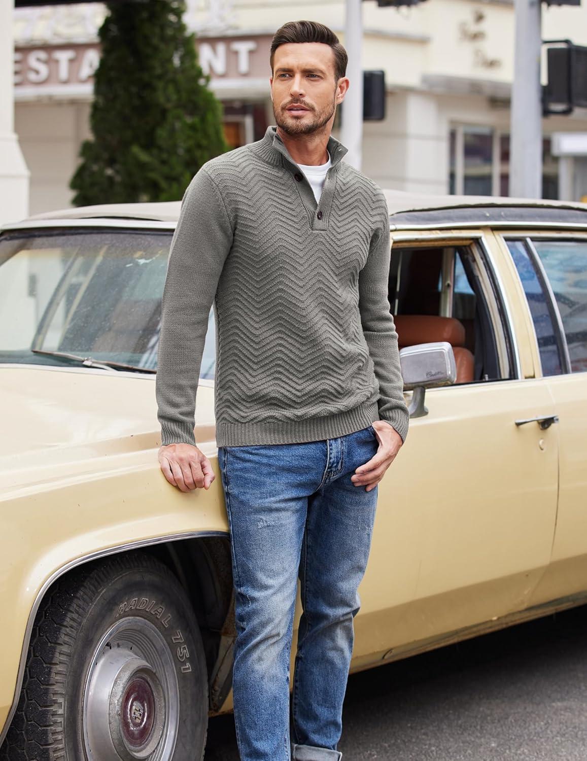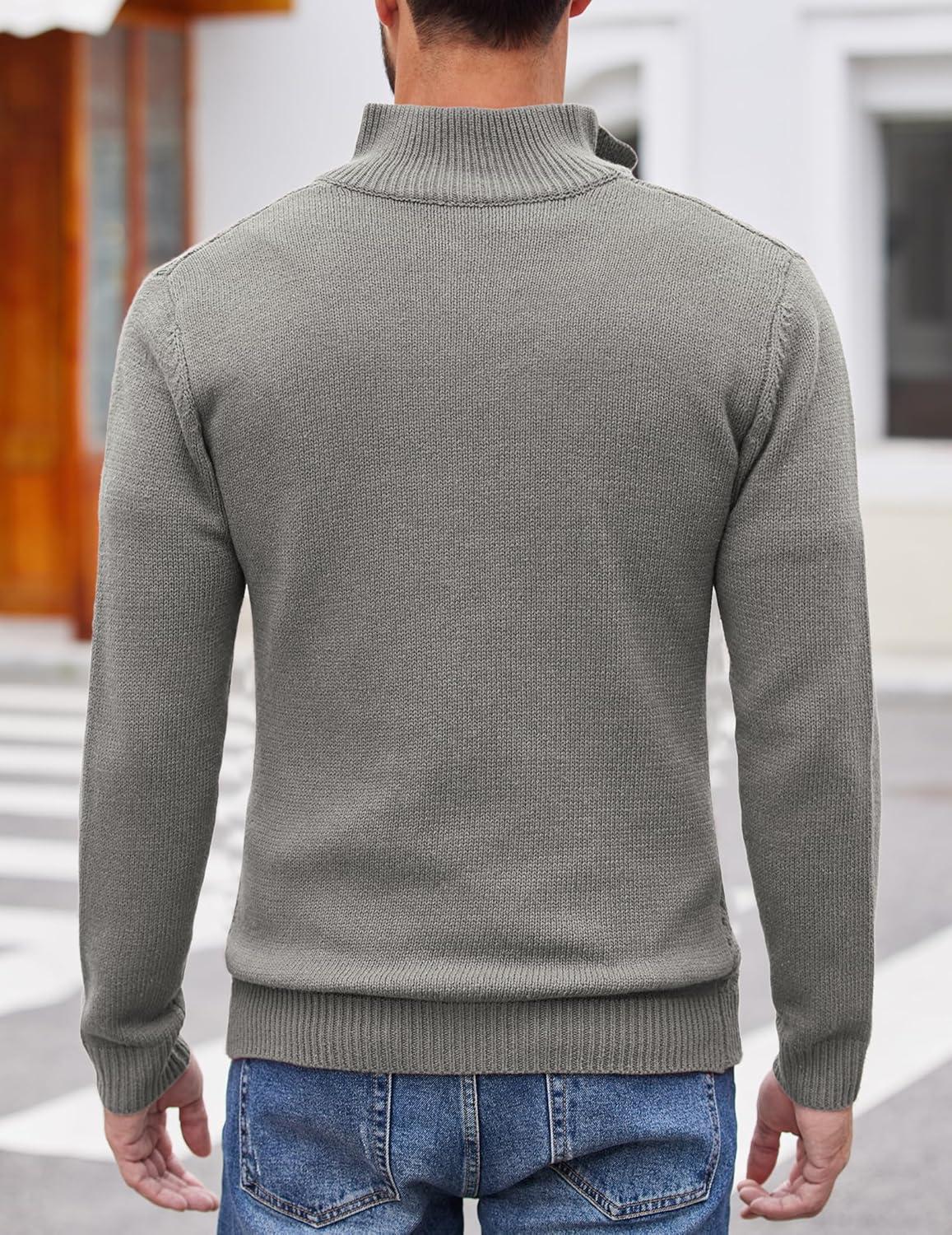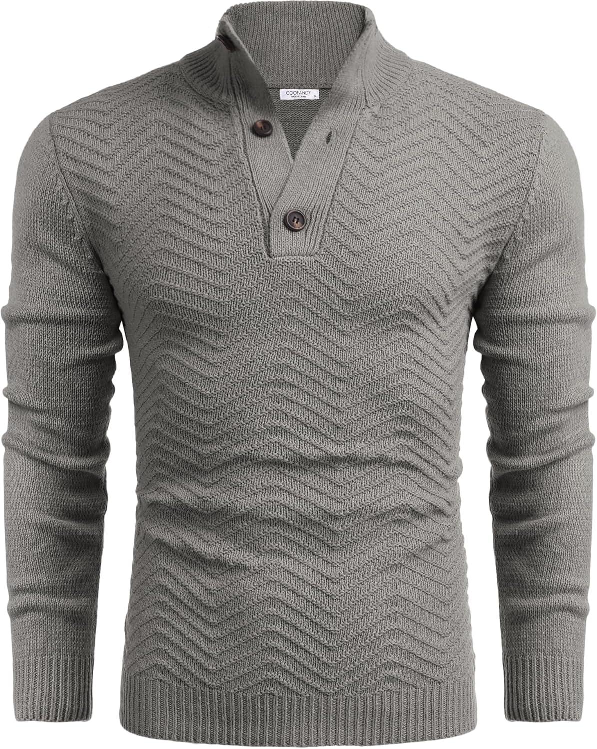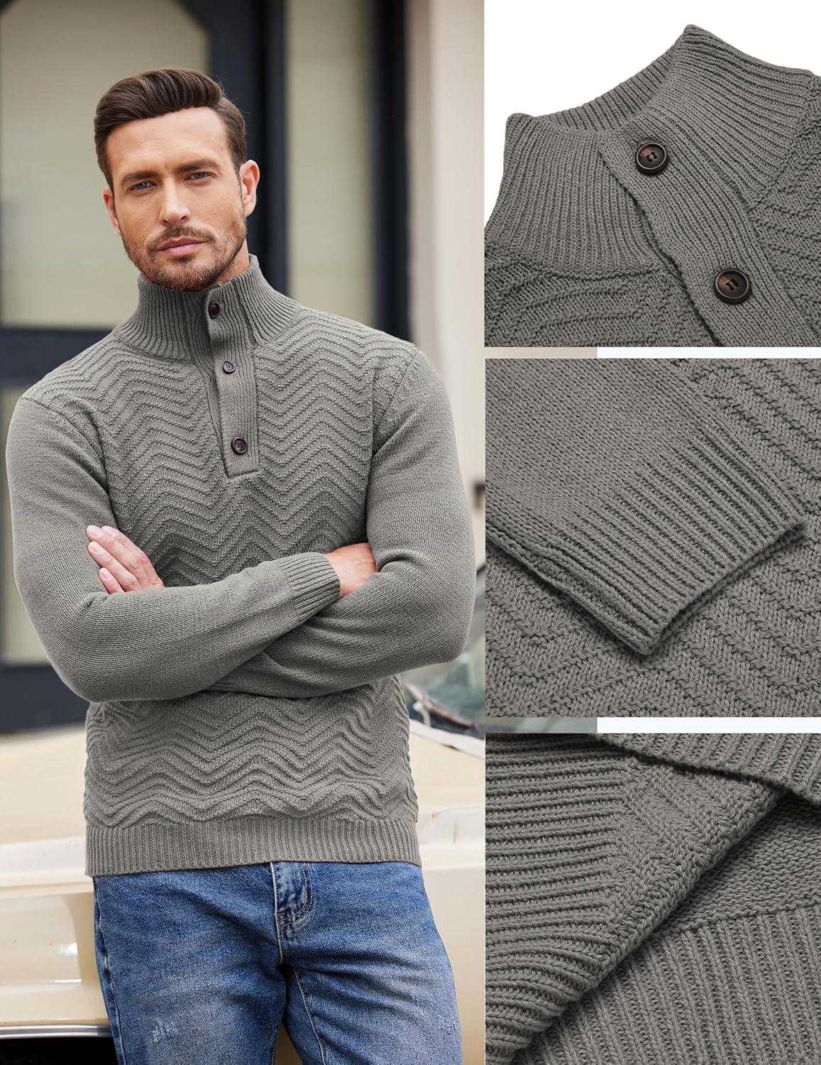 COOFANDY Men Quarter Button Sweater Pullover Cable Knit Henley Mock Neck Sweater(Grey)