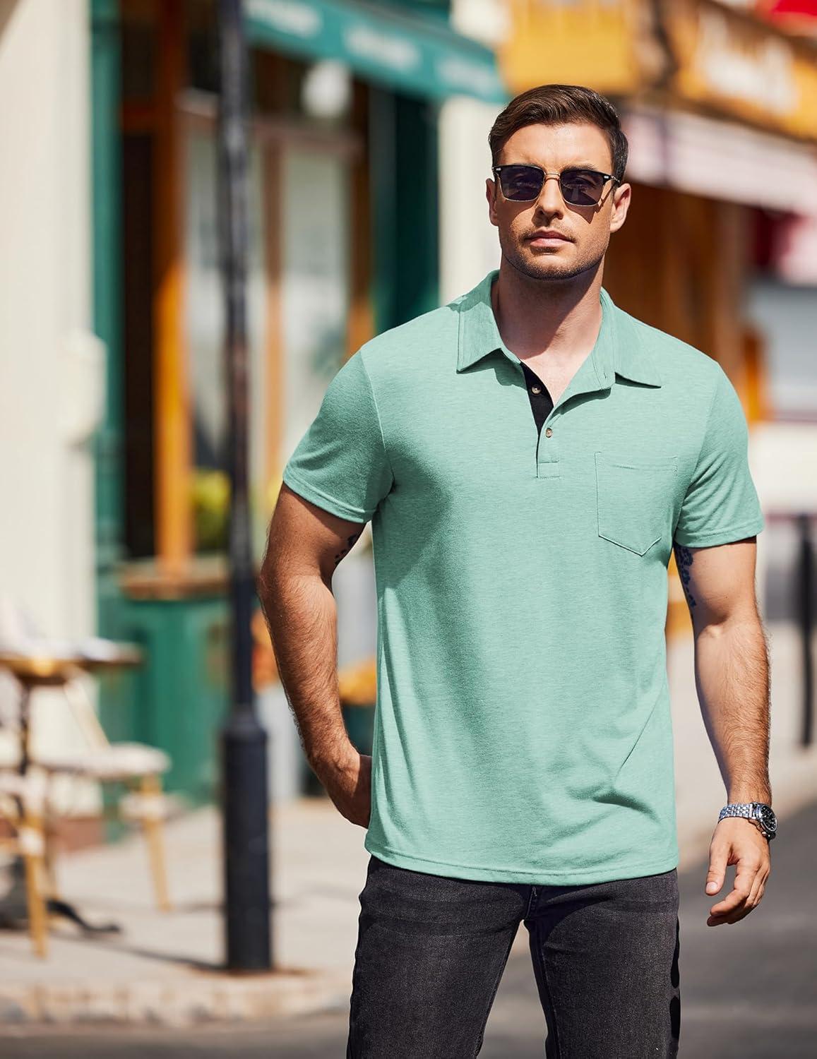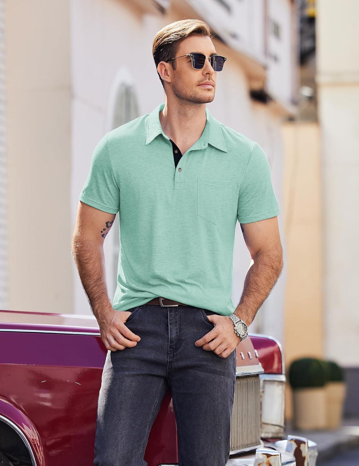 COOFANDY Men Short Sleeve Polo Shirt Casual Summer Collar Shirts Dress Button Polo T Shirt Classic Golf Shirts(Light Green)