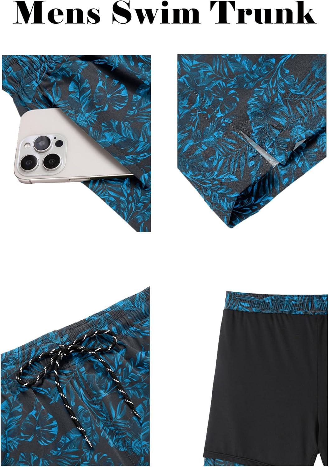 COOFANDY Men Swim Trunk with Compression Liner 2 in 1 Swimwear Bathing Suit Quick Dry Board Short(P Light Blue Leaves)