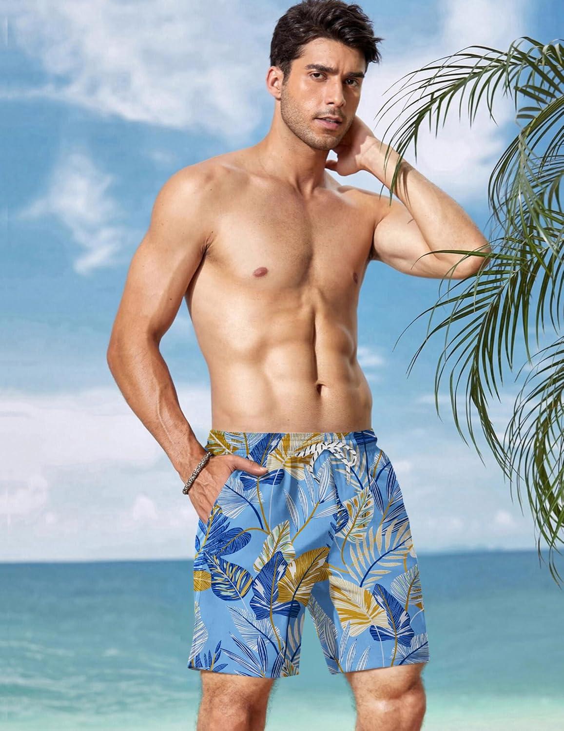 imageCOOFANDY Men Swim Trunk with Compression Liner 2 in 1 Swimwear Bathing Suit Quick Dry Board ShortP Light Blue Leaves