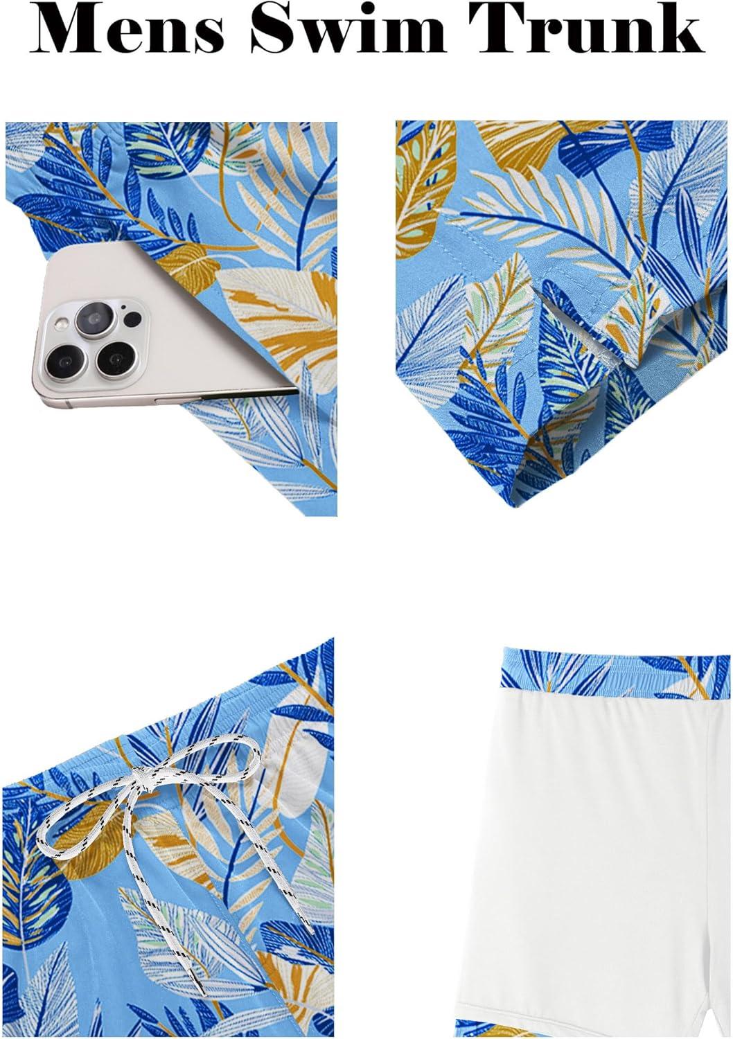 COOFANDY Men Swim Trunk with Compression Liner 2 in 1 Swimwear Bathing Suit Quick Dry Board Short(P Light Blue Leaves)