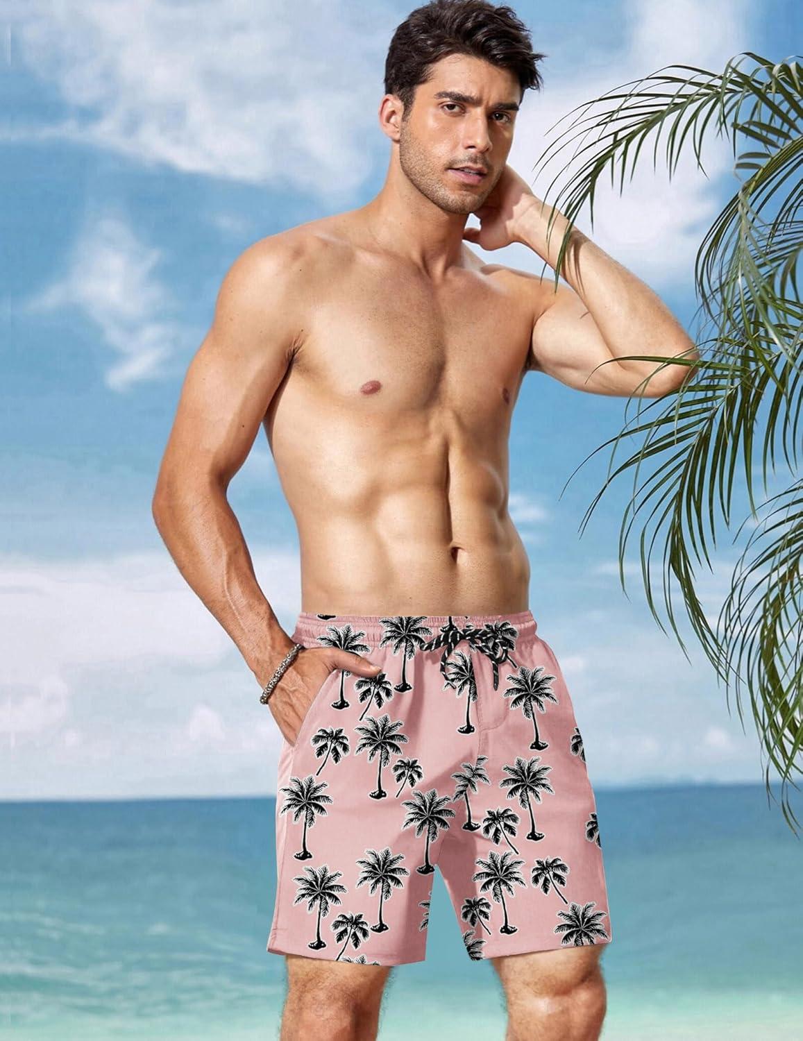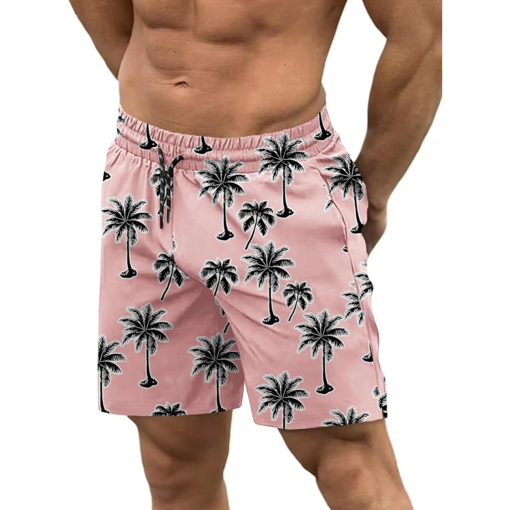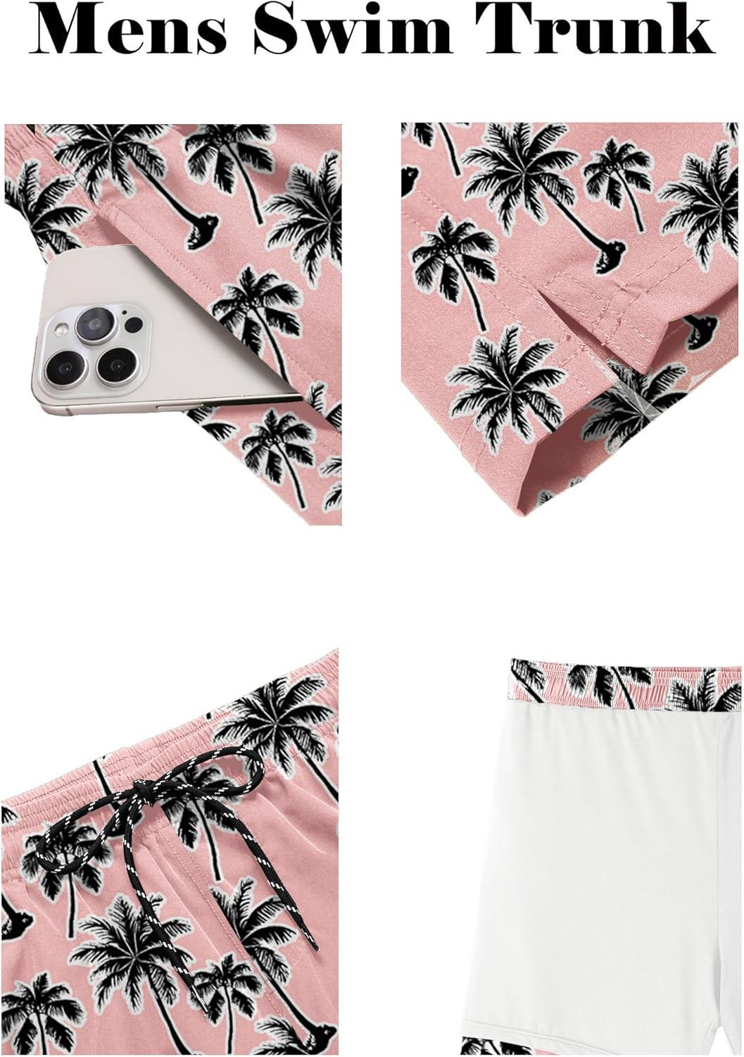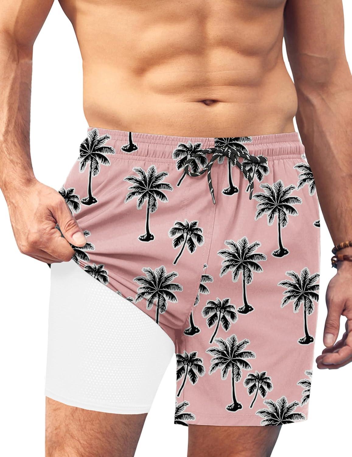 imageCOOFANDY Men Swim Trunk with Compression Liner 2 in 1 Swimwear Bathing Suit Quick Dry Board ShortP Pink Coconut Tree