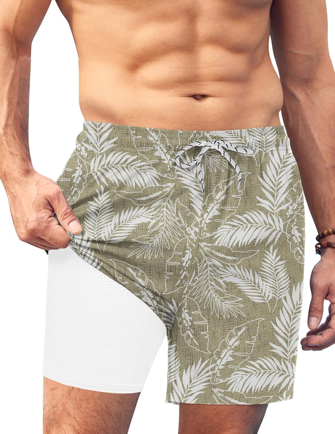 COOFANDY Men Swim Trunk with Compression Liner 2 in 1 Swimwear Bathing Suit Quick Dry Board Short(P Plam Leaf)