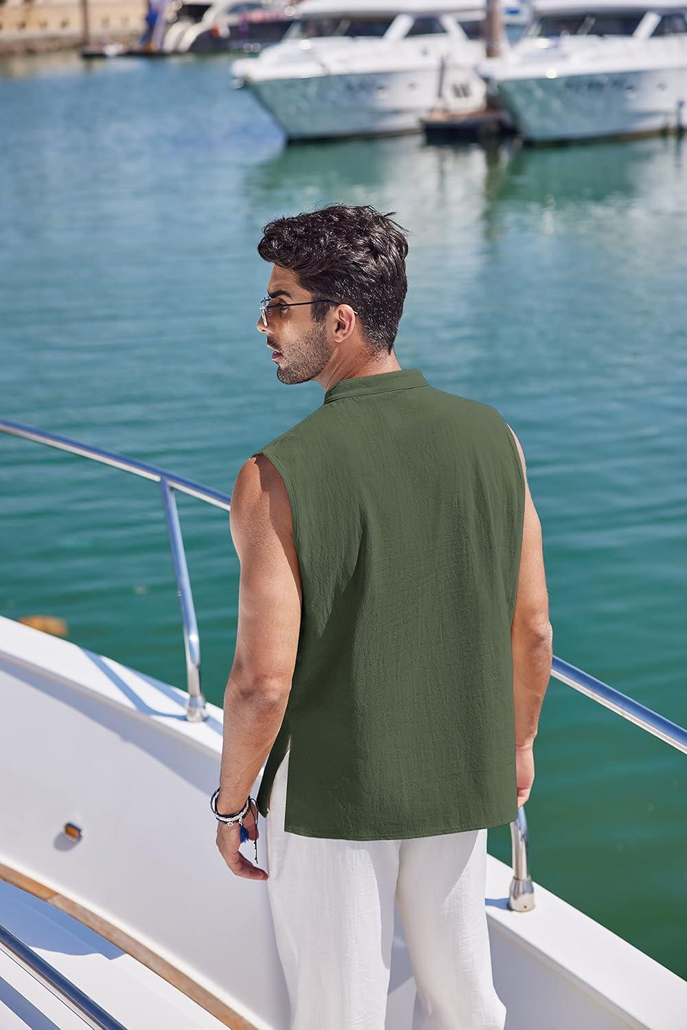COOFANDY Men Tank Top Cotton Linen Beach Sleeveless Shirt Lace Up Bohemian Hippie Renaissance Pirate Kilt Medieval Tunic(Army Green)