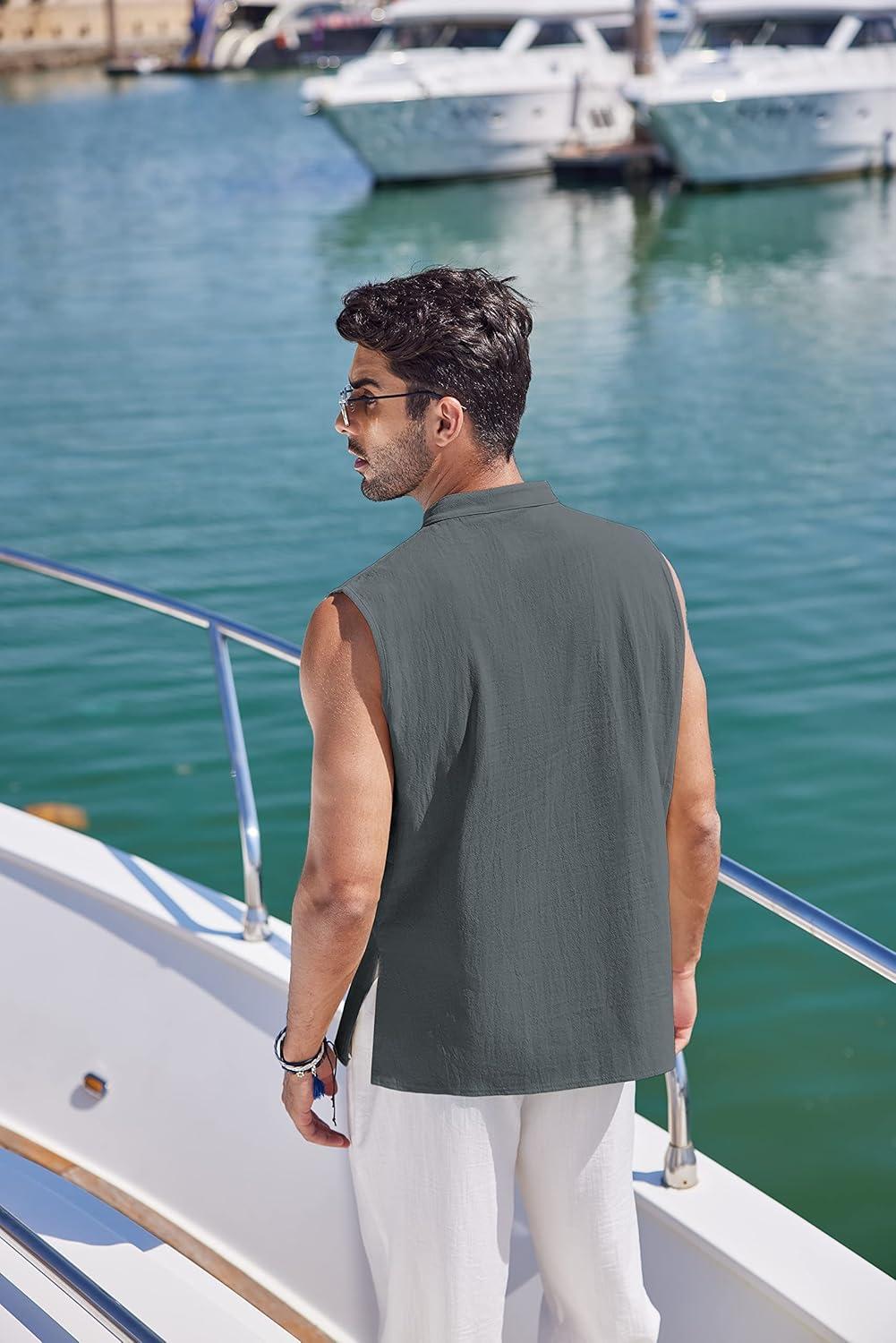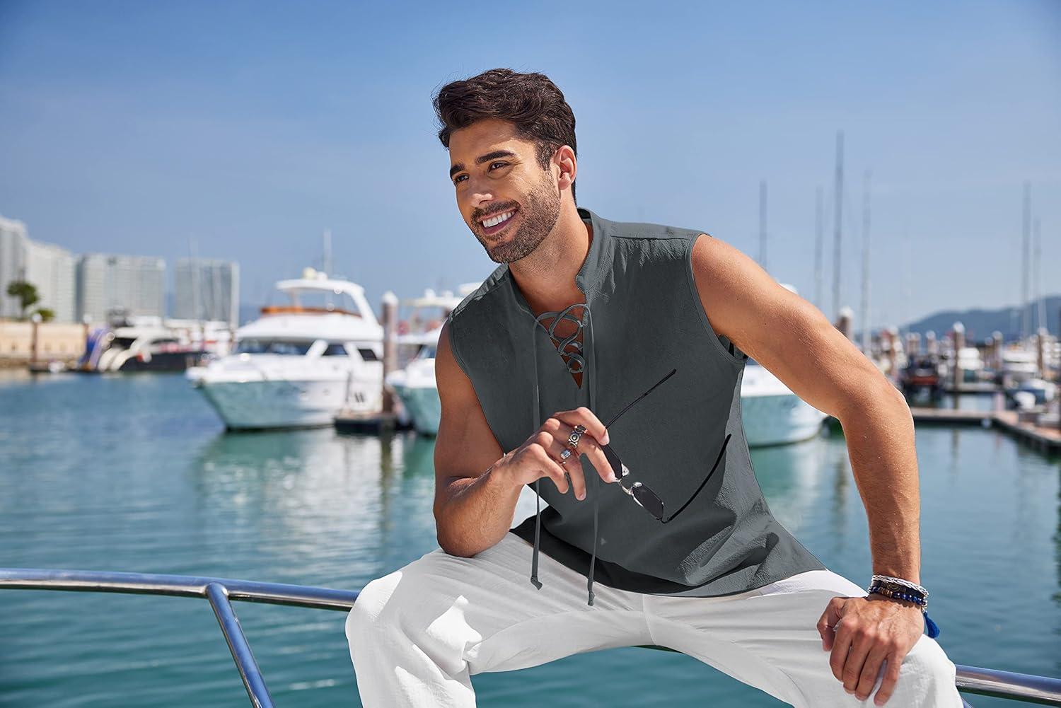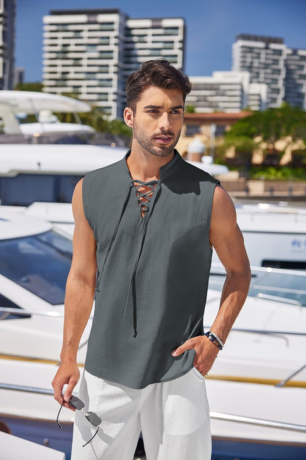 COOFANDY Men Tank Top Cotton Linen Beach Sleeveless Shirt Lace Up Bohemian Hippie Renaissance Pirate Kilt Medieval Tunic(Drak Gray)