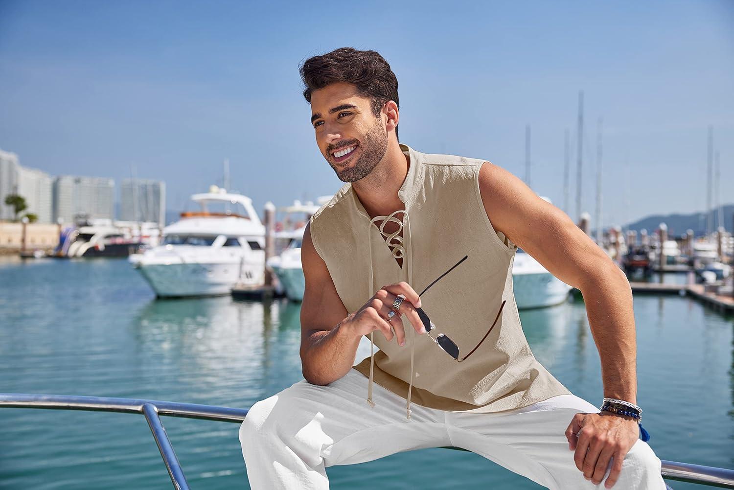 COOFANDY Men Tank Top Cotton Linen Beach Sleeveless Shirt Lace Up Bohemian Hippie Renaissance Pirate Kilt Medieval Tunic(Khaki)