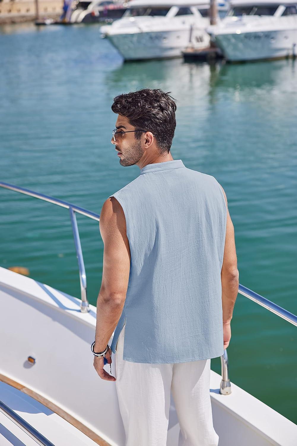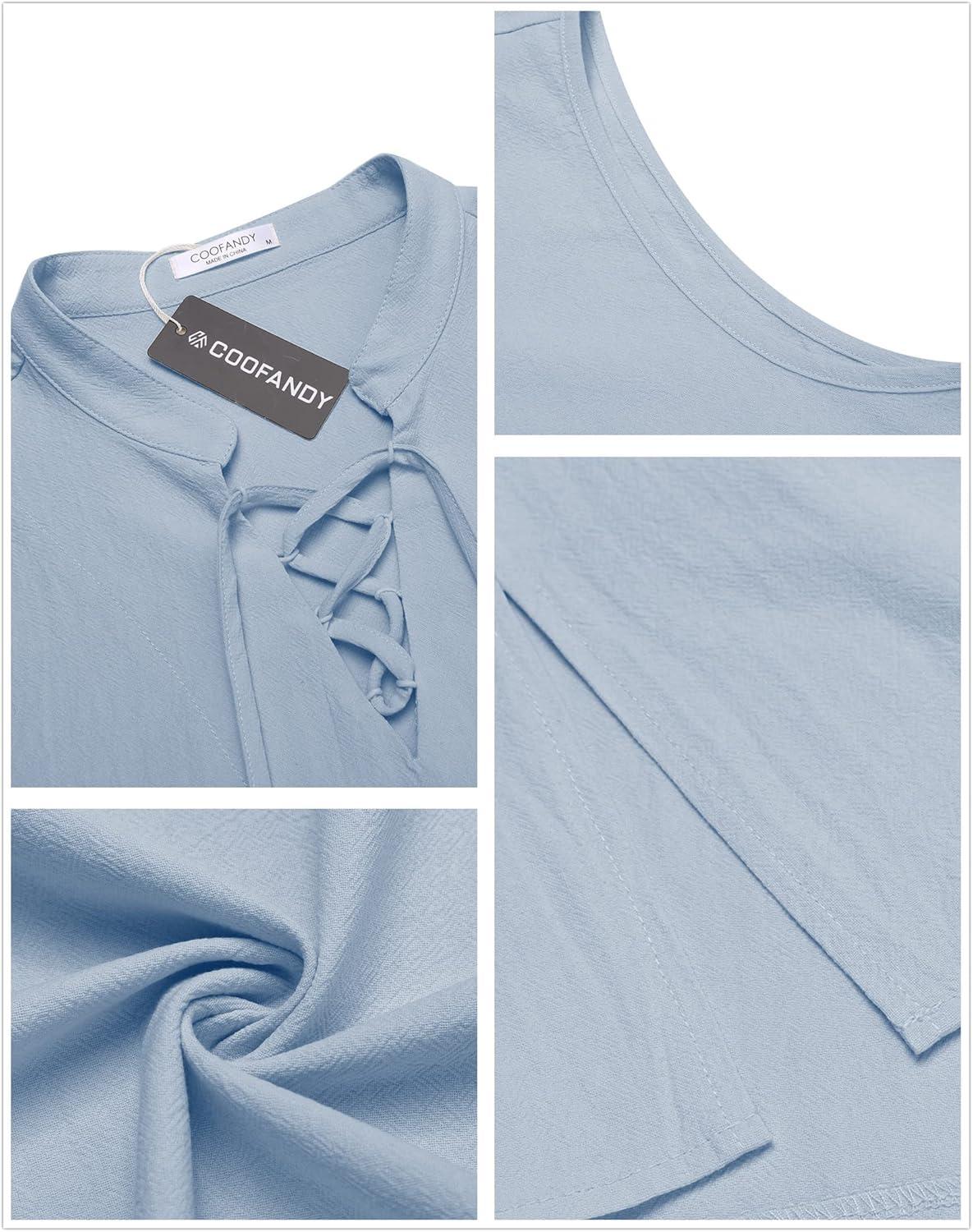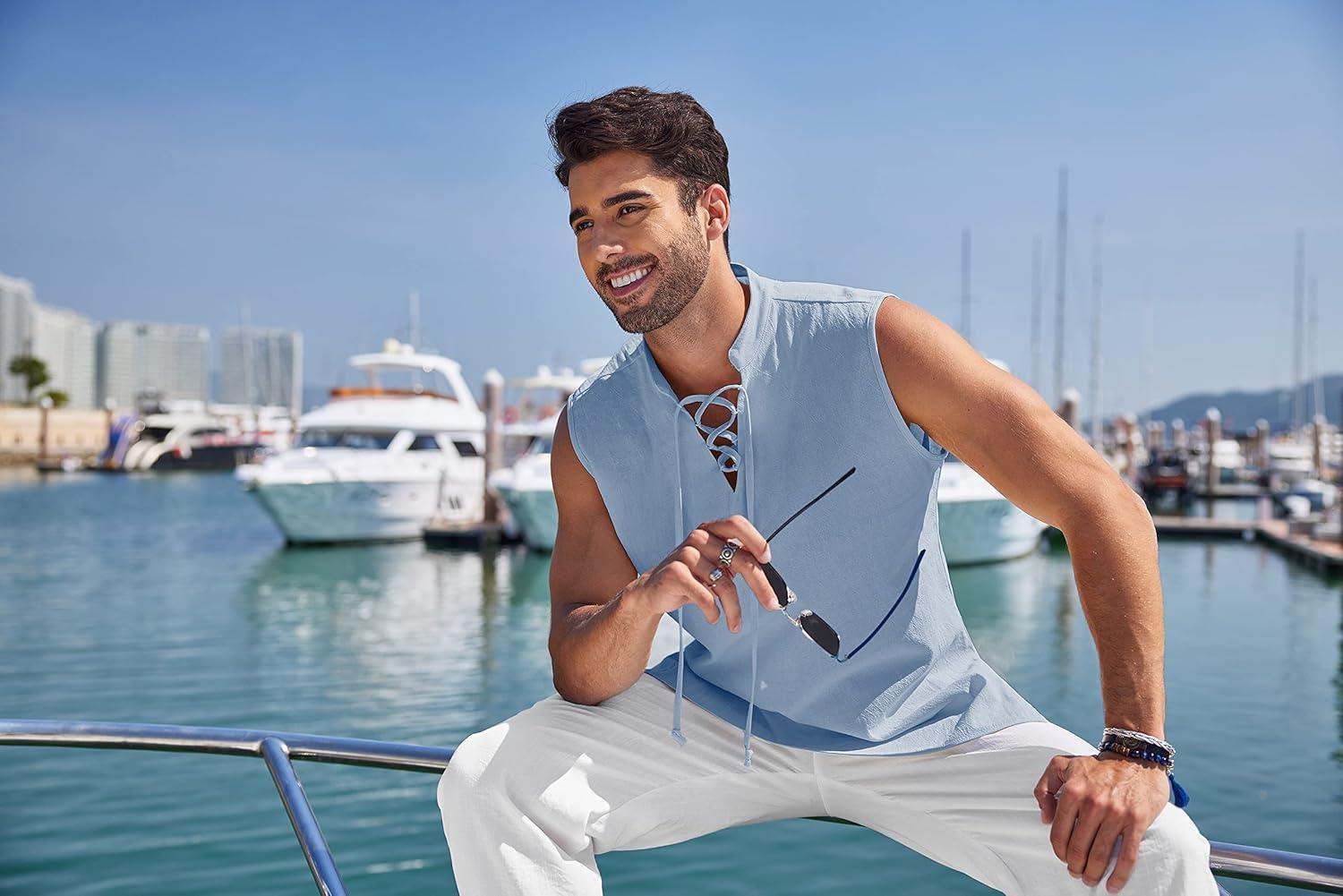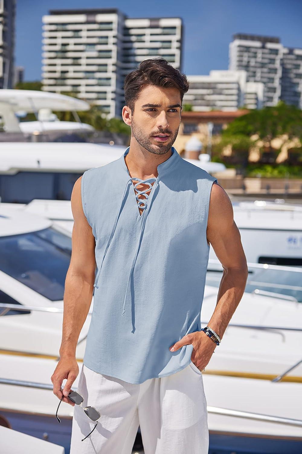 COOFANDY Men Tank Top Cotton Linen Beach Sleeveless Shirt Lace Up Bohemian Hippie Renaissance Pirate Kilt Medieval Tunic(Sky Blue)