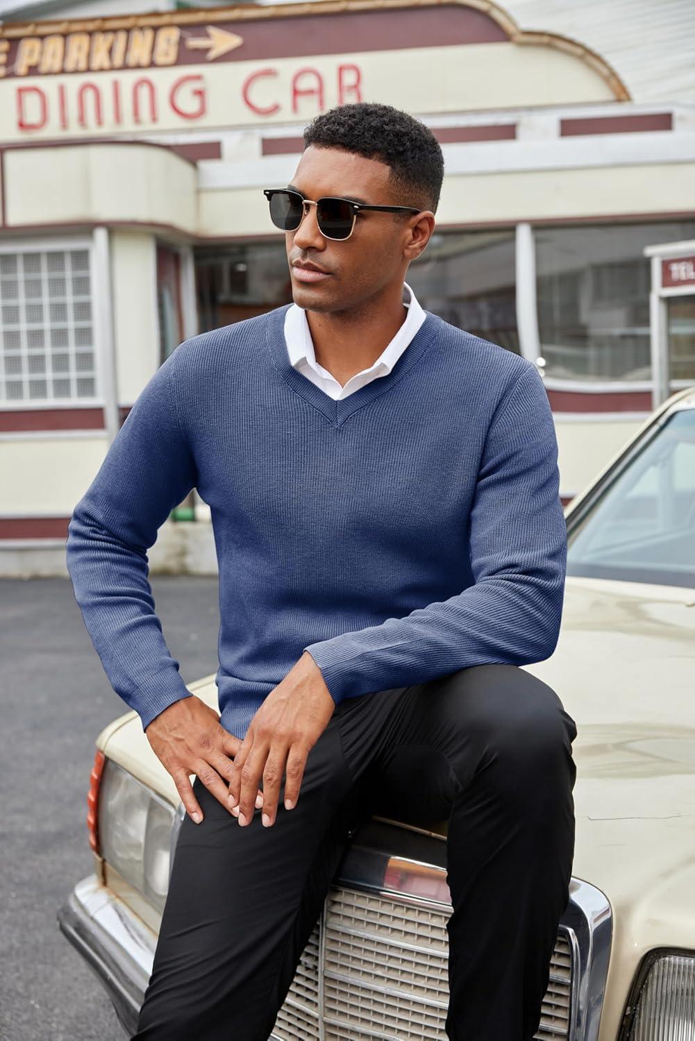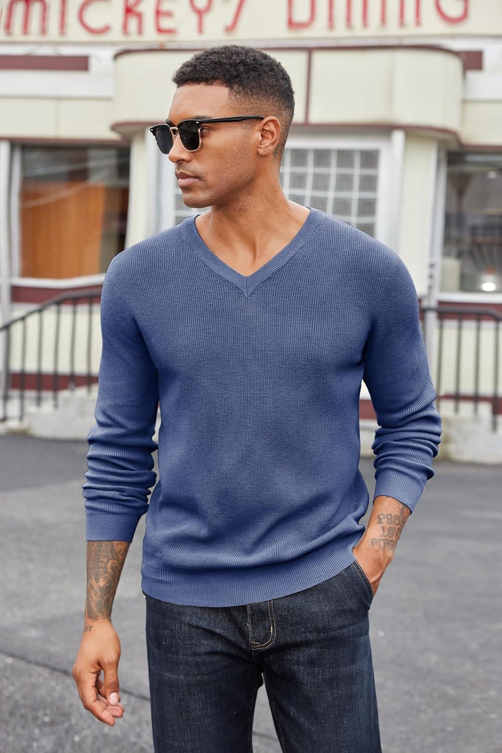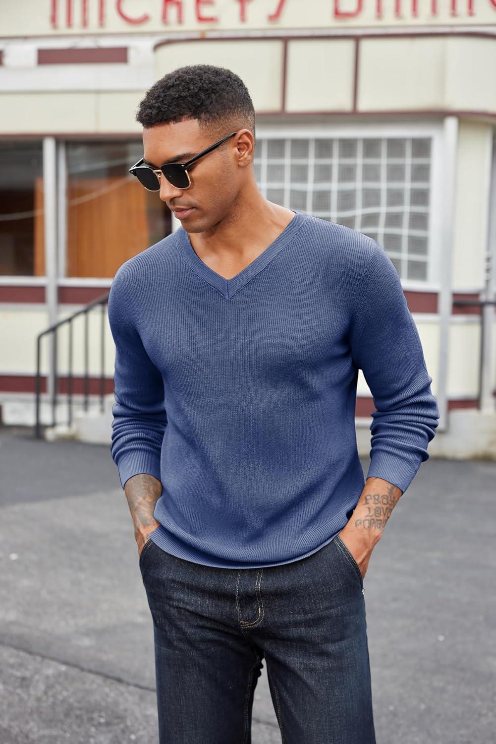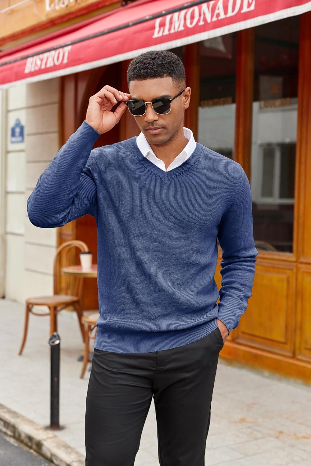 COOFANDY Men V Neck Dress Sweater Knit Long Sleeve Casual Slim Fit Pullover Sweater(Blue and White)