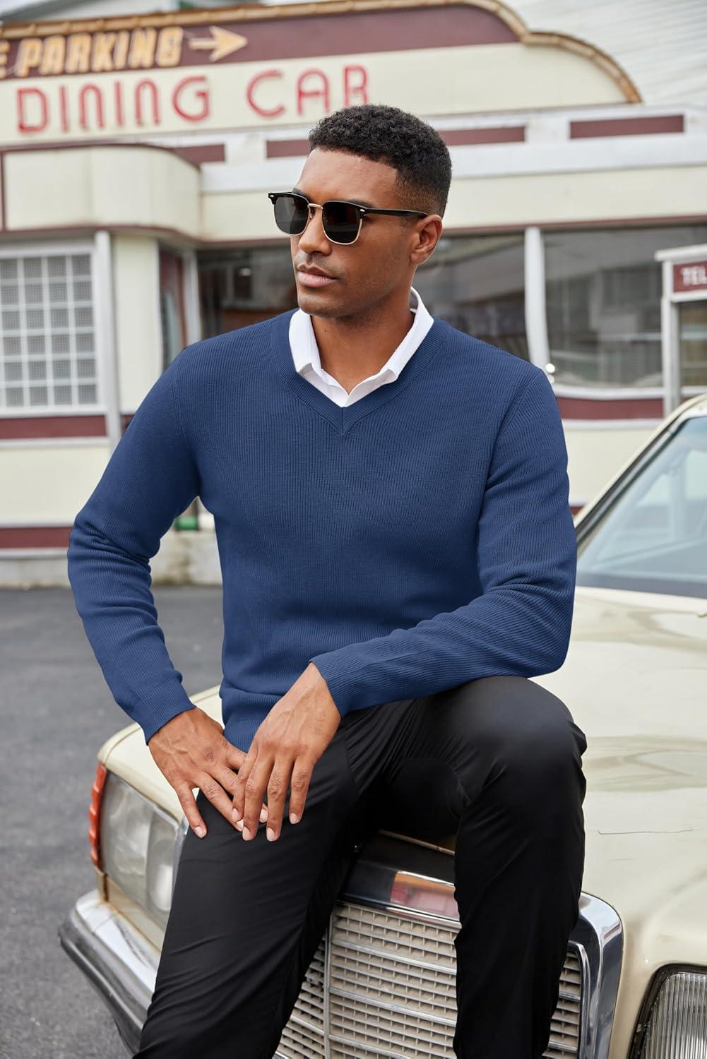 COOFANDY Men V Neck Dress Sweater Knit Long Sleeve Casual Slim Fit Pullover Sweater(Deep Blue)