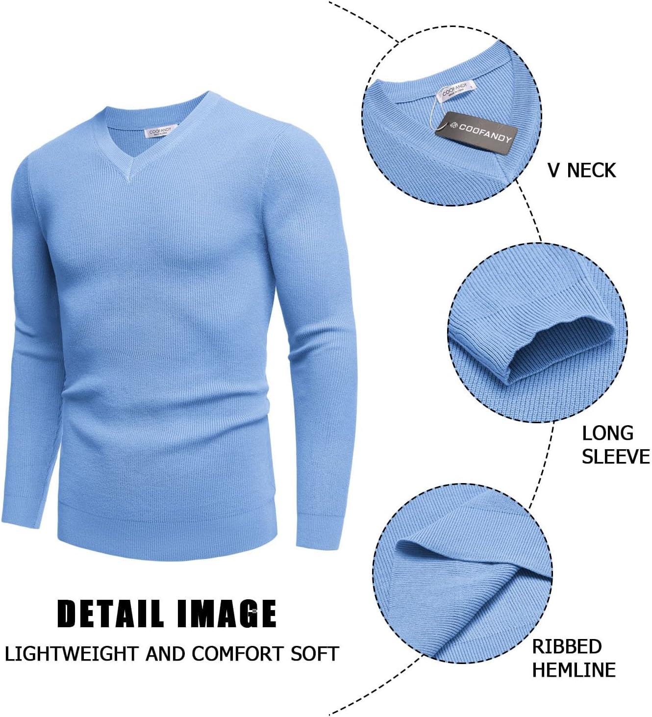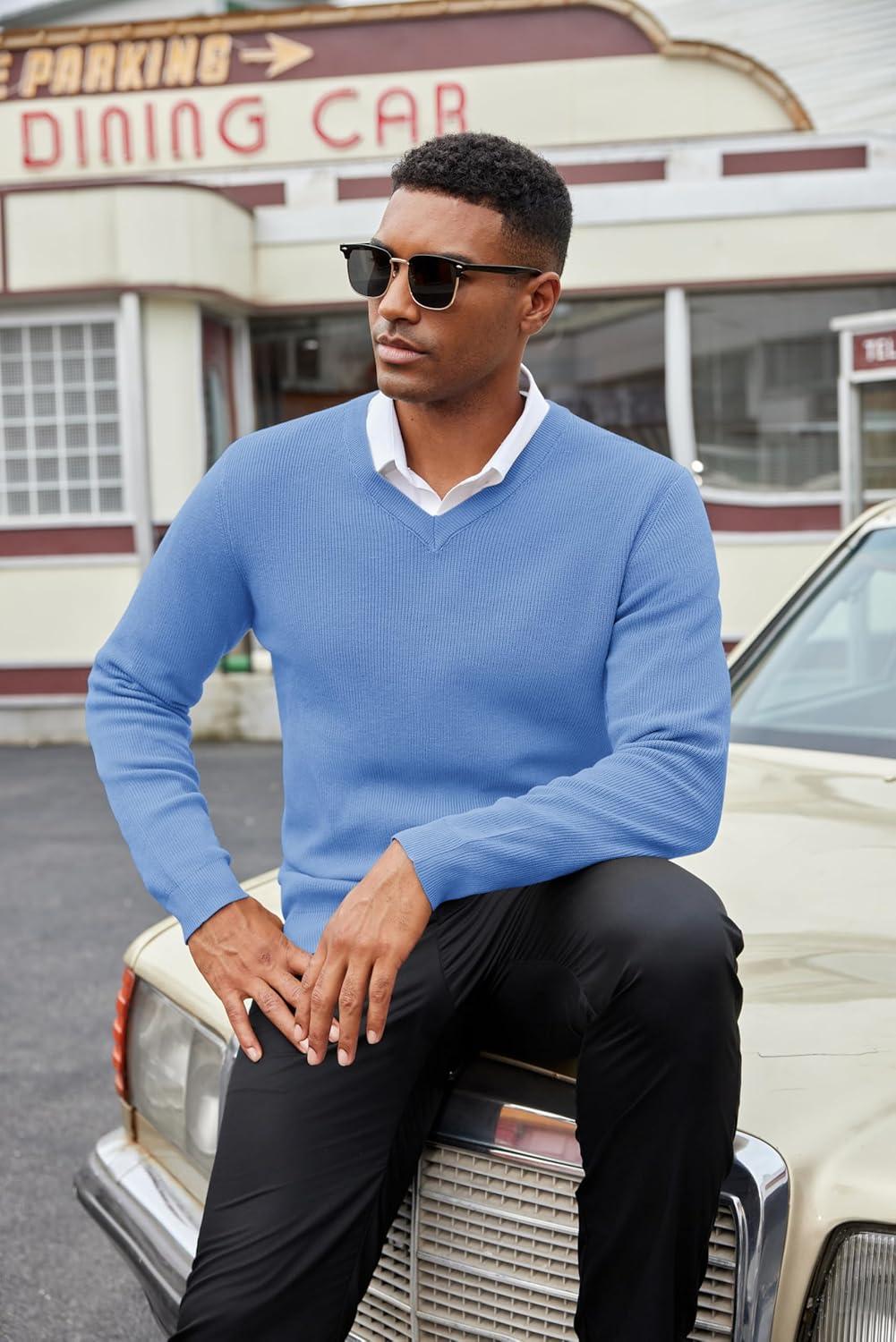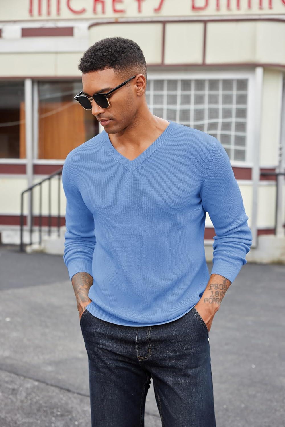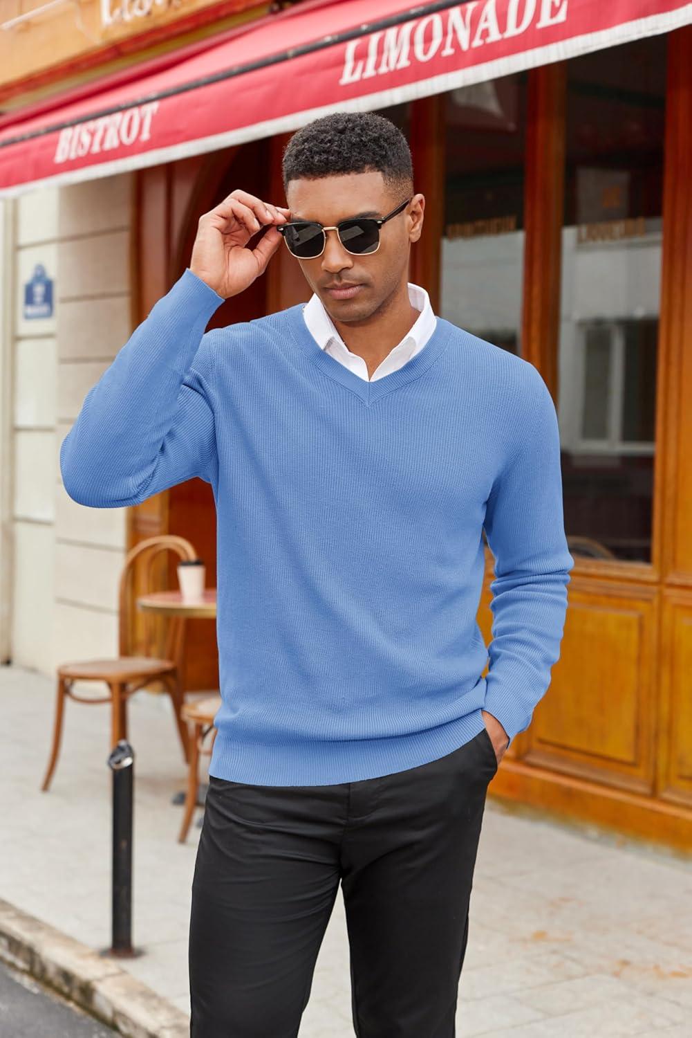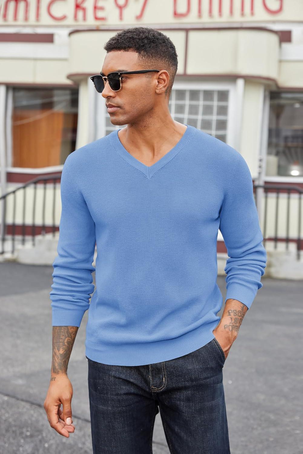 COOFANDY Men V Neck Dress Sweater Knit Long Sleeve Casual Slim Fit Pullover Sweater(Light Blue)