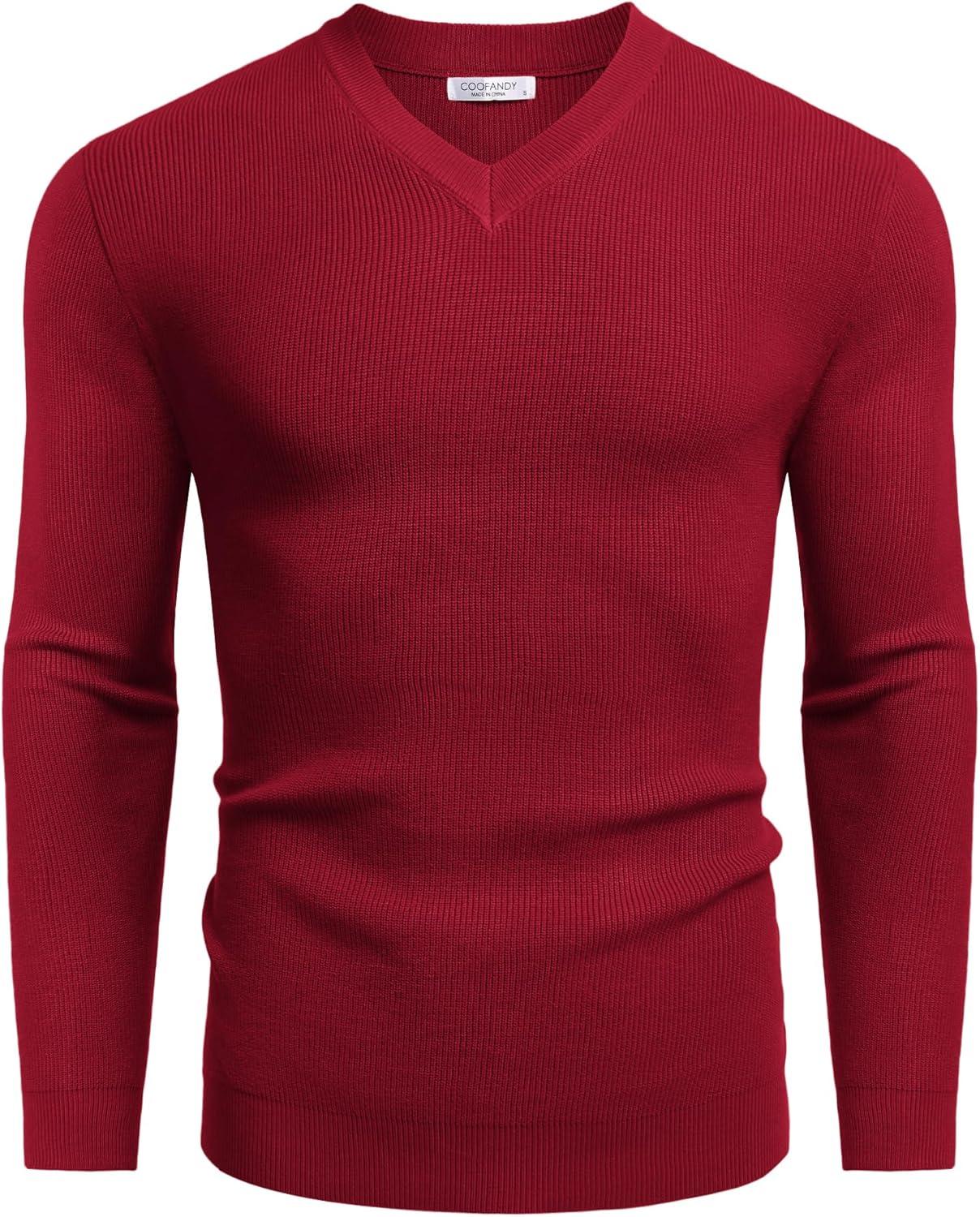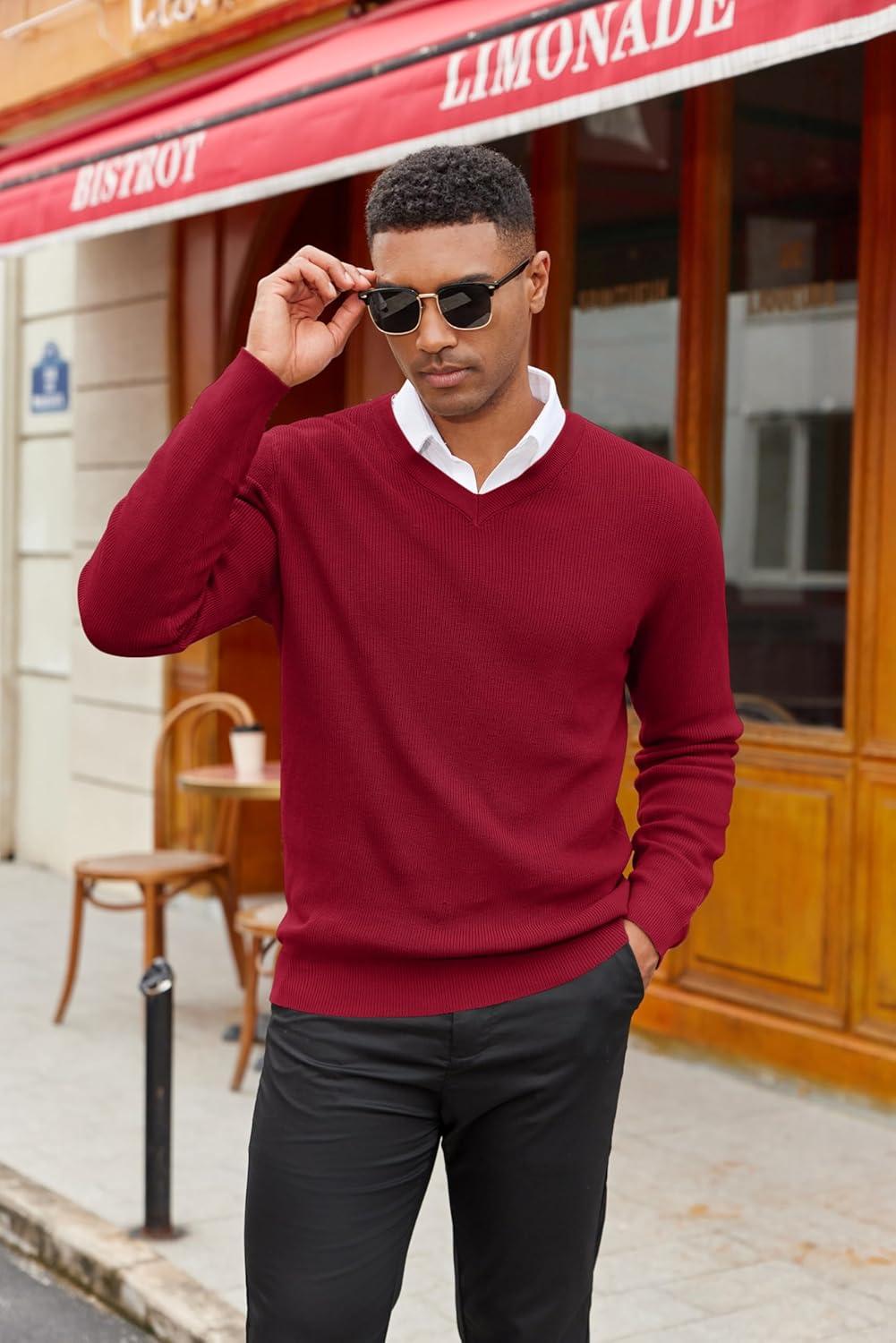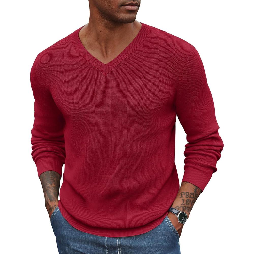 COOFANDY Men V Neck Dress Sweater Knit Long Sleeve Casual Slim Fit Pullover Sweater(Wine Red)