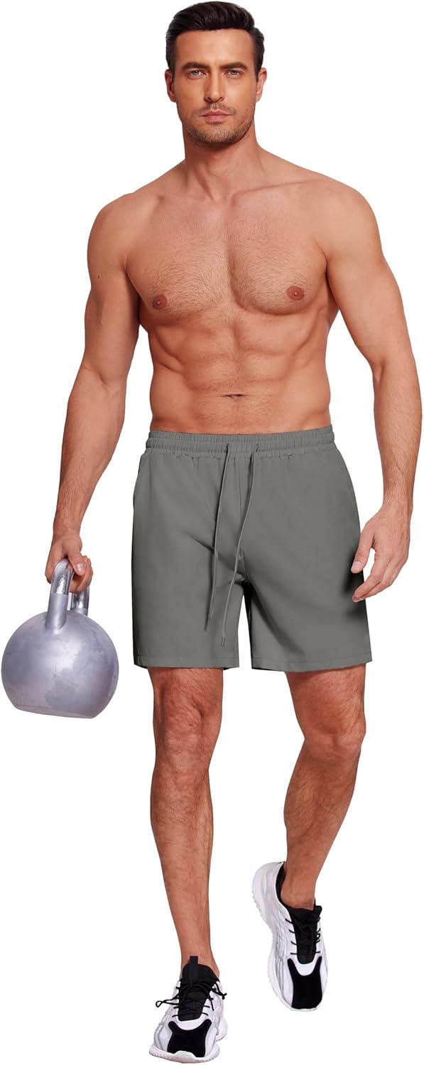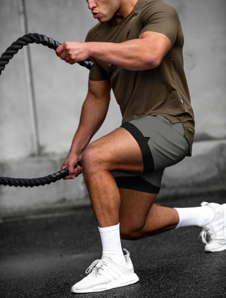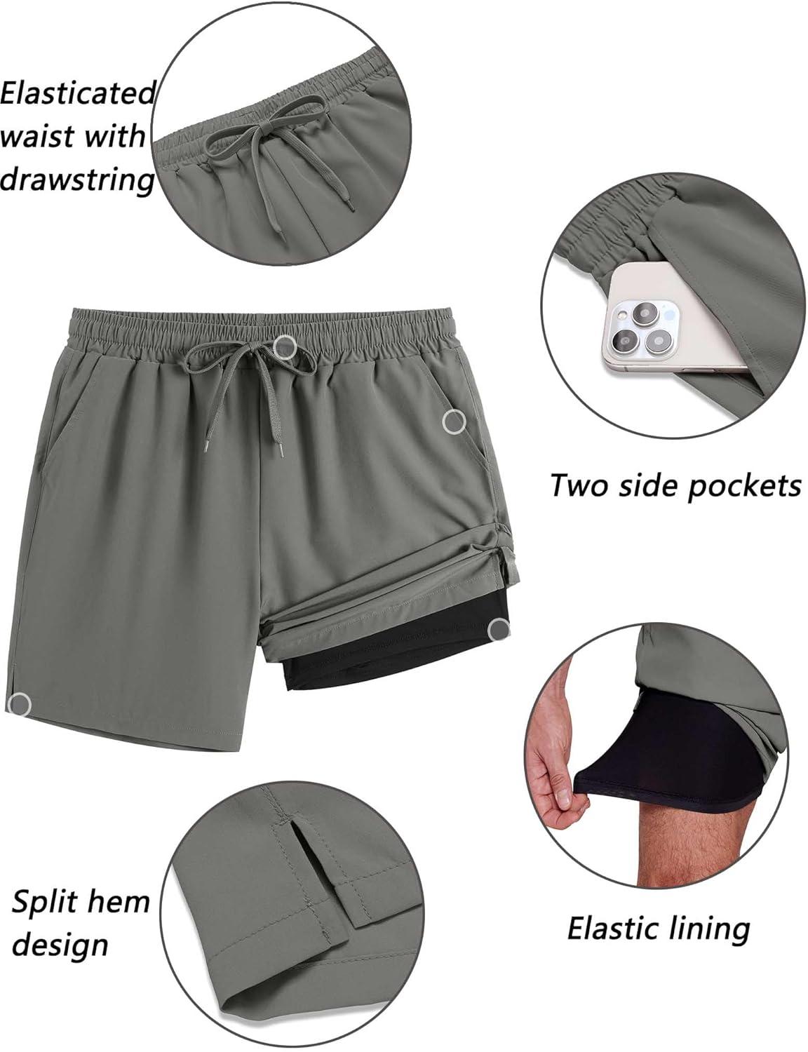 COOFANDY Men’s 2 in 1 Running Shorts 2 Pack Athletic Shorts Quick Dry Gym Training Workout Shorts with Pockets(Khaki/Grey)