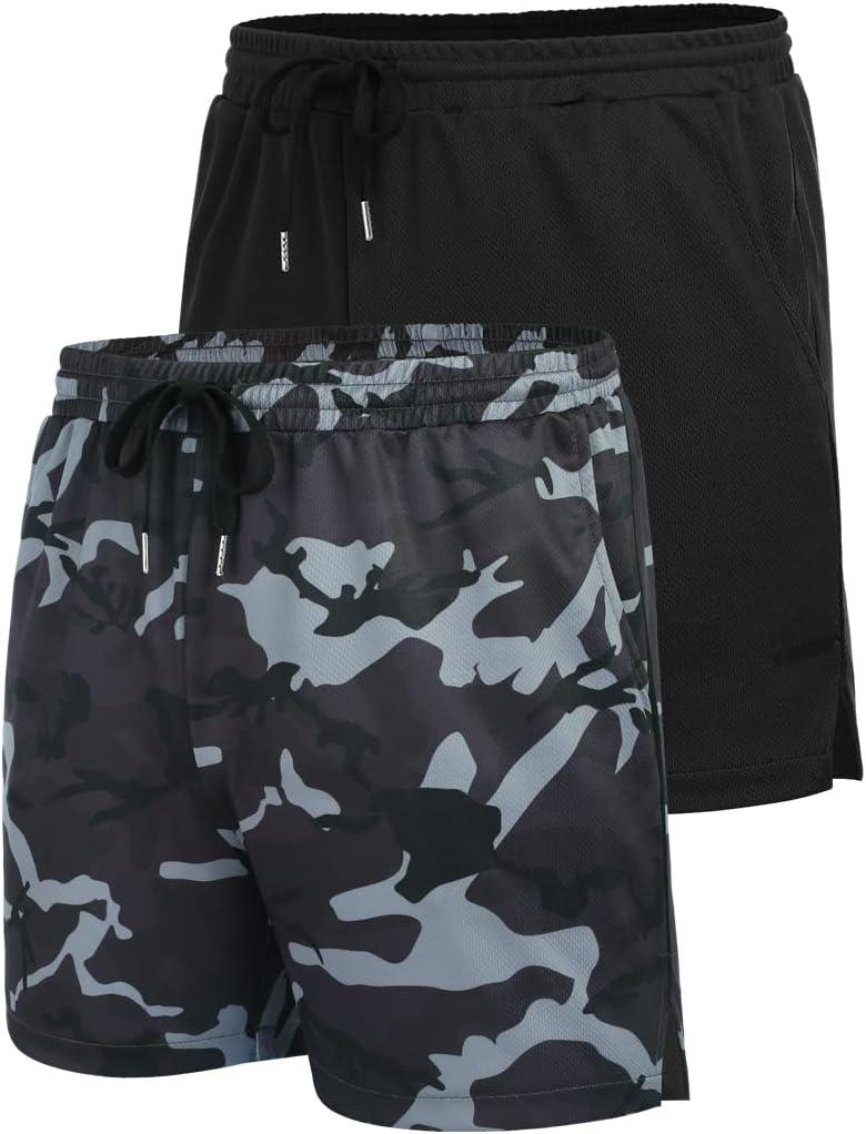 COOFANDY Men's 2 Pack Gym Workout Shorts Quick Dry Athletic Shorts 5 Inch Lightweight Sports Running Shorts with Pockets(Black/Grey Camo)