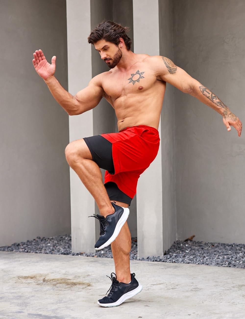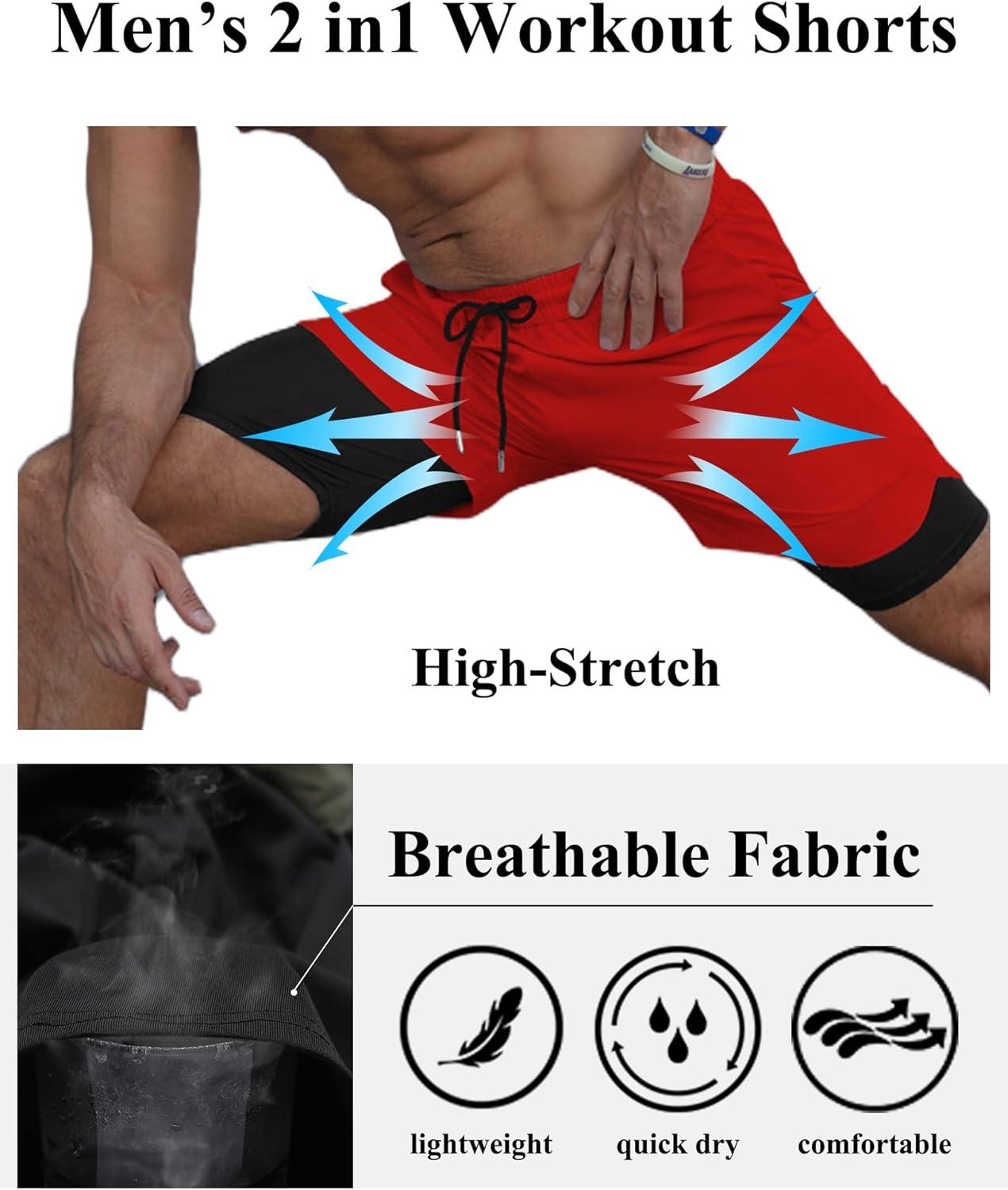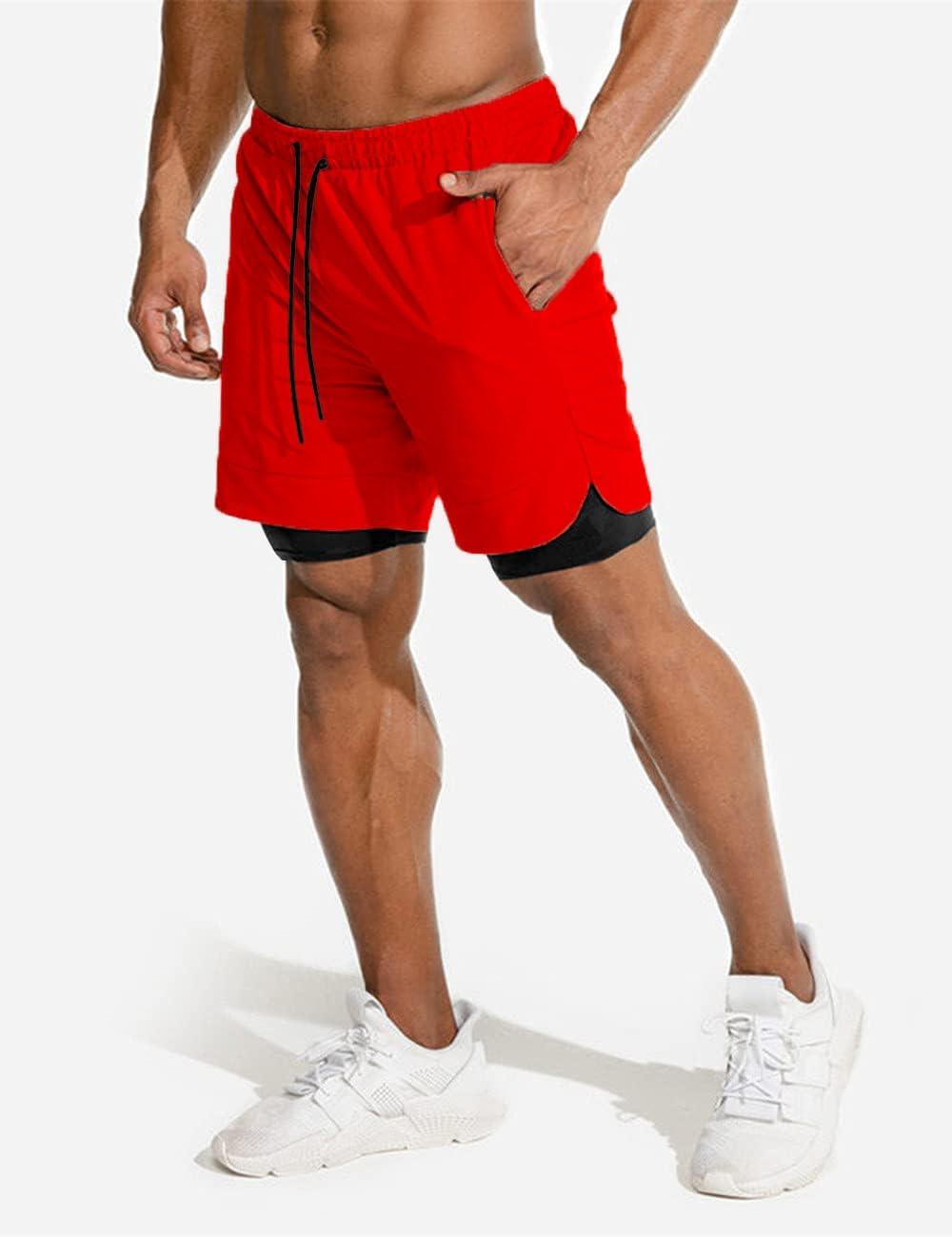 COOFANDY Men’s 2 Pack Running Shorts 2 in 1 Workout Shorts Quick Dry Gym Training Athletic Jogger with Phone Pockets(2-pack:red+dark Grey)