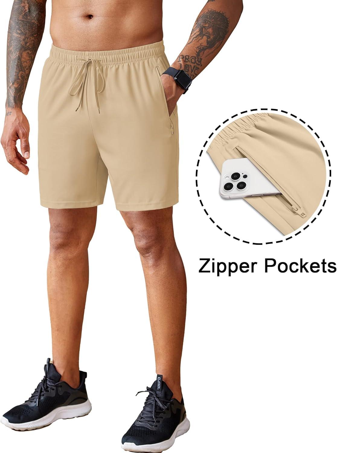 COOFANDY Men’s 2 Pack Workout Gym Shorts 7 Inch / 5 Inch Athletic Shorts Lightweight Casual Jogger Short with Zipper Pockets(Khaki / Black)