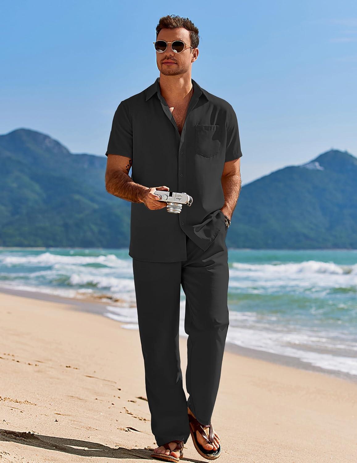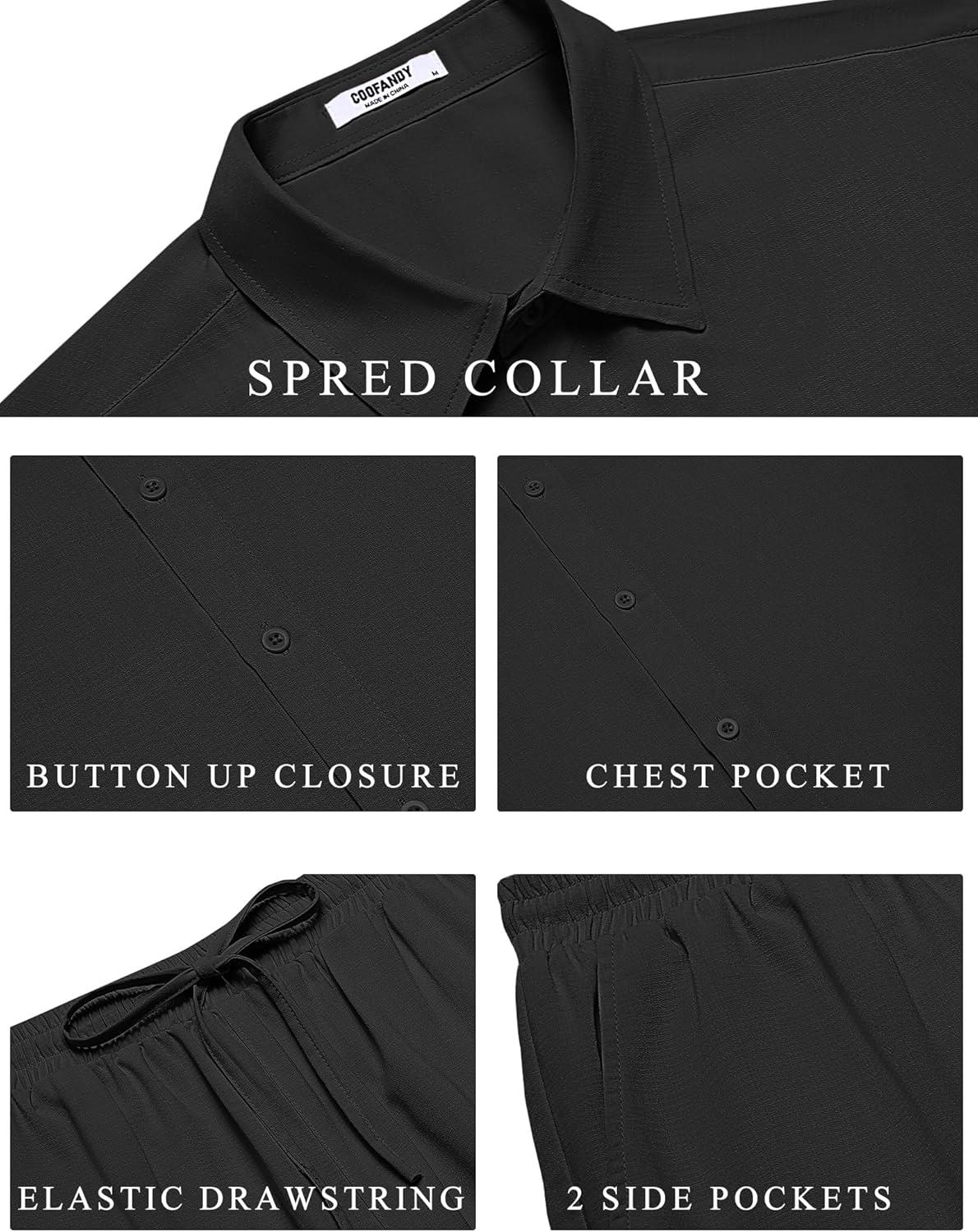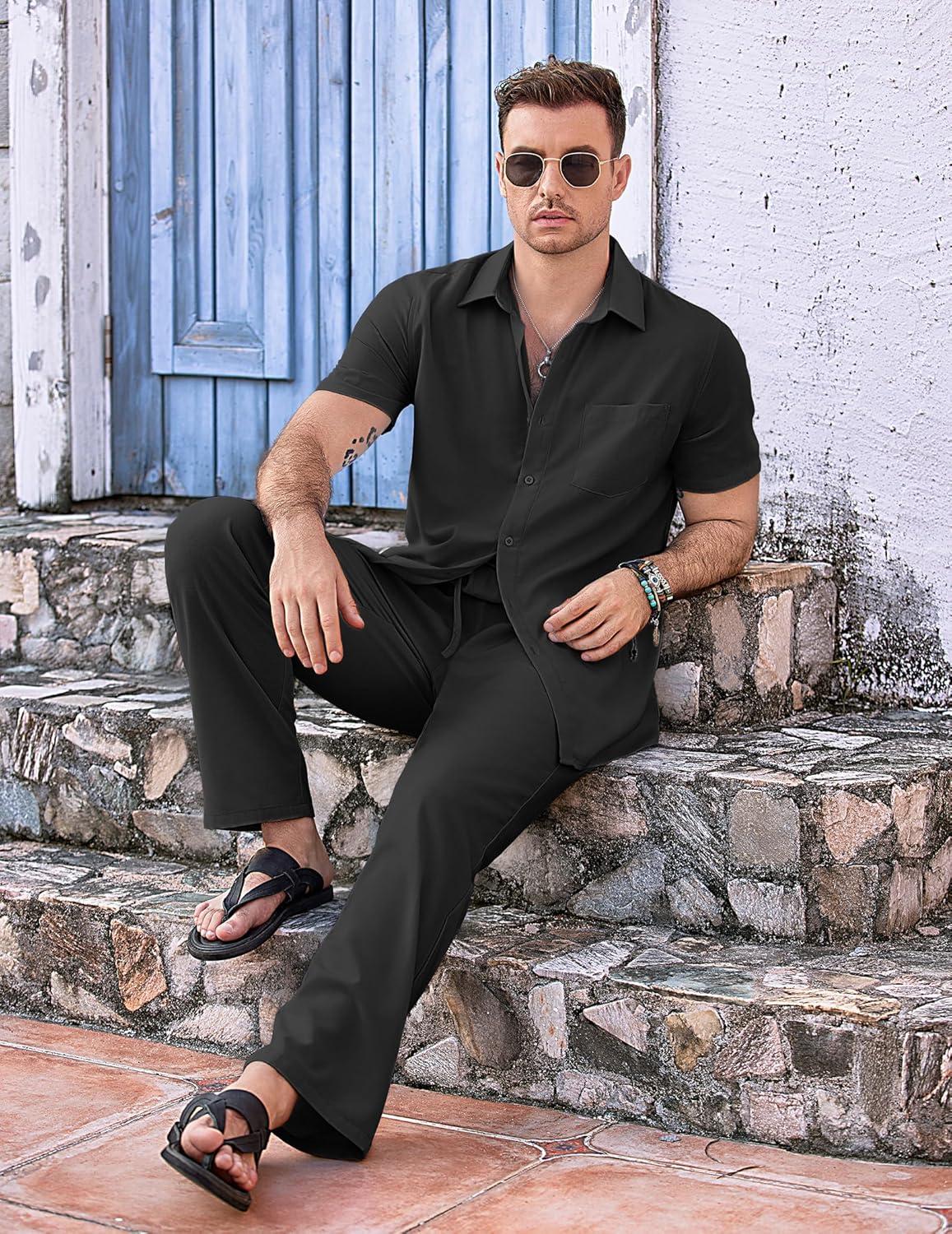 COOFANDY Mens 2 Piece Casual Beach Outfits Short Sleeve Button Down Shirts Summer Loose Pant Sets Vacation Walking Outfits(Black)