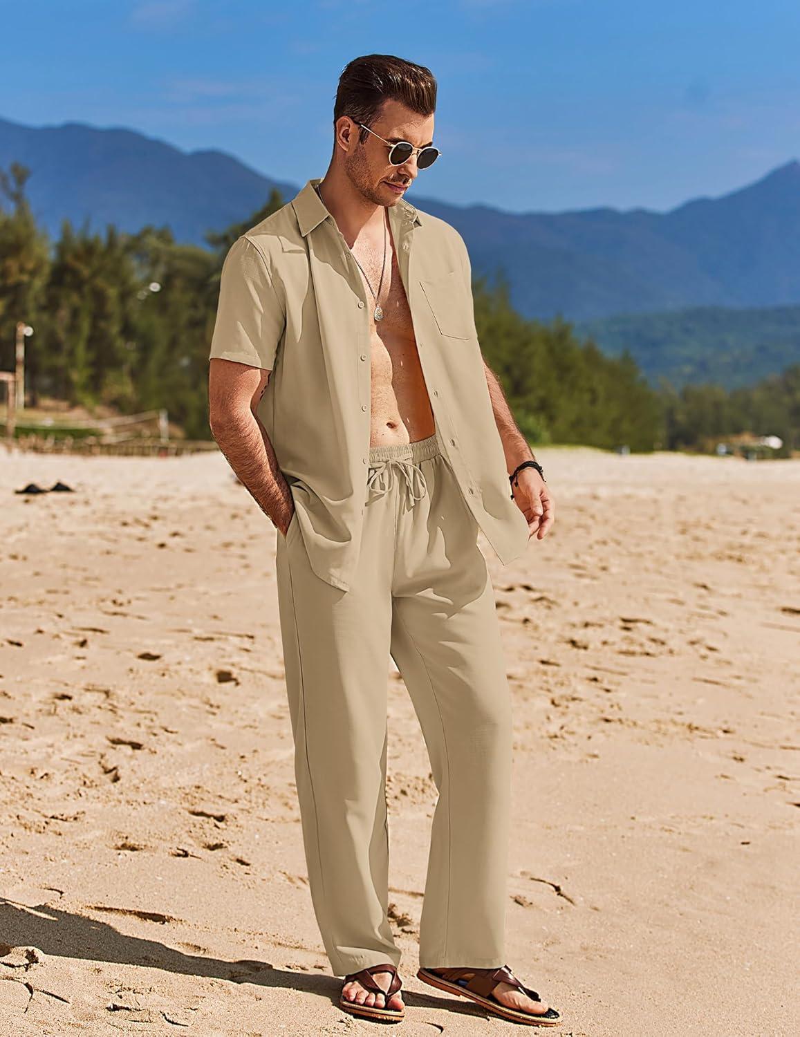 COOFANDY Mens 2 Piece Casual Beach Outfits Short Sleeve Button Down Shirts Summer Loose Pant Sets Vacation Walking Outfits(Beige)
