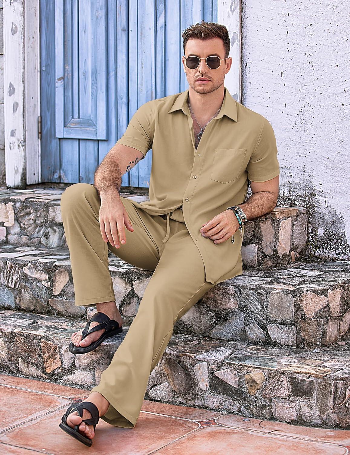COOFANDY Mens 2 Piece Casual Beach Outfits Short Sleeve Button Down Shirts Summer Loose Pant Sets Vacation Walking Outfits(Khaki)