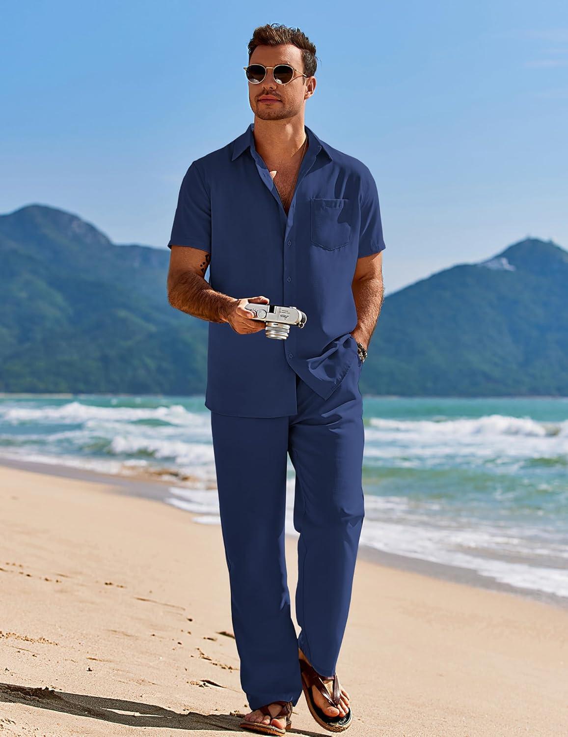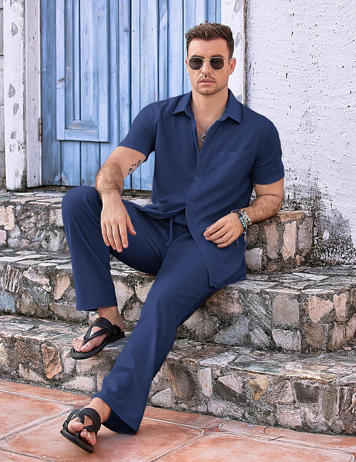 COOFANDY Mens 2 Piece Casual Beach Outfits Short Sleeve Button Down Shirts Summer Loose Pant Sets Vacation Walking Outfits(Navy Blue)