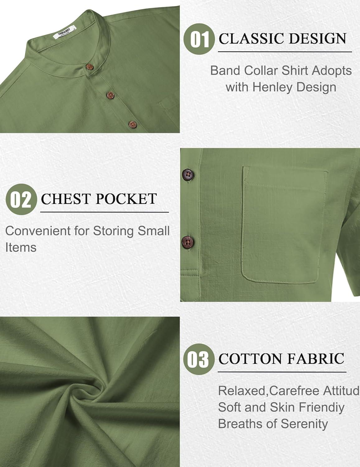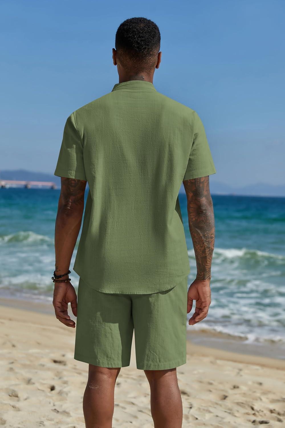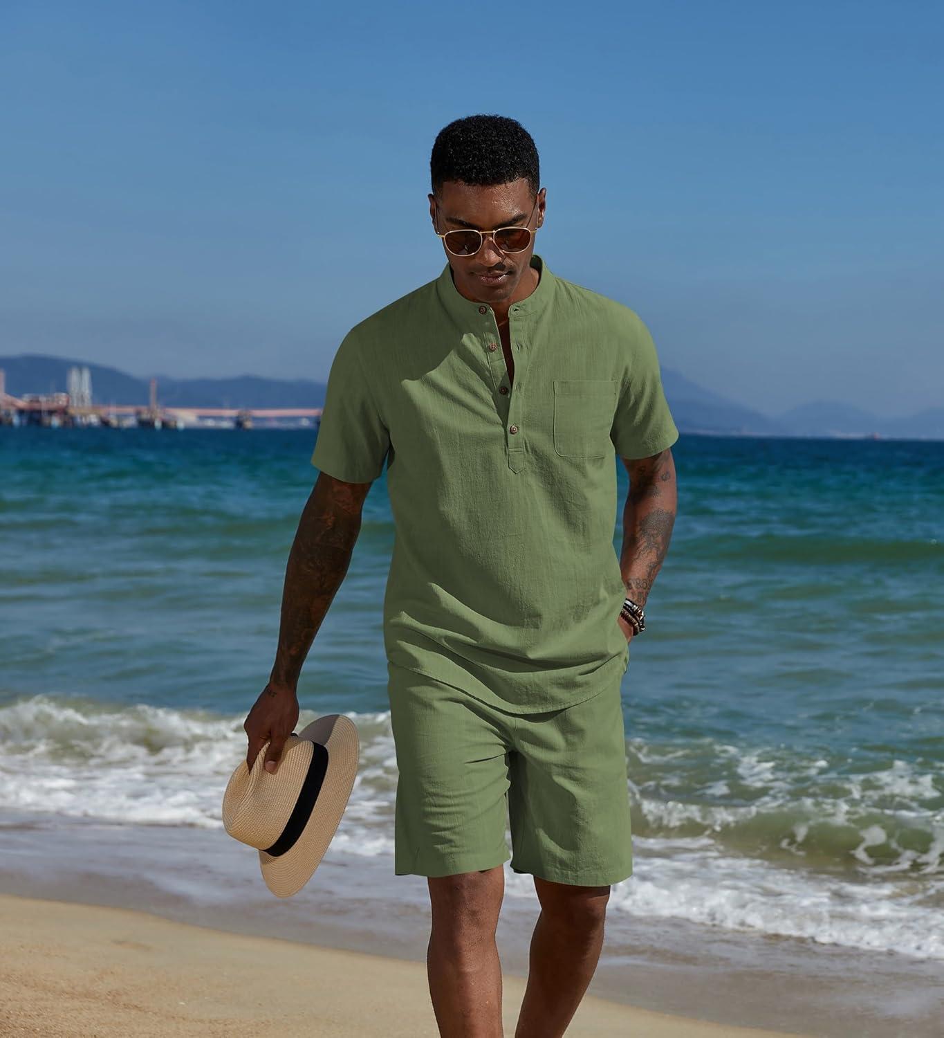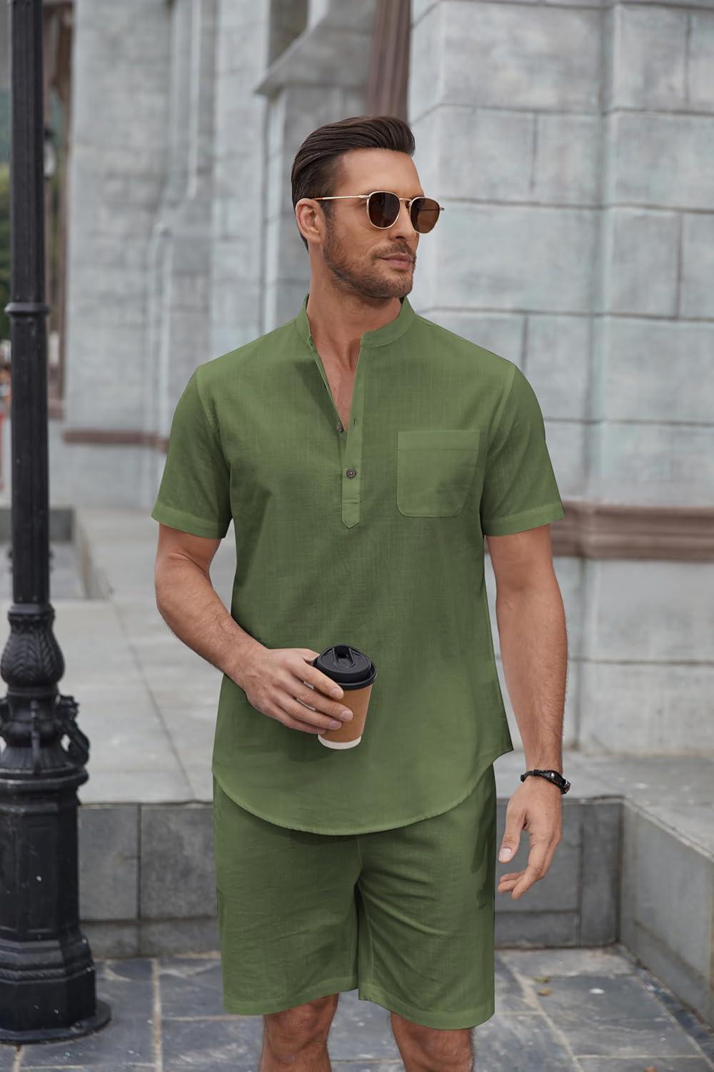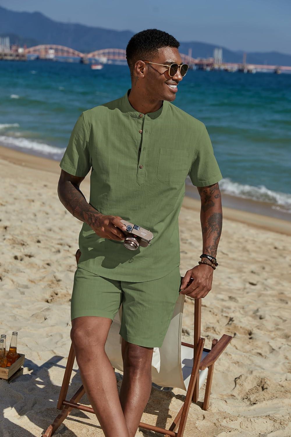 COOFANDY Men's 2 Piece Cotton Linen Sets Summer Beach Outfits Casual Short Sleeve Henley Shirts and Vacation Shorts(Army Green)