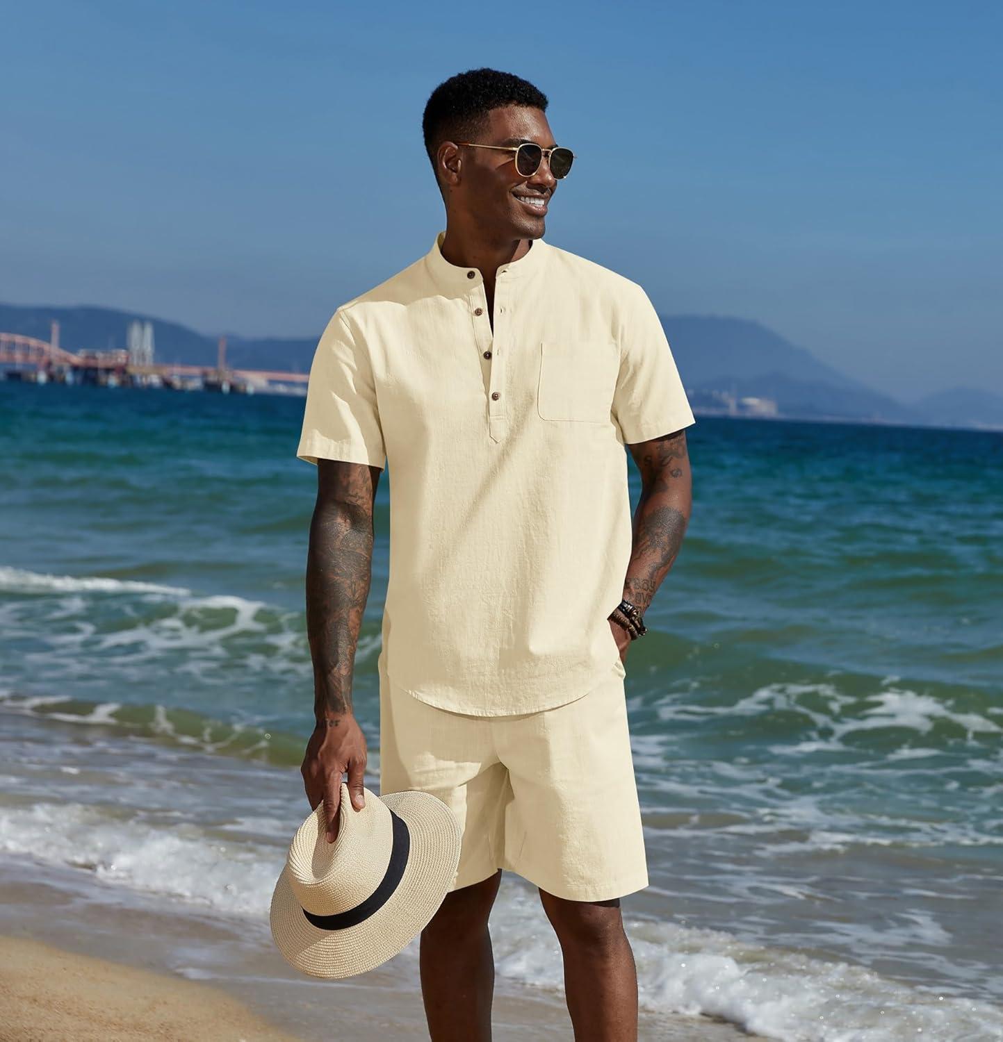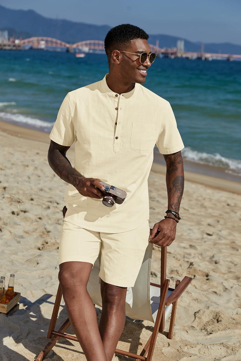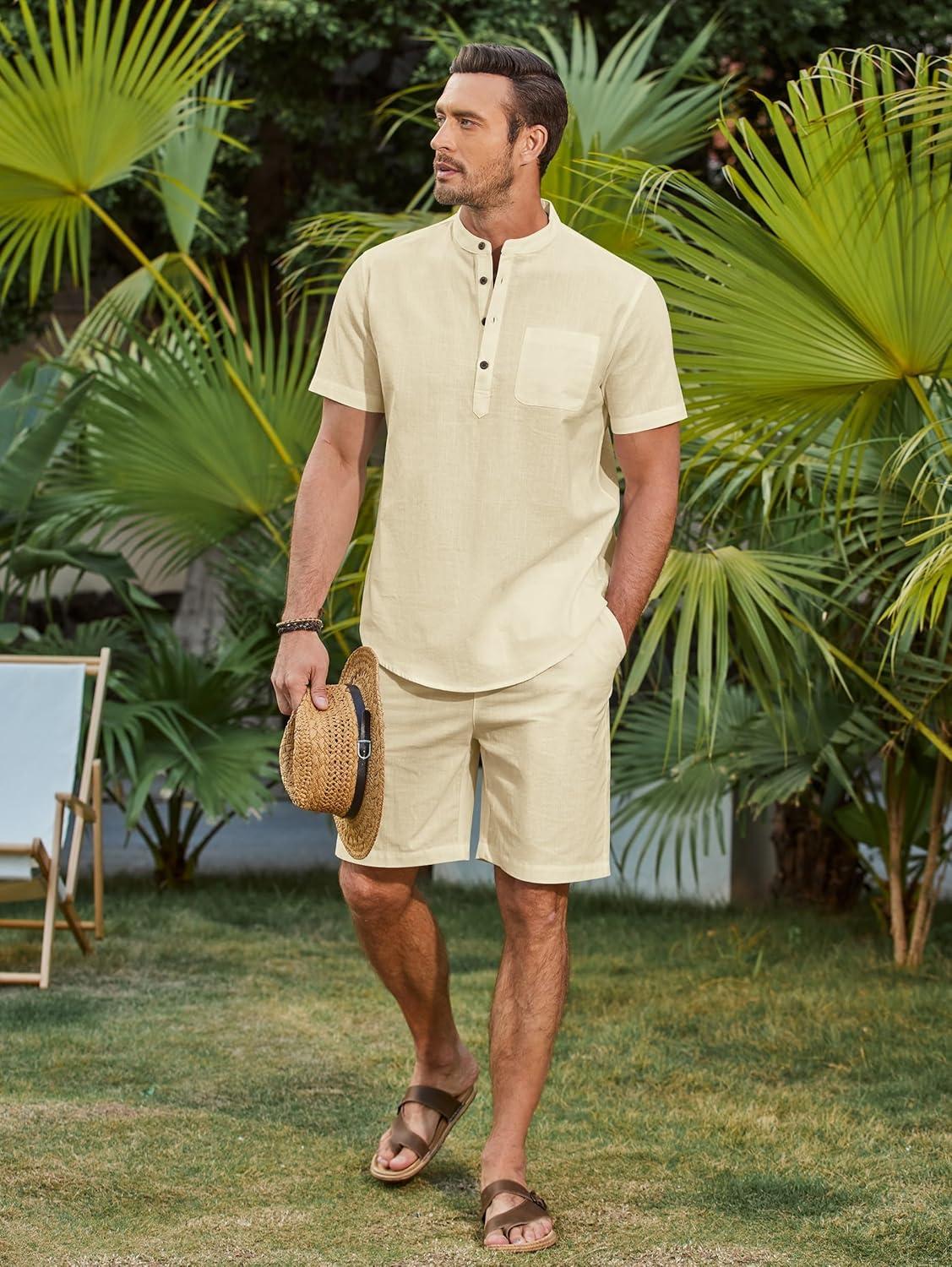 COOFANDY Men's 2 Piece Cotton Linen Sets Summer Beach Outfits Casual Short Sleeve Henley Shirts and Vacation Shorts(Beige)