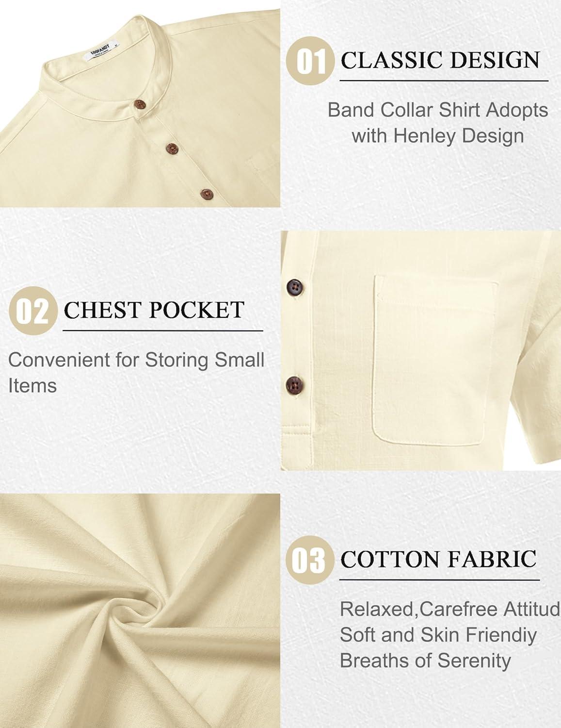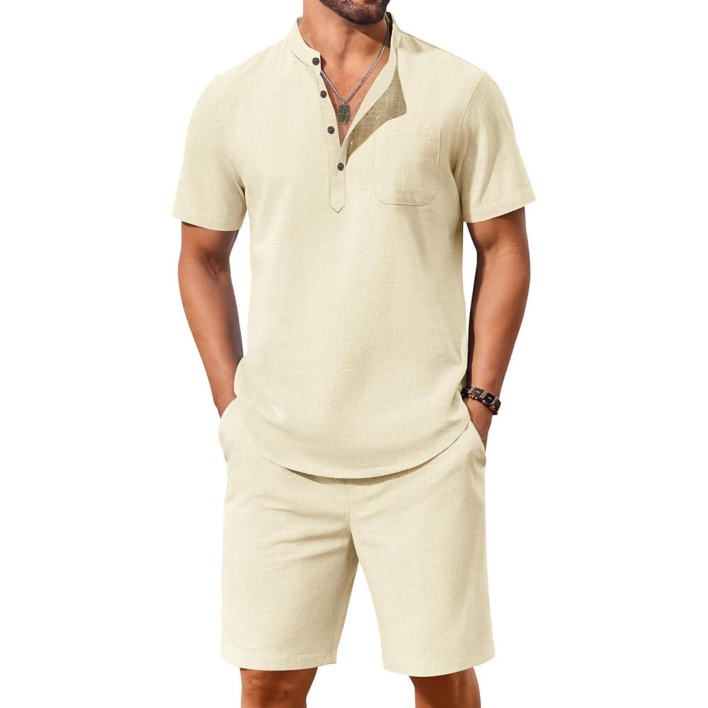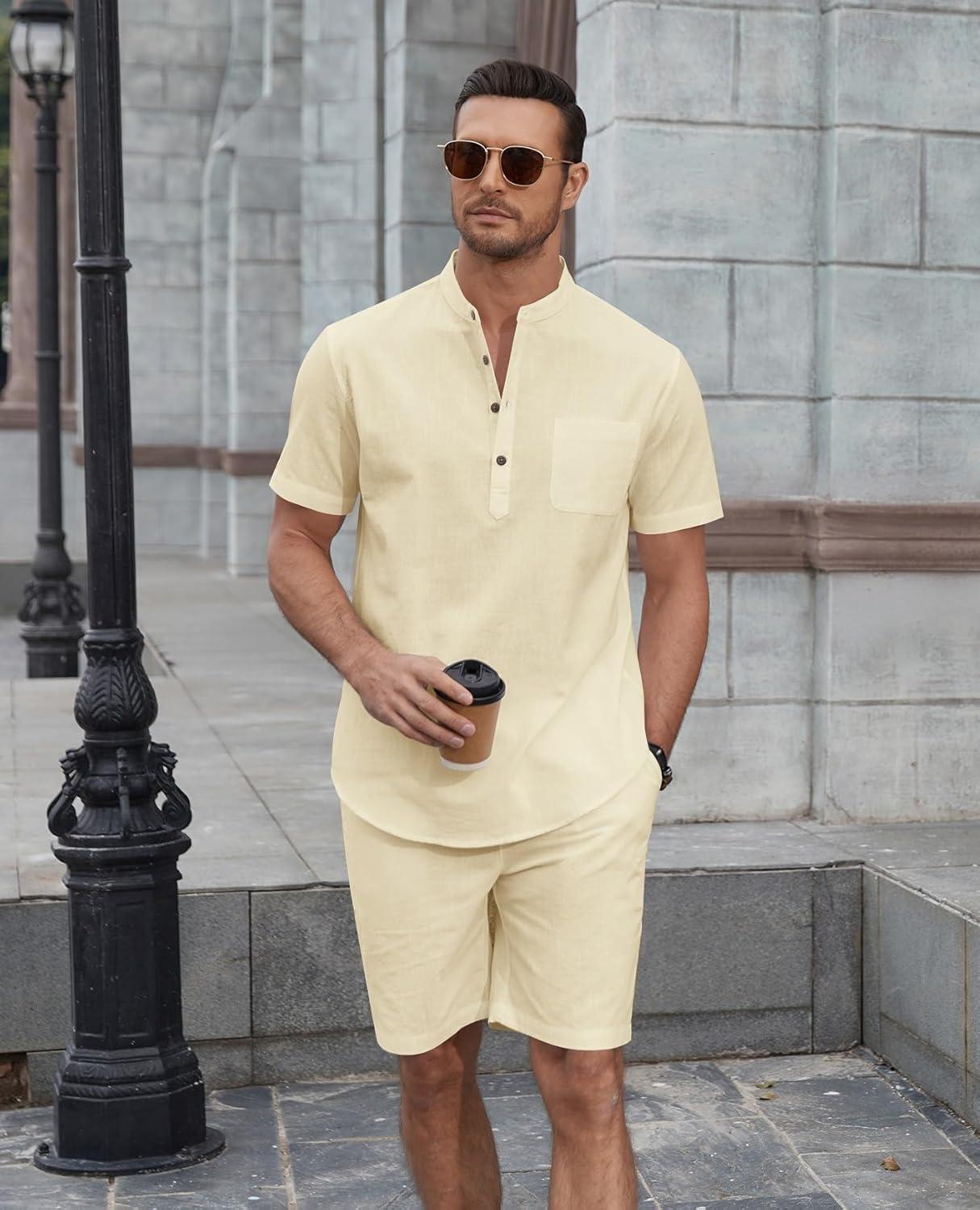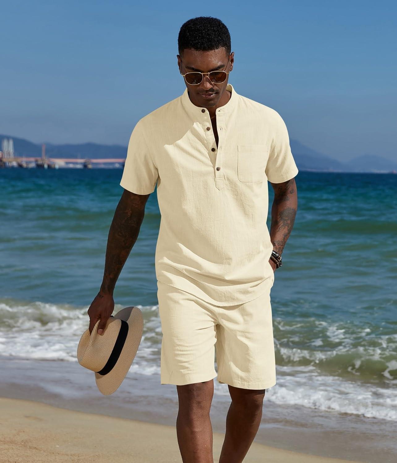 COOFANDY Men's 2 Piece Cotton Linen Sets Summer Beach Outfits Casual Short Sleeve Henley Shirts and Vacation Shorts(Beige)