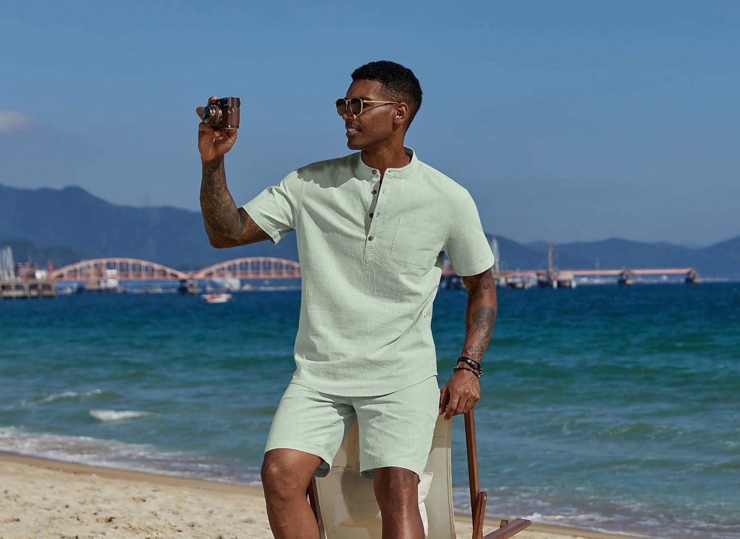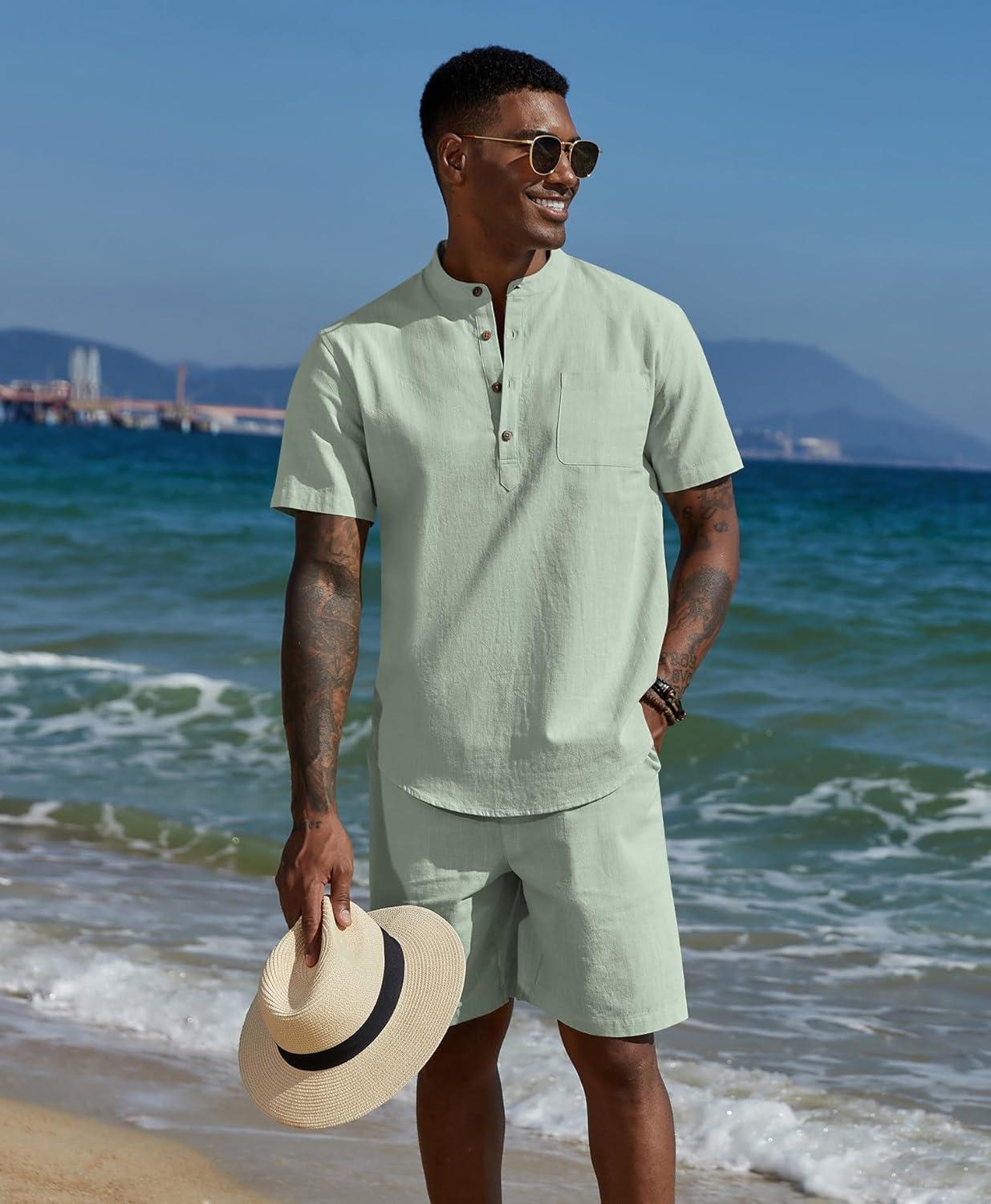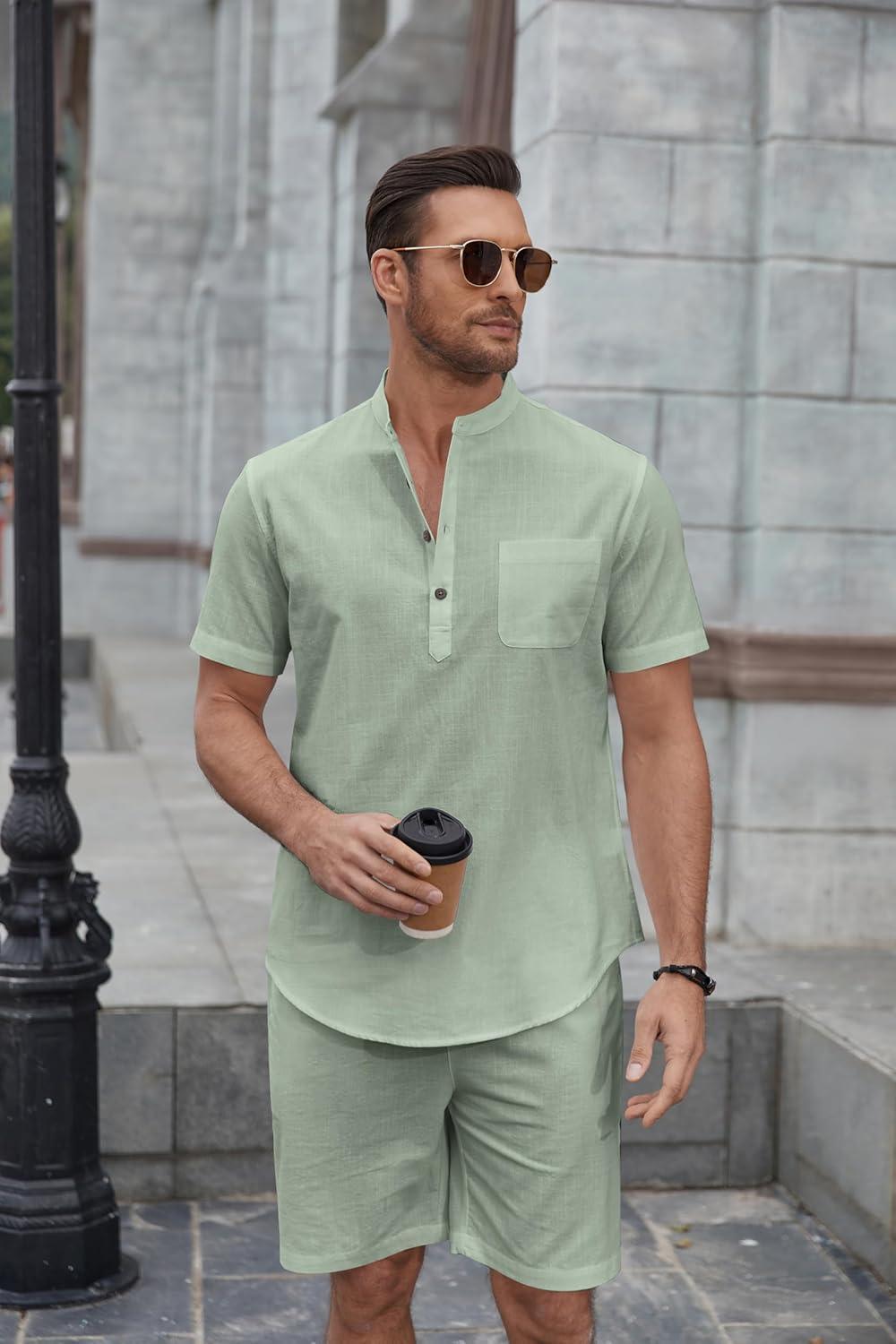 COOFANDY Men's 2 Piece Cotton Linen Sets Summer Beach Outfits Casual Short Sleeve Henley Shirts and Vacation Shorts(Light Green)