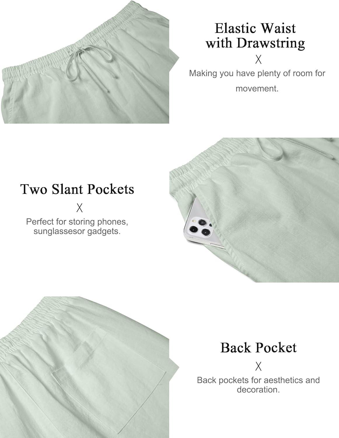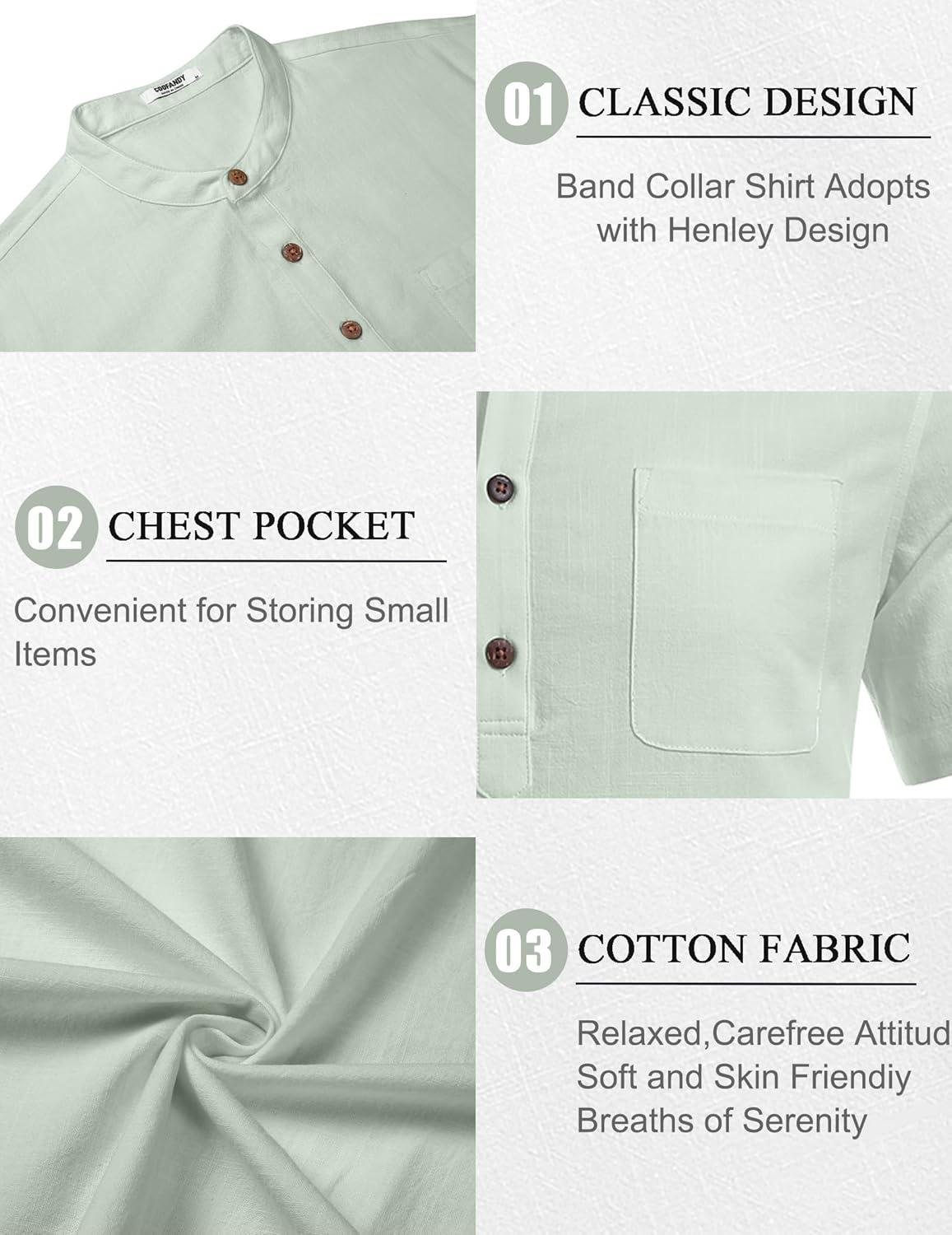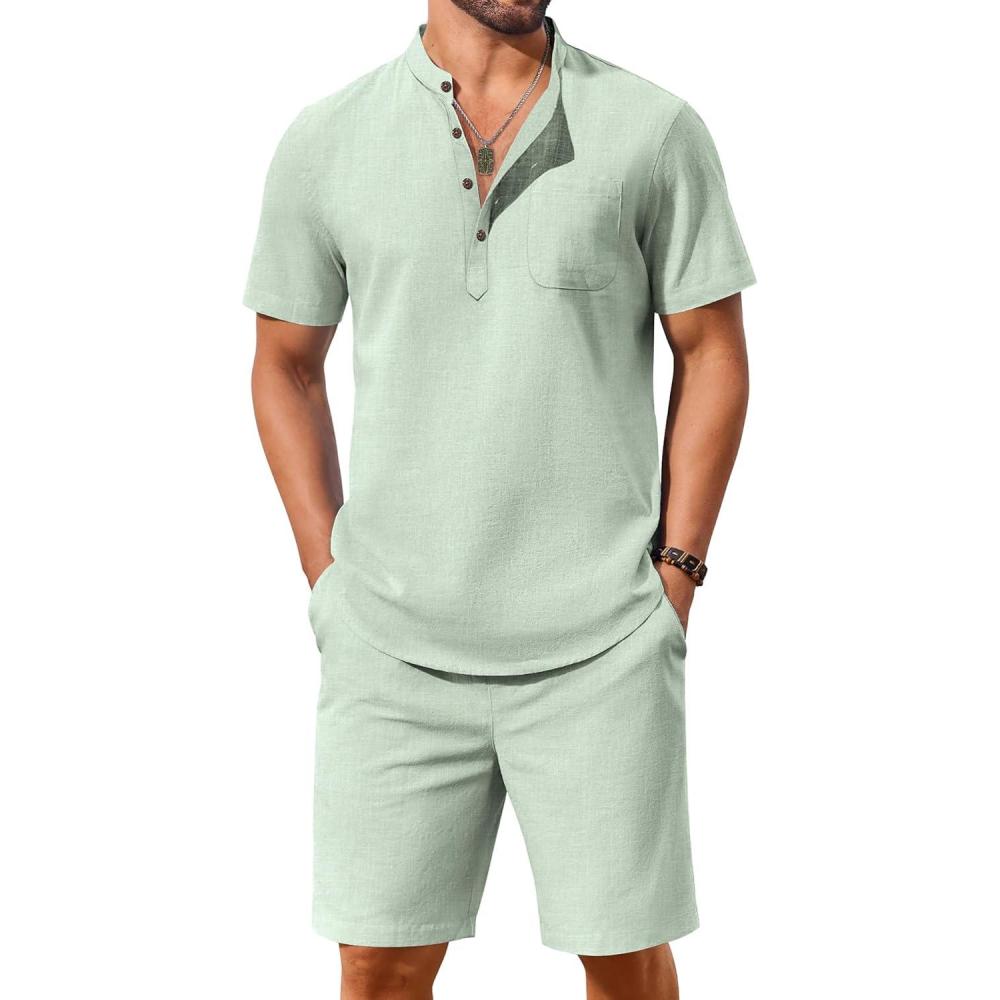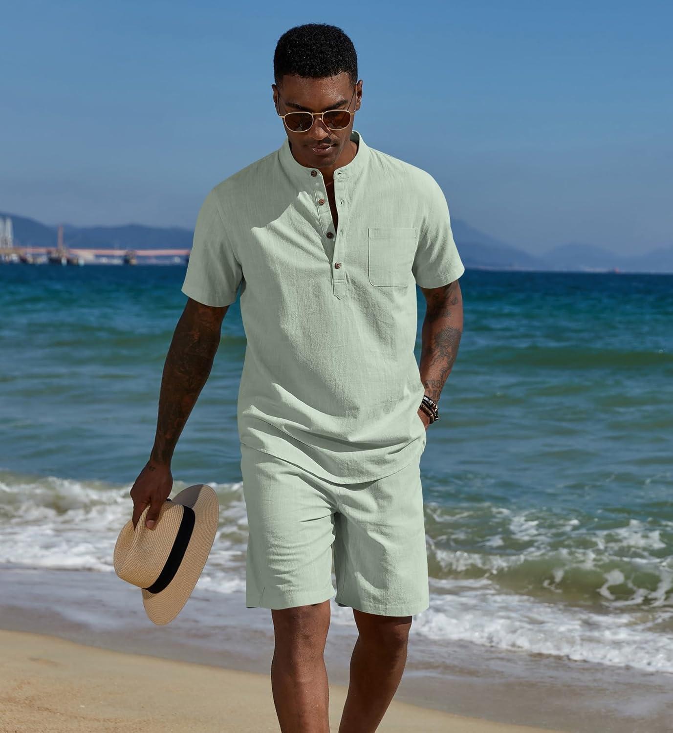 COOFANDY Men's 2 Piece Cotton Linen Sets Summer Beach Outfits Casual Short Sleeve Henley Shirts and Vacation Shorts(Light Green)