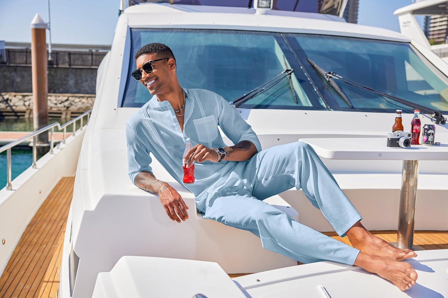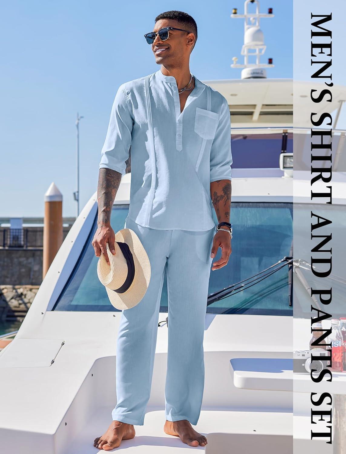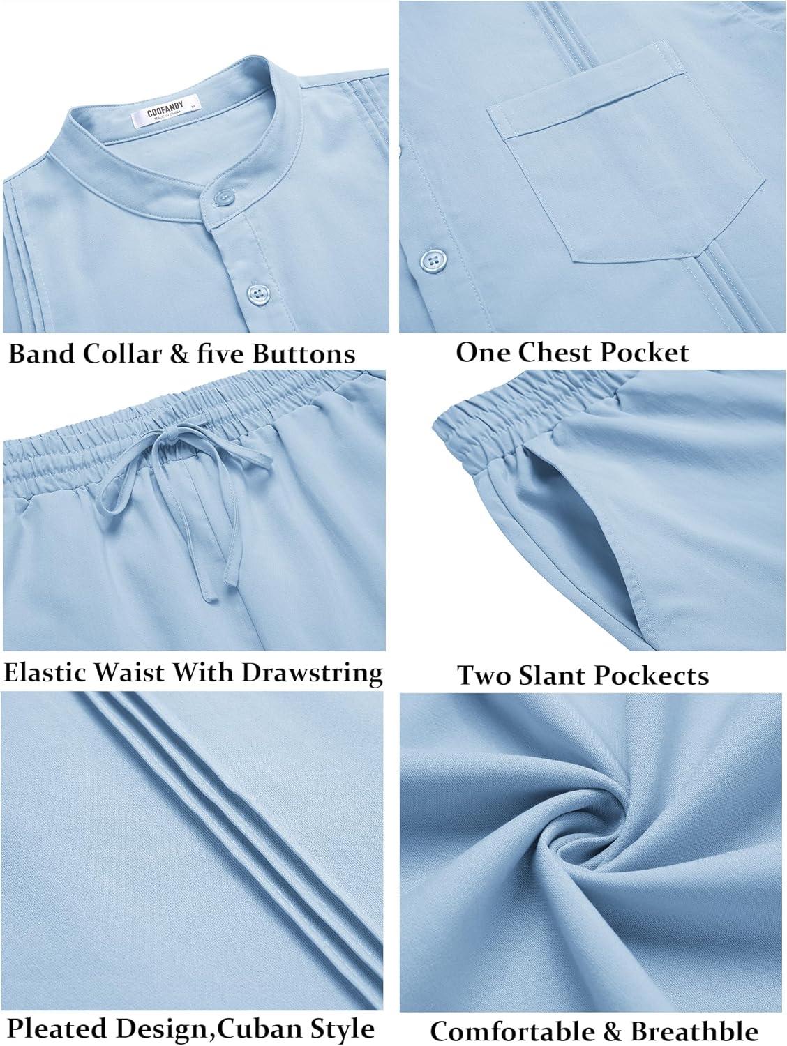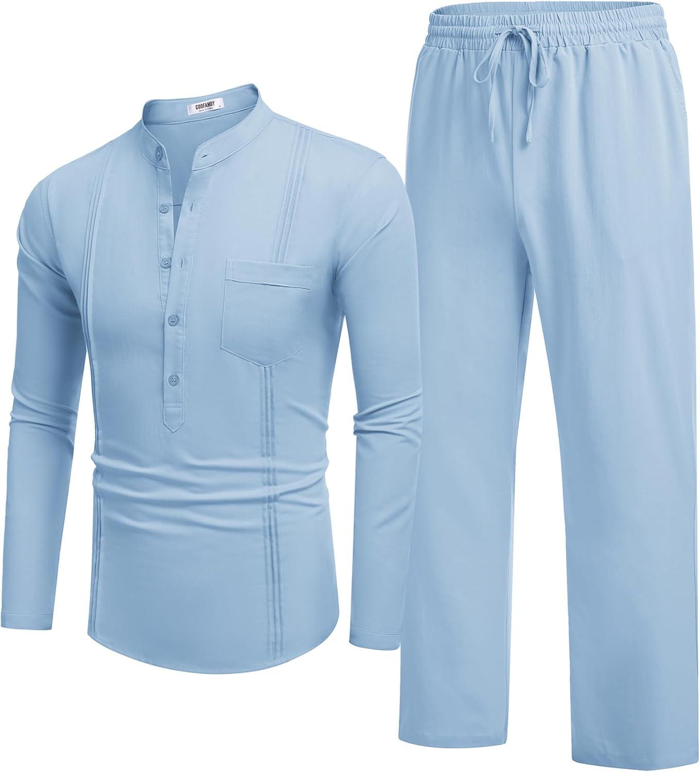 COOFANDY Men's 2 Piece Cotton Sets Casual Long Sleeve Cuban Henley Shirt and Loose Pants Set Beach Vacation Outfits(Light Blue)