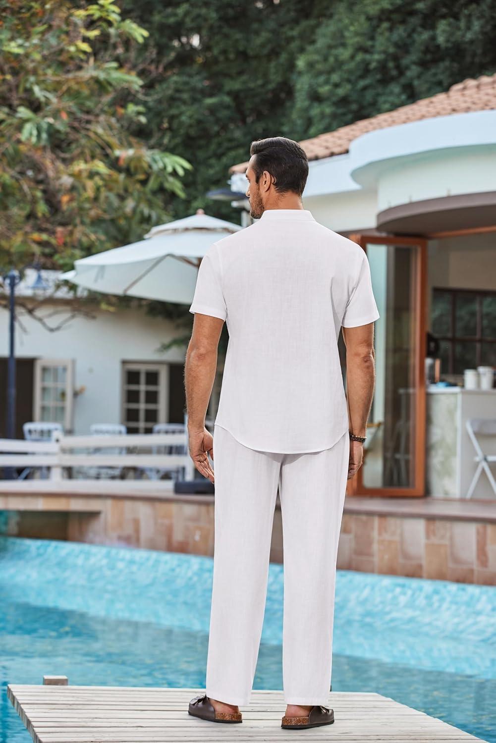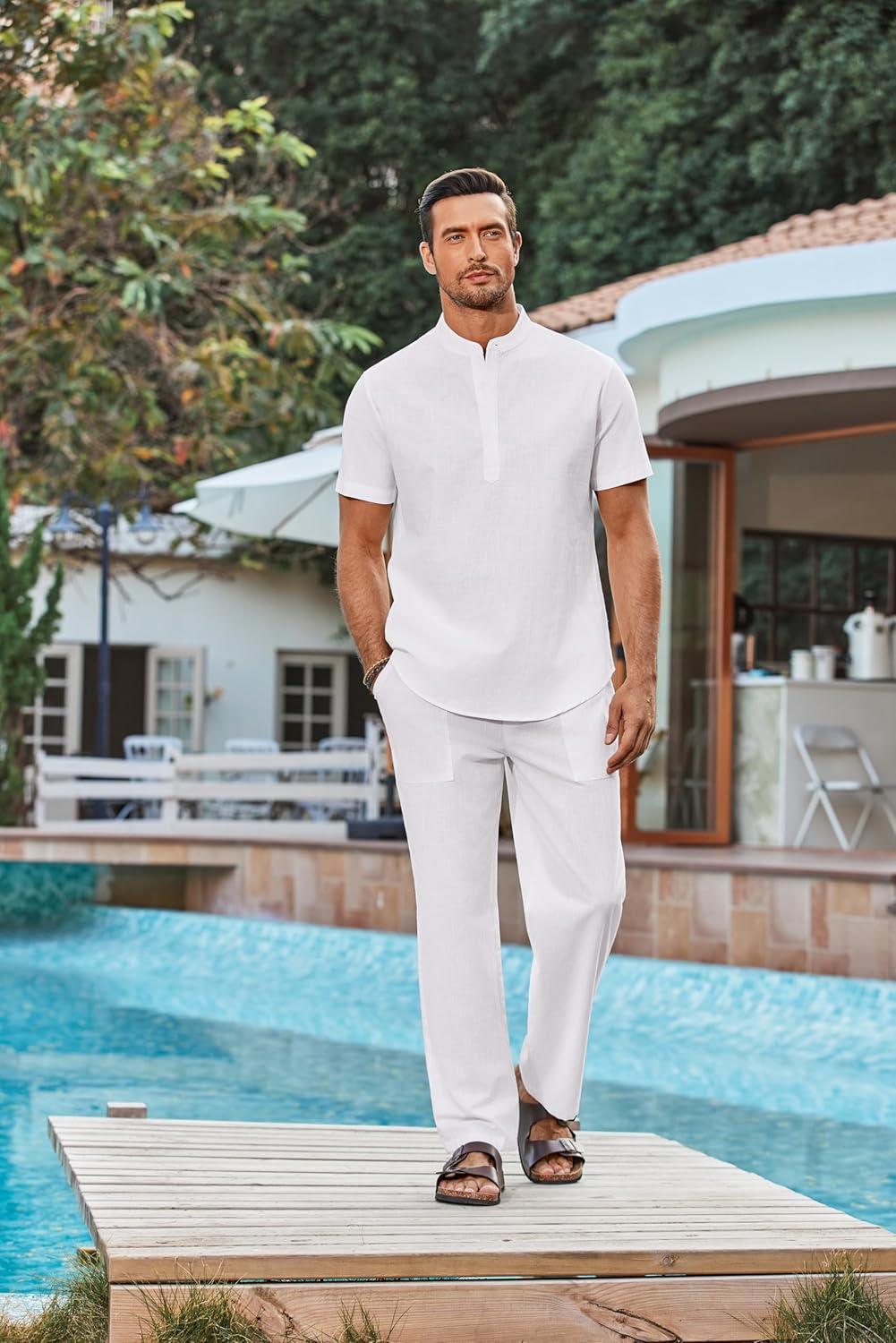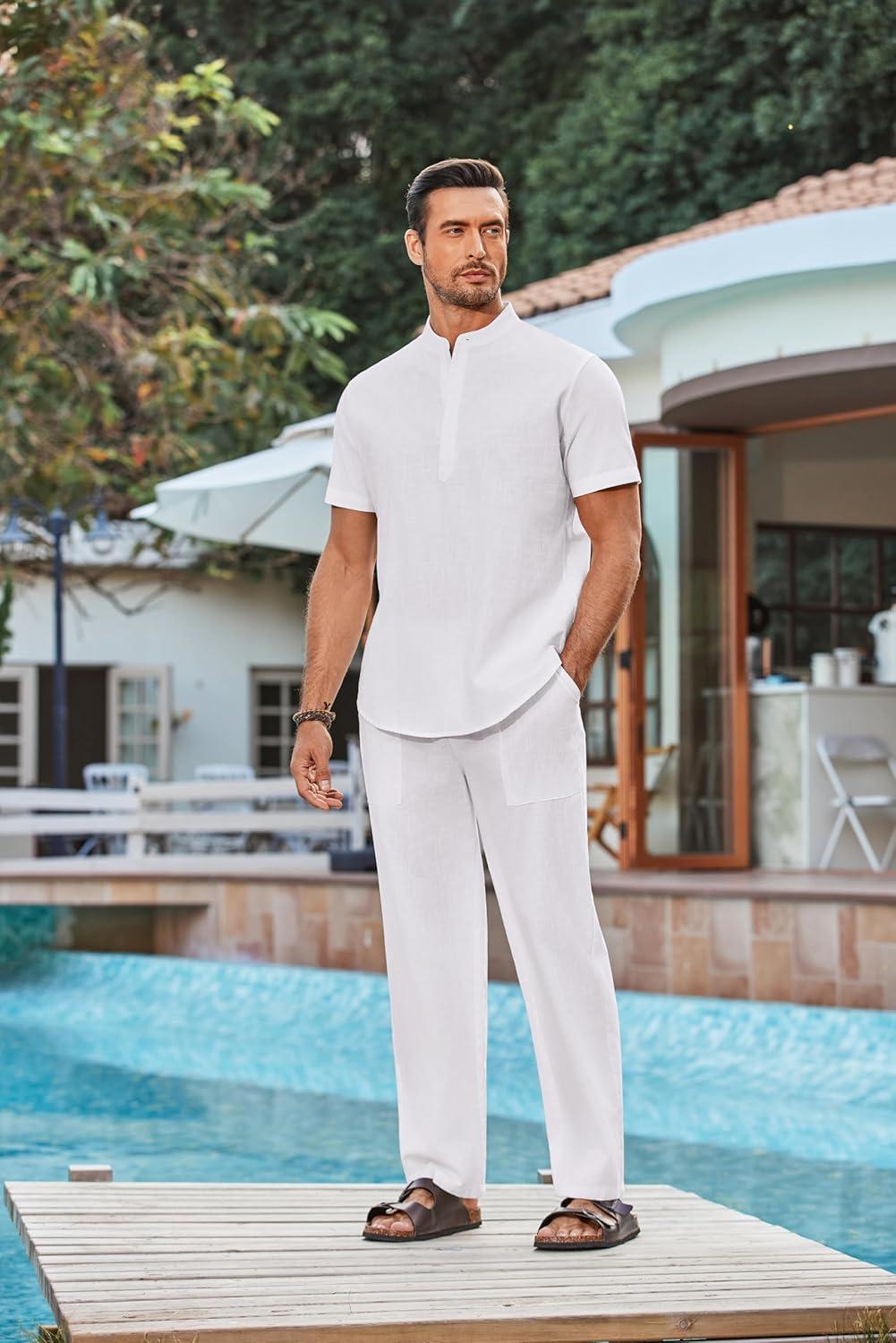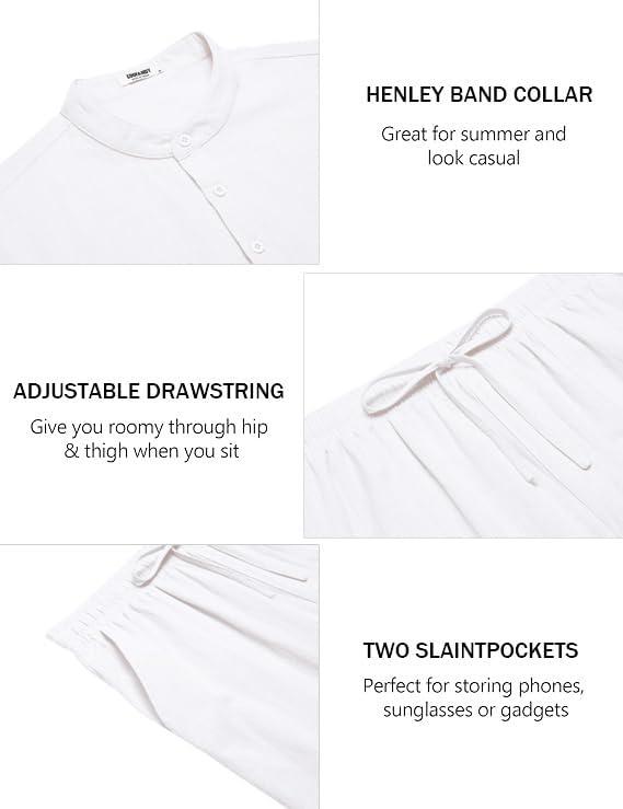 COOFANDY Men's 2 Piece Cotton Sets Casual Short Sleeve Henley Shirts and Beach Pants with Pockets Summer Vacation Outfits(A-white)