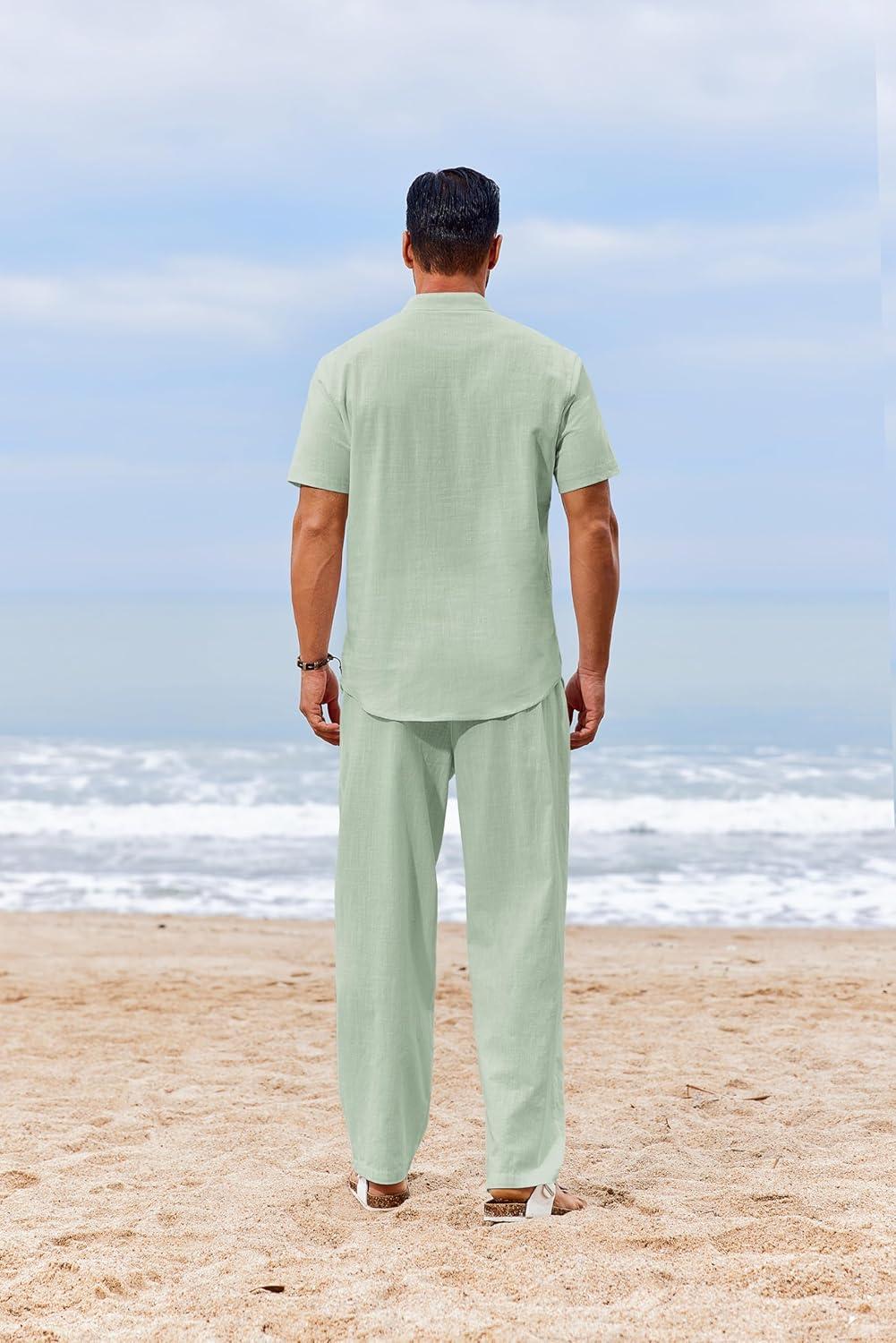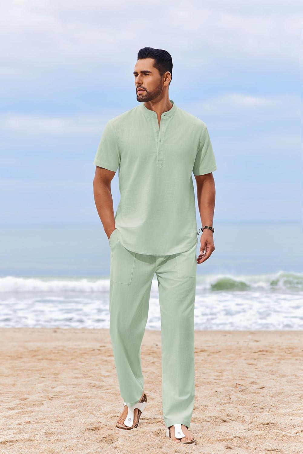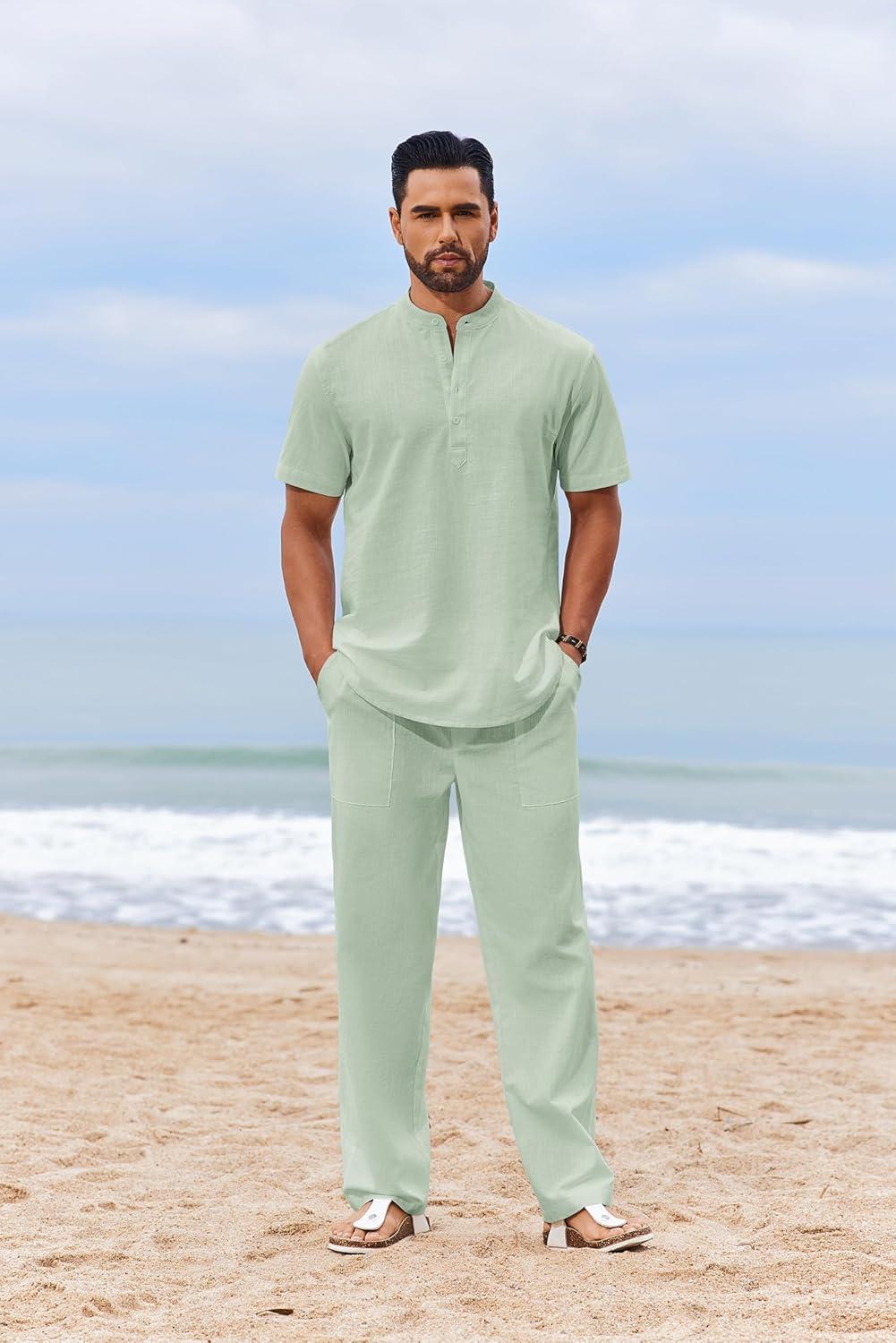 COOFANDY Men’s 2 Piece Cotton Sets Casual Short Sleeve Henley Shirts and Beach Pants with Pockets Summer Vacation Outfits(Green)