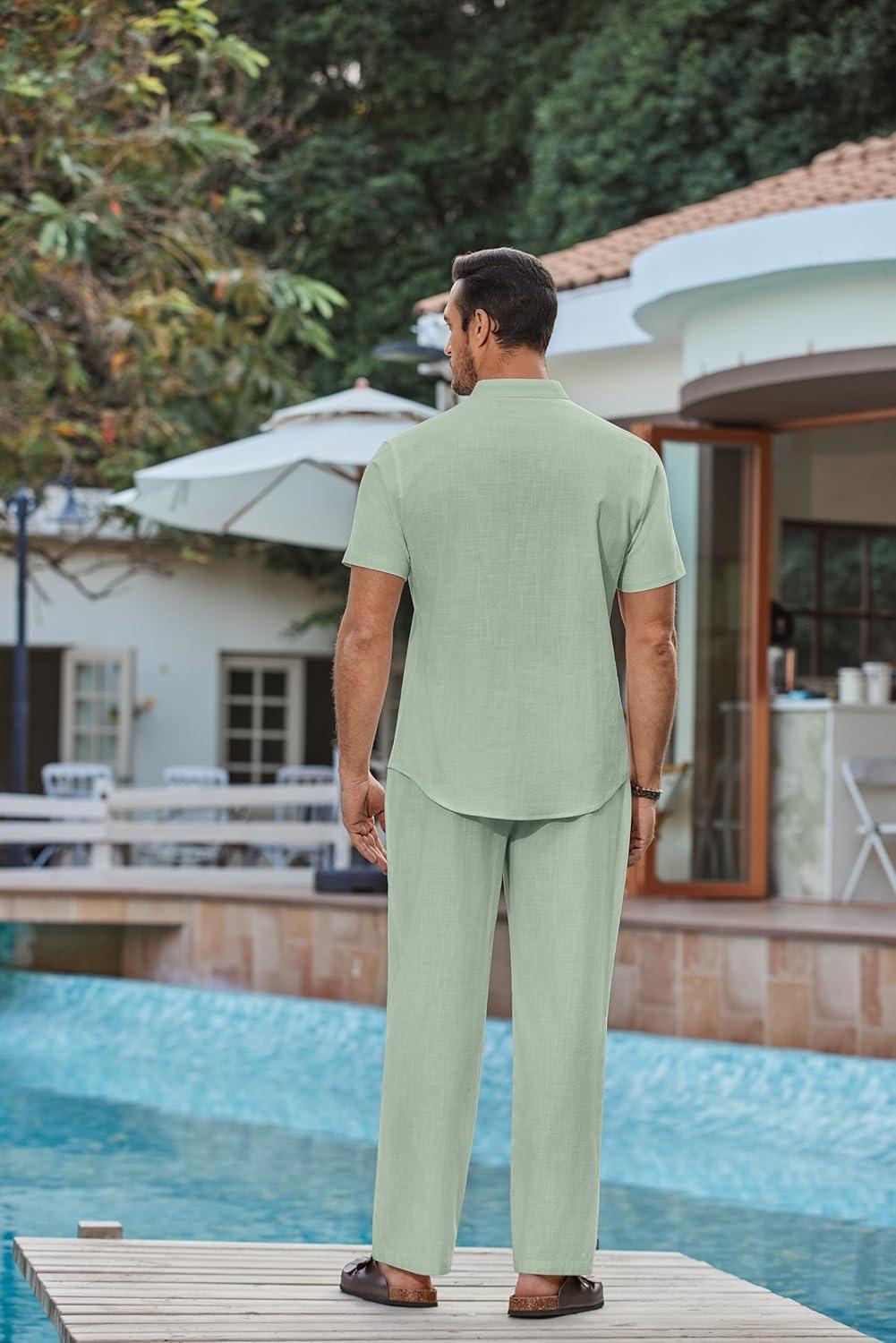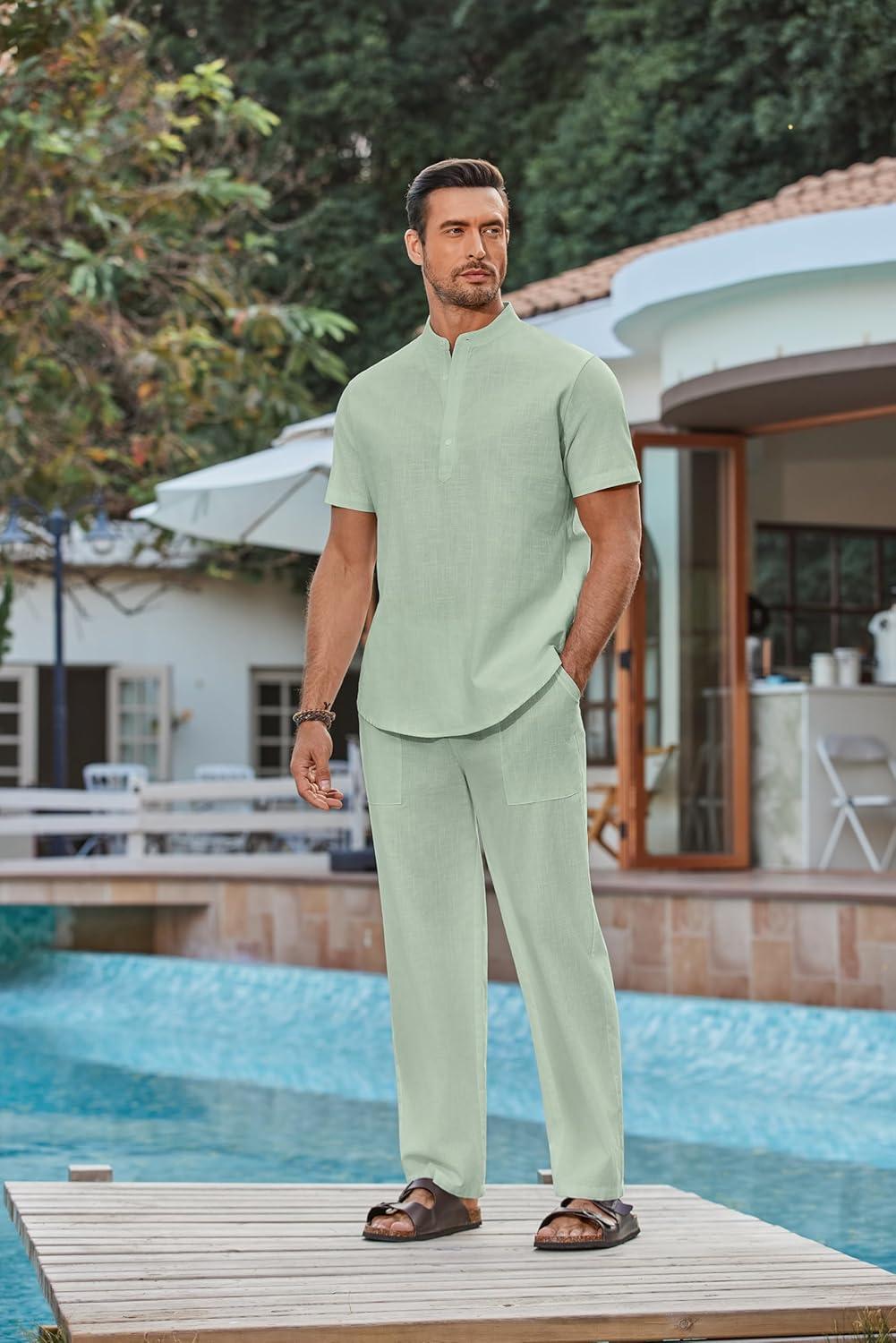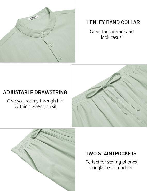 COOFANDY Men's 2 Piece Cotton Sets Casual Short Sleeve Henley Shirts and Beach Pants with Pockets Summer Vacation Outfits(Green)
