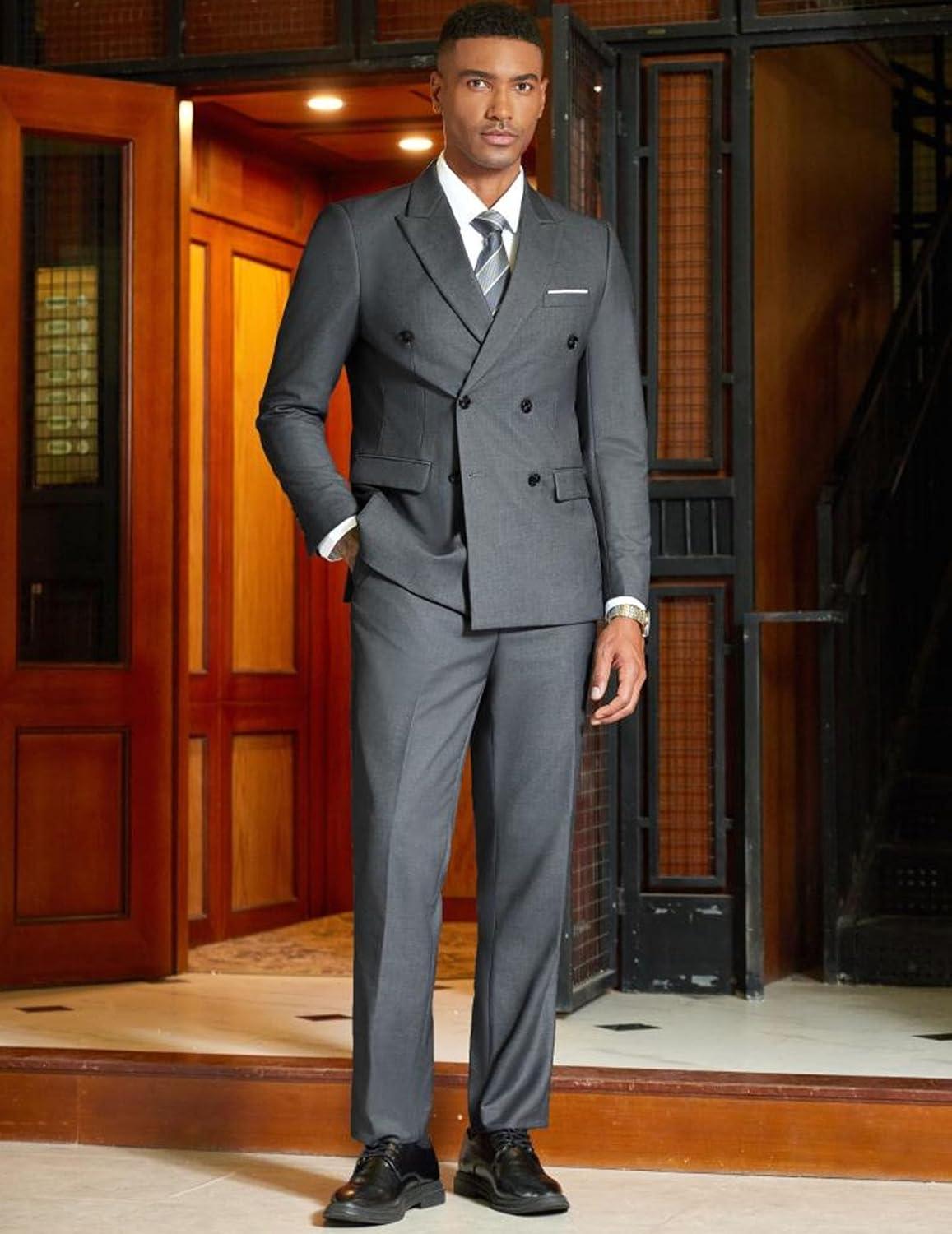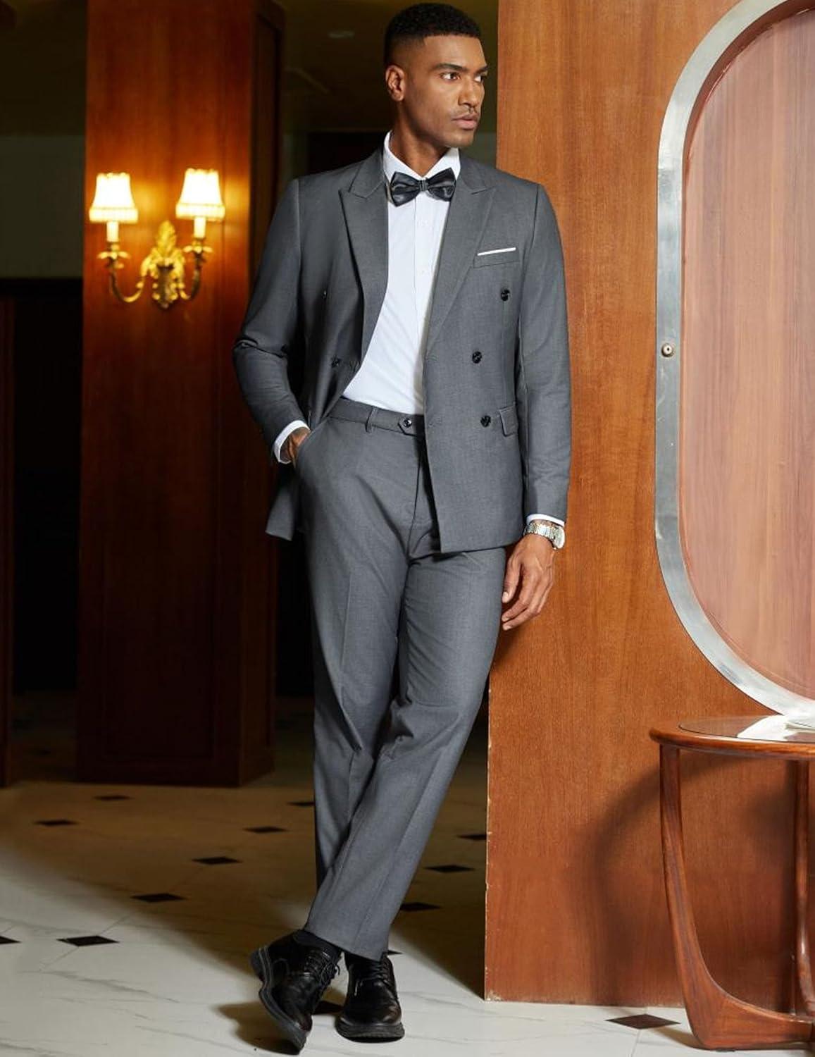 COOFANDY Men’s 2 Piece Double Breasted Suits Slim Fit Tuxedo Jacket and Dress Pants Set for Wedding Business Prom(Heather Grey)