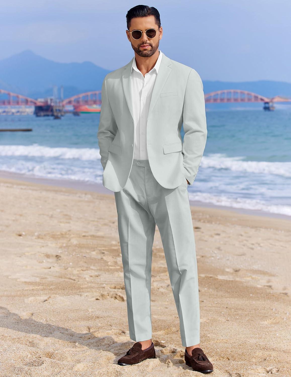 COOFANDY Men’s 2 Piece Linen Cotton Suits Set Casual Linen Lightweight Suit Summer Beach Wedding(Light Khaki)