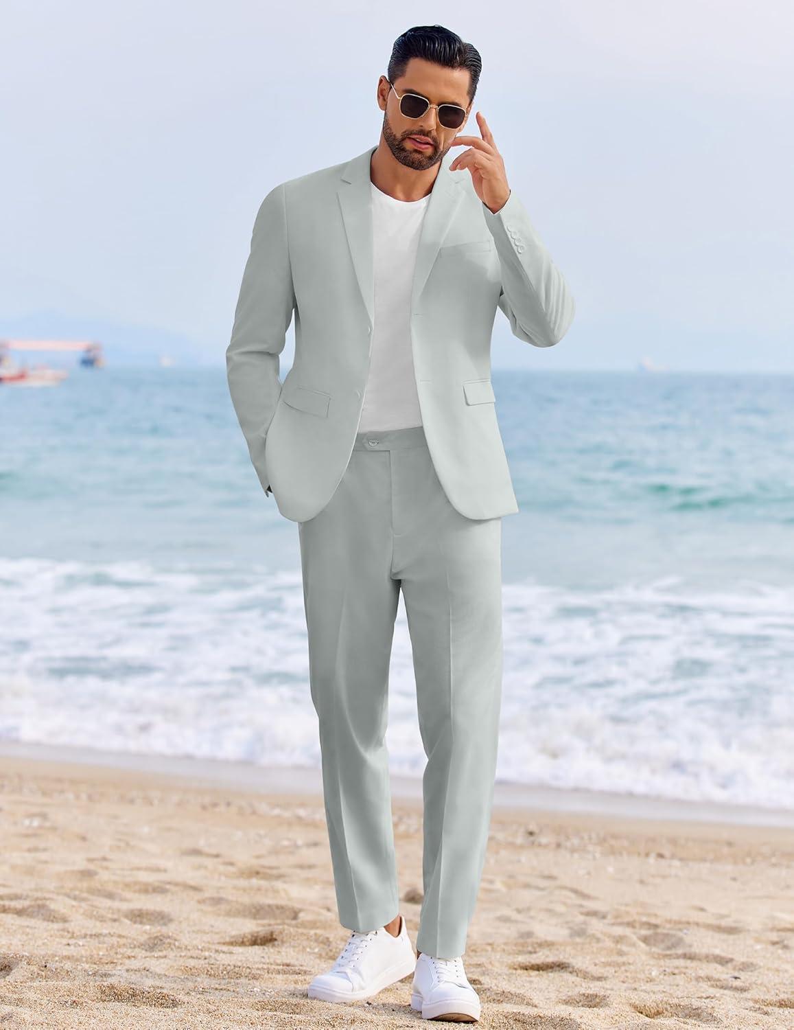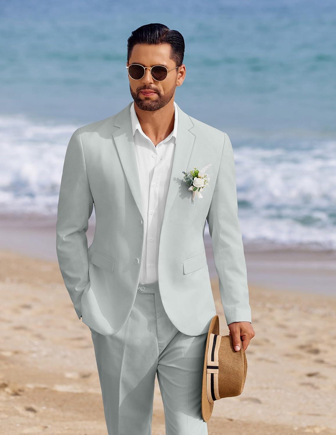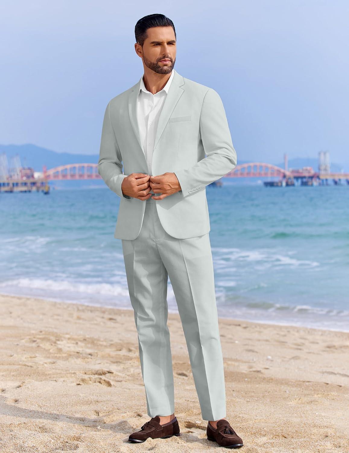 COOFANDY Men’s 2 Piece Linen Cotton Suits Set Casual Linen Lightweight Suit Summer Beach Wedding(Light Green)