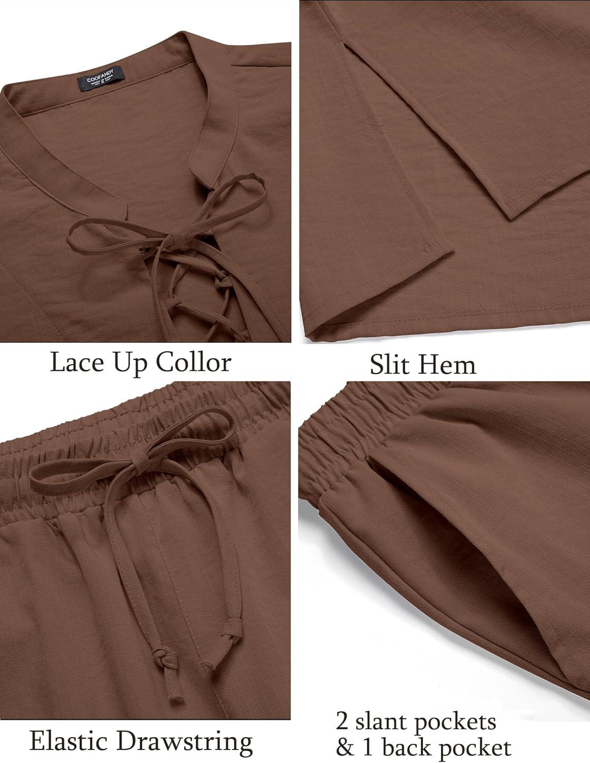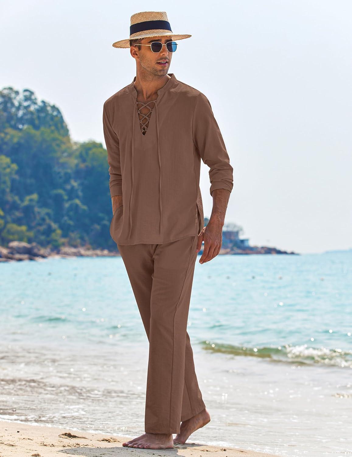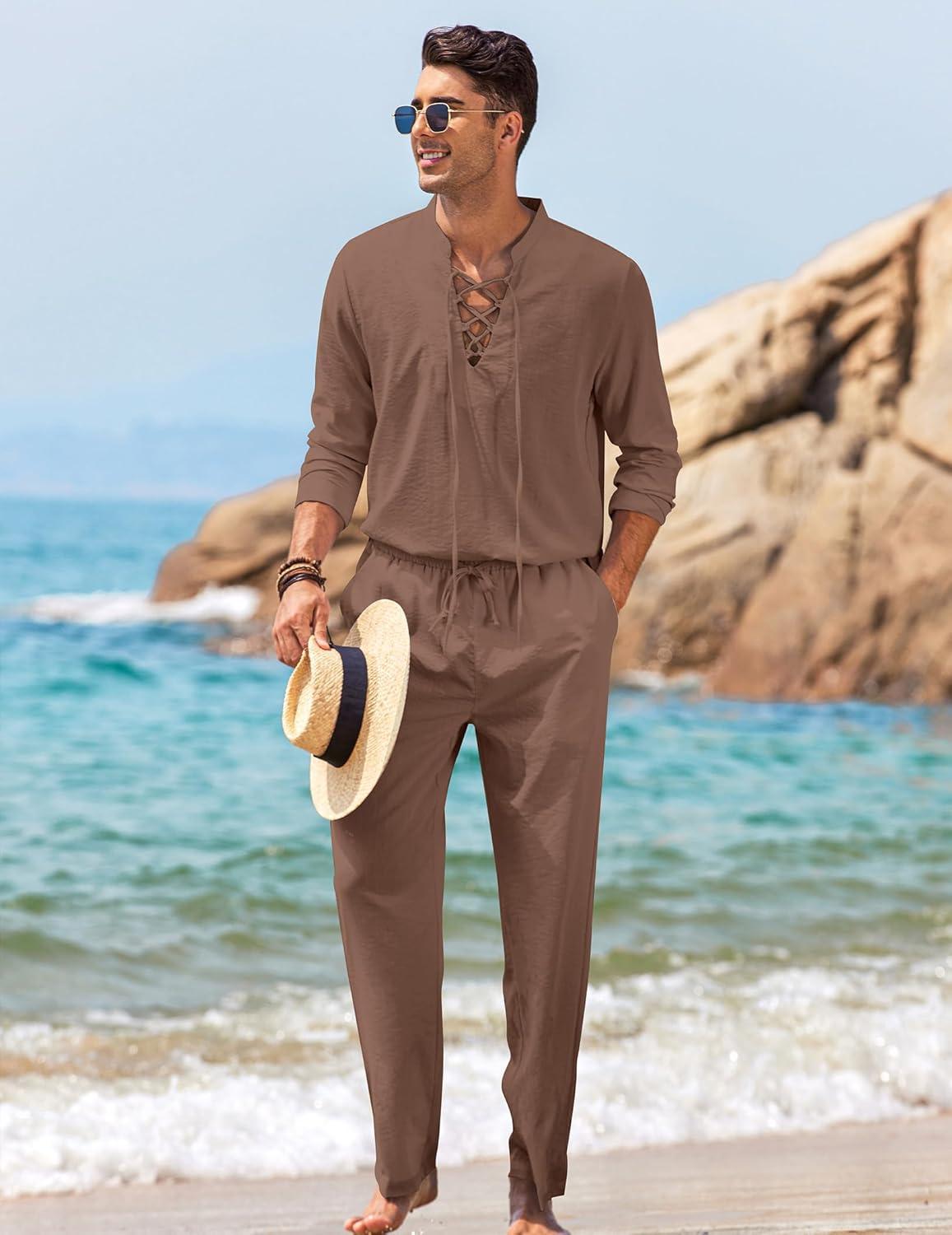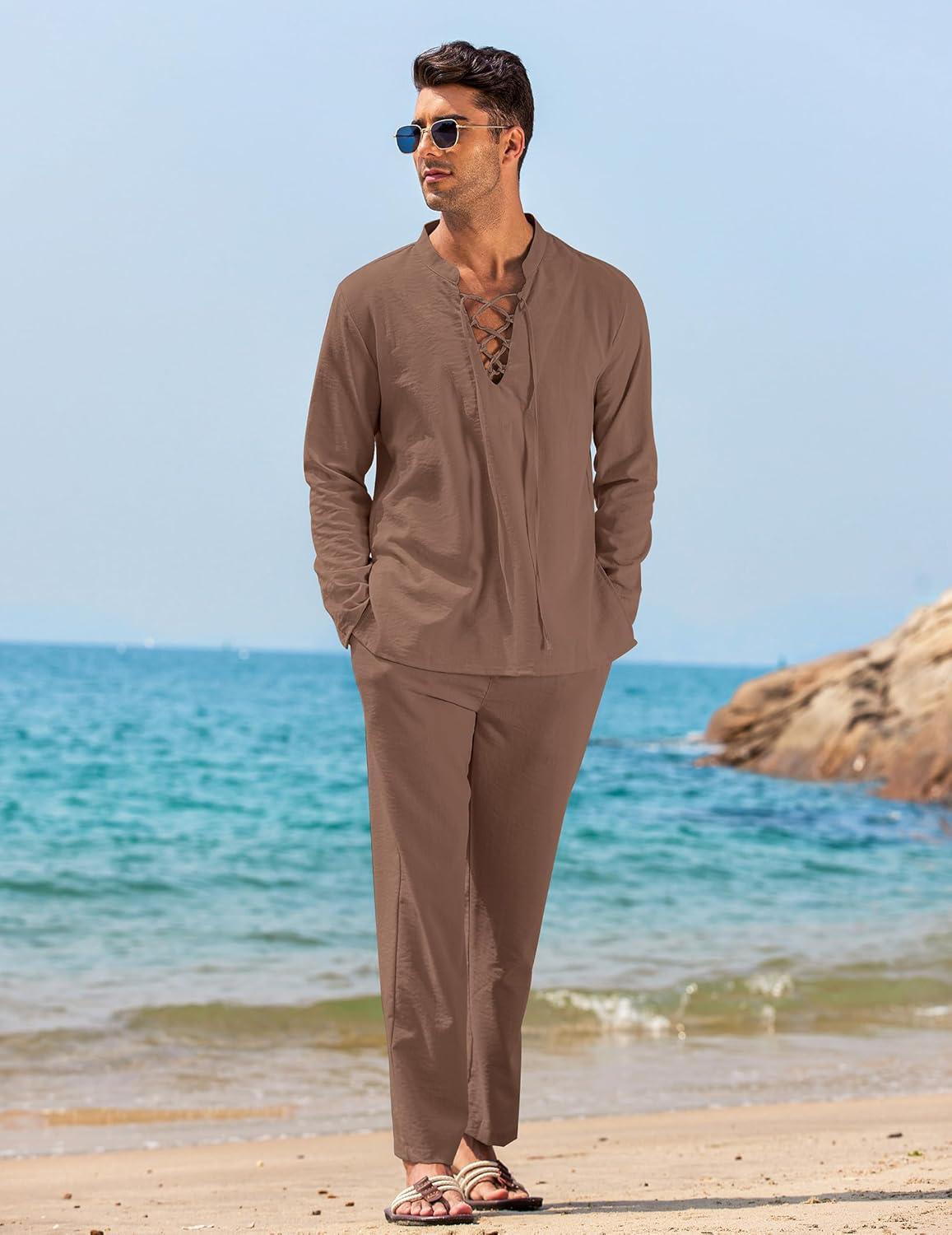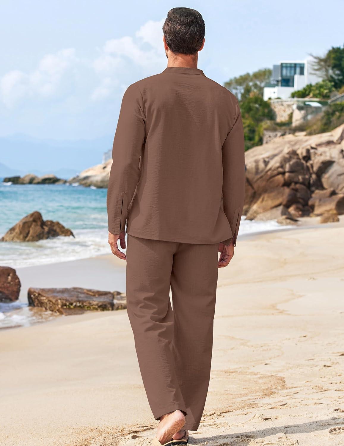 COOFANDY Men’s 2 Piece Linen Set Long Sleeve Henley Shirts Casual Beach Pants With Pockets Summer Yoga Outfits(Brown)