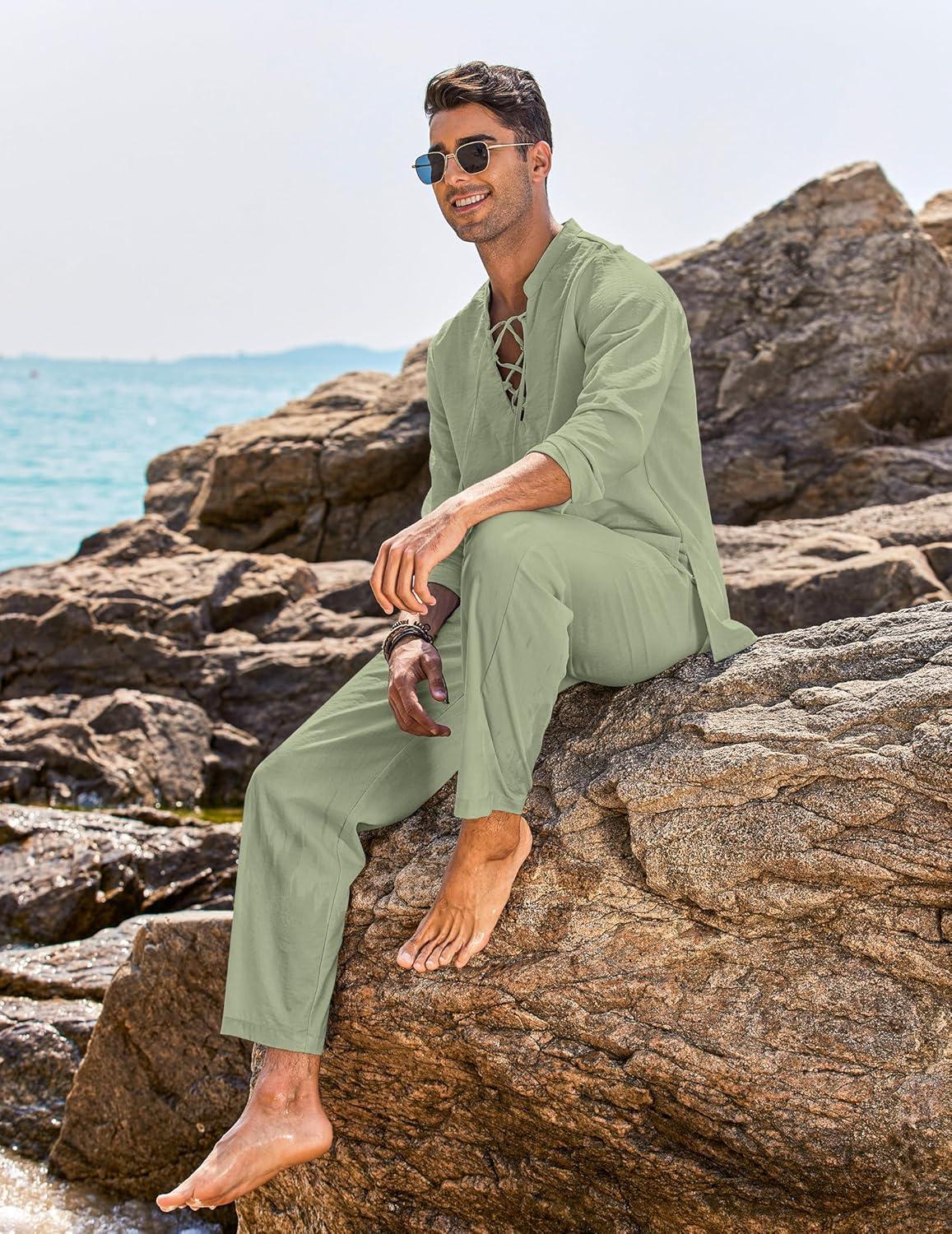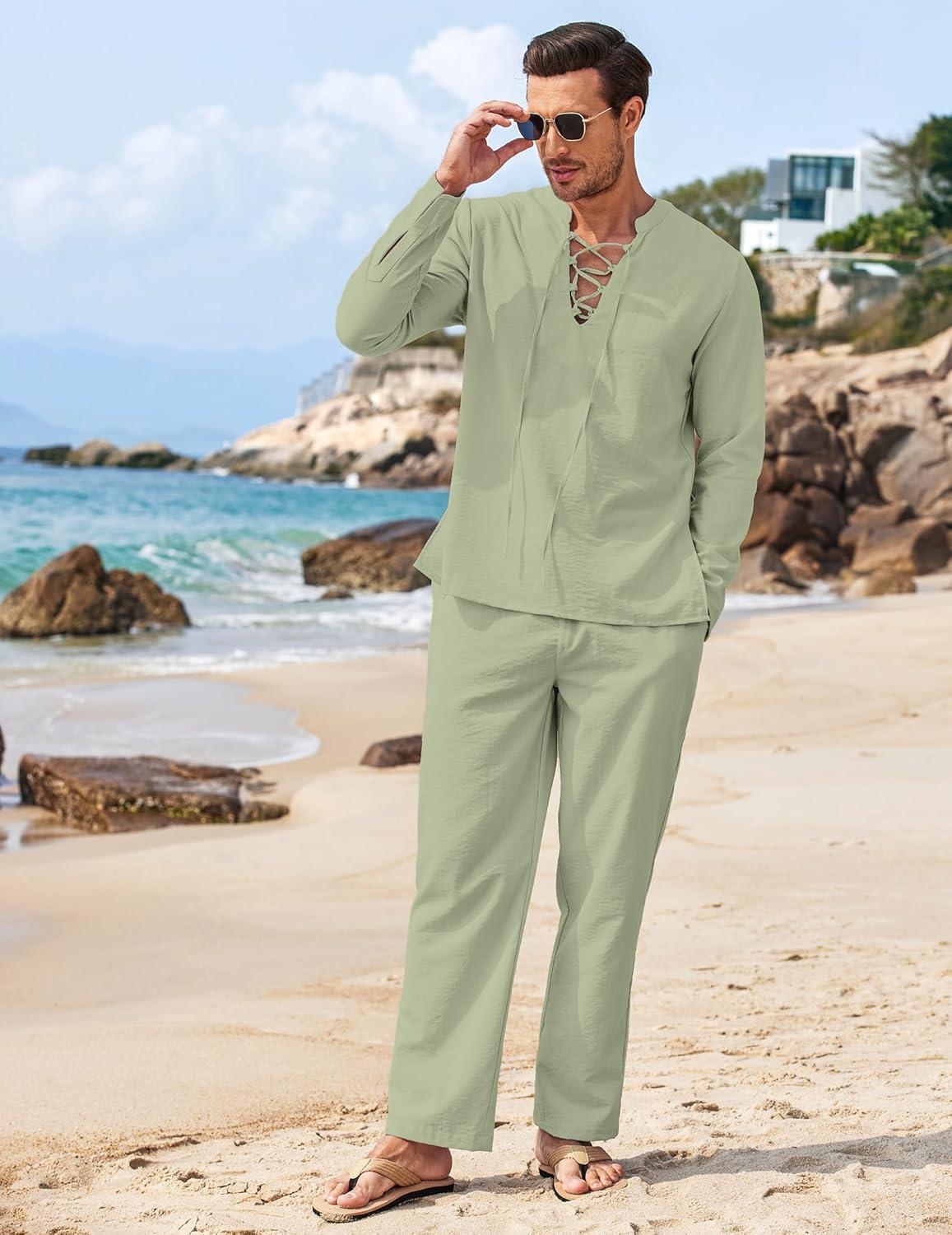 COOFANDY Men's 2 Piece Linen Set Long Sleeve Henley Shirts Casual Beach Pants With Pockets Summer Yoga Outfits(Light Green)