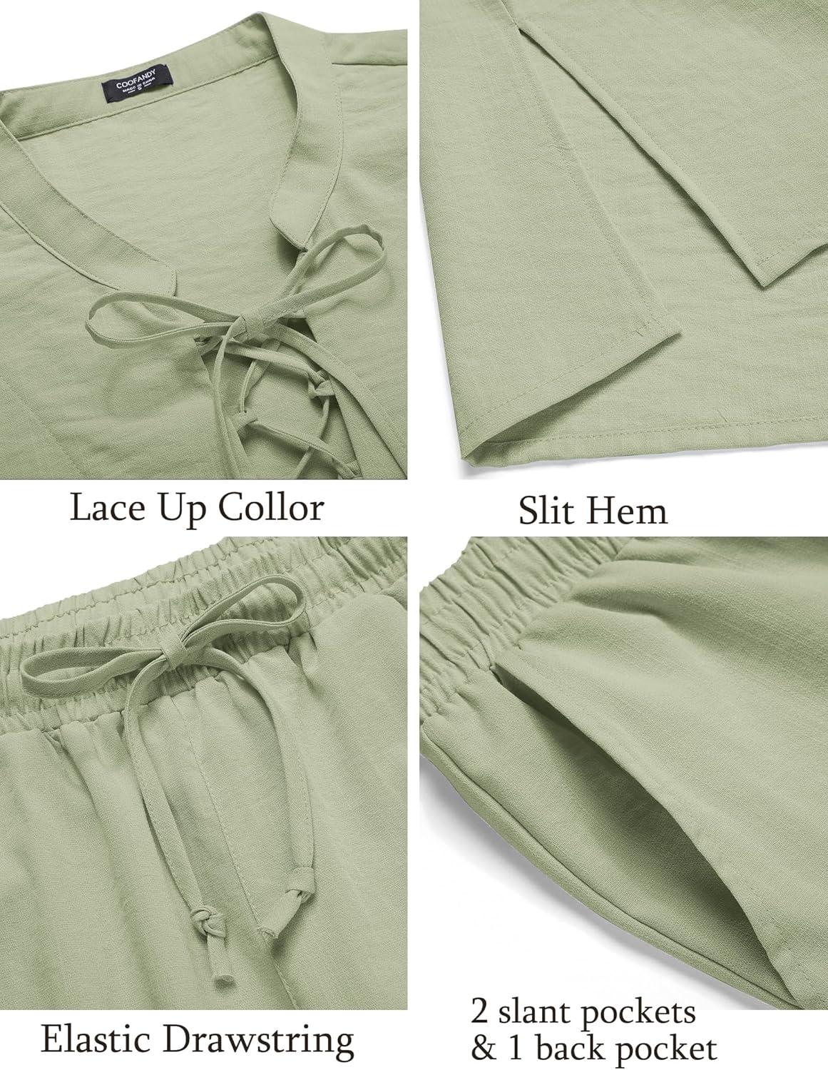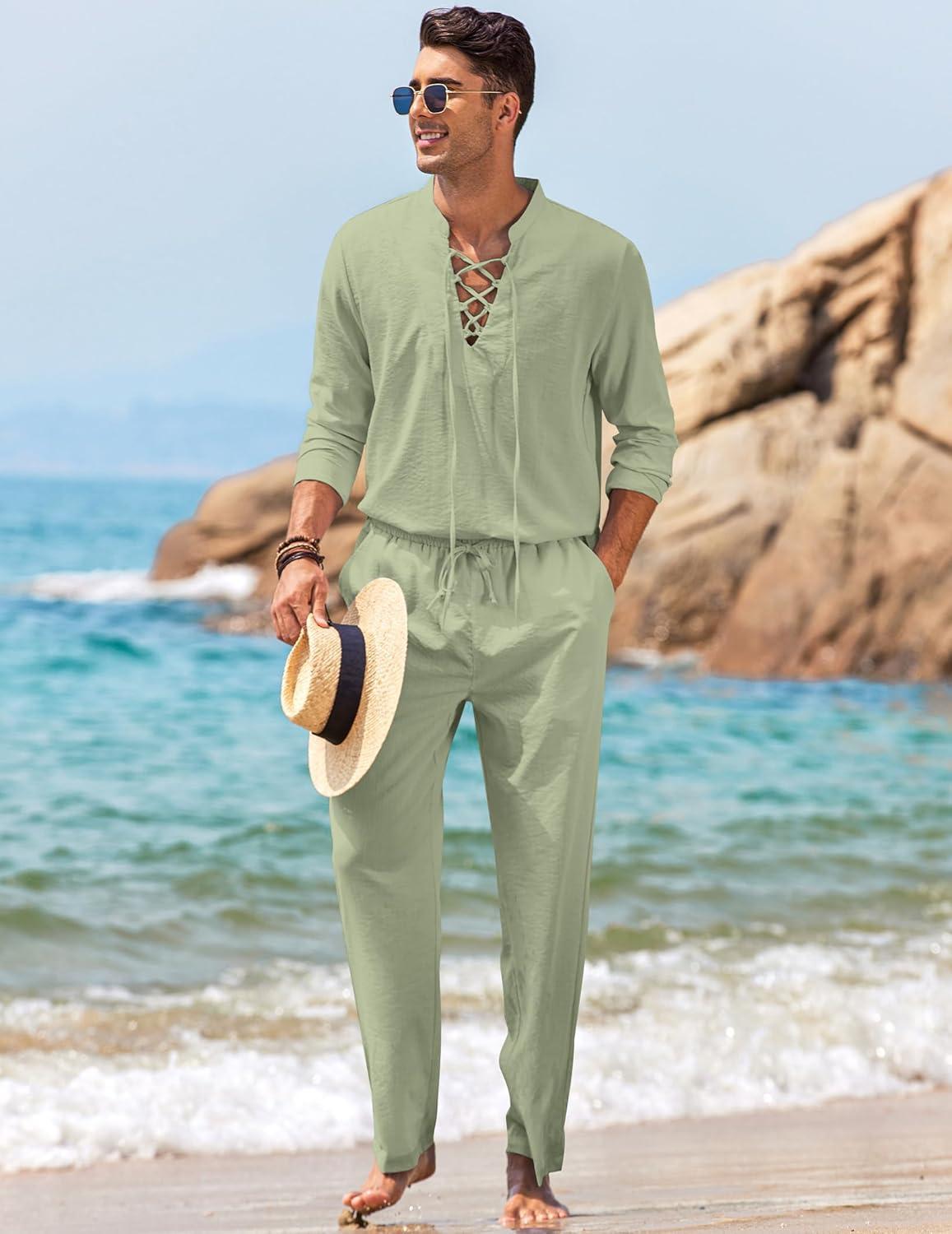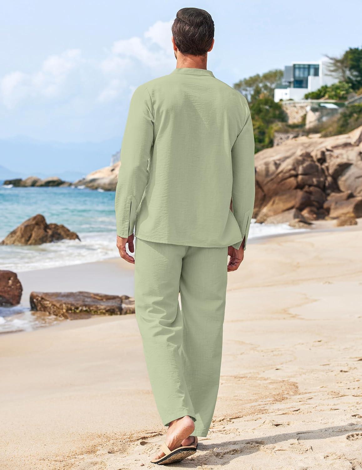 COOFANDY Men’s 2 Piece Linen Set Long Sleeve Henley Shirts Casual Beach Pants With Pockets Summer Yoga Outfits(Light Green)