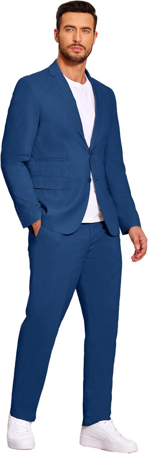 COOFANDY Men’s 2 Piece Linen Suits Set Regular Fit Casual Lightweight Blazer Jacket and Pants(Blue)