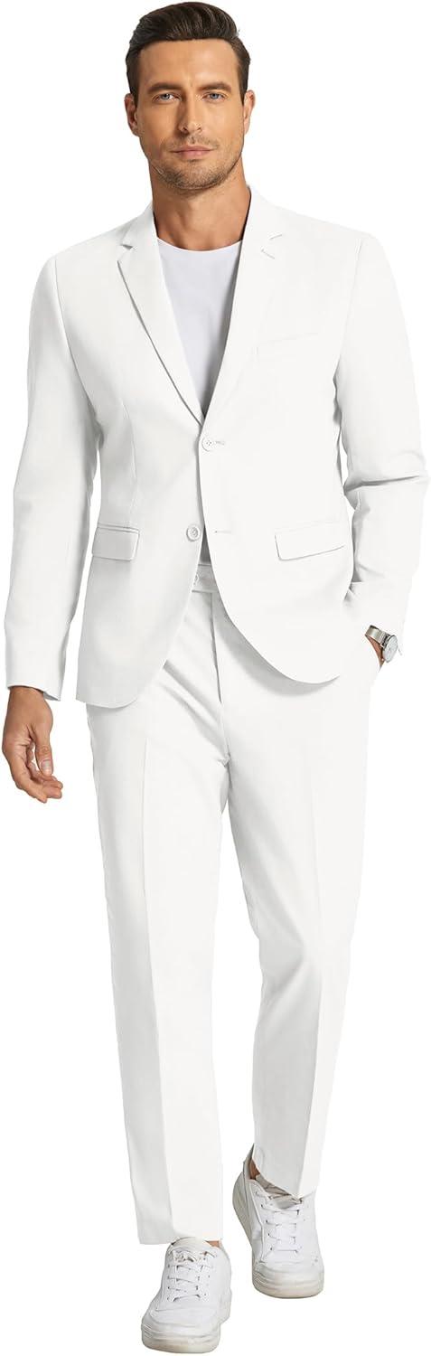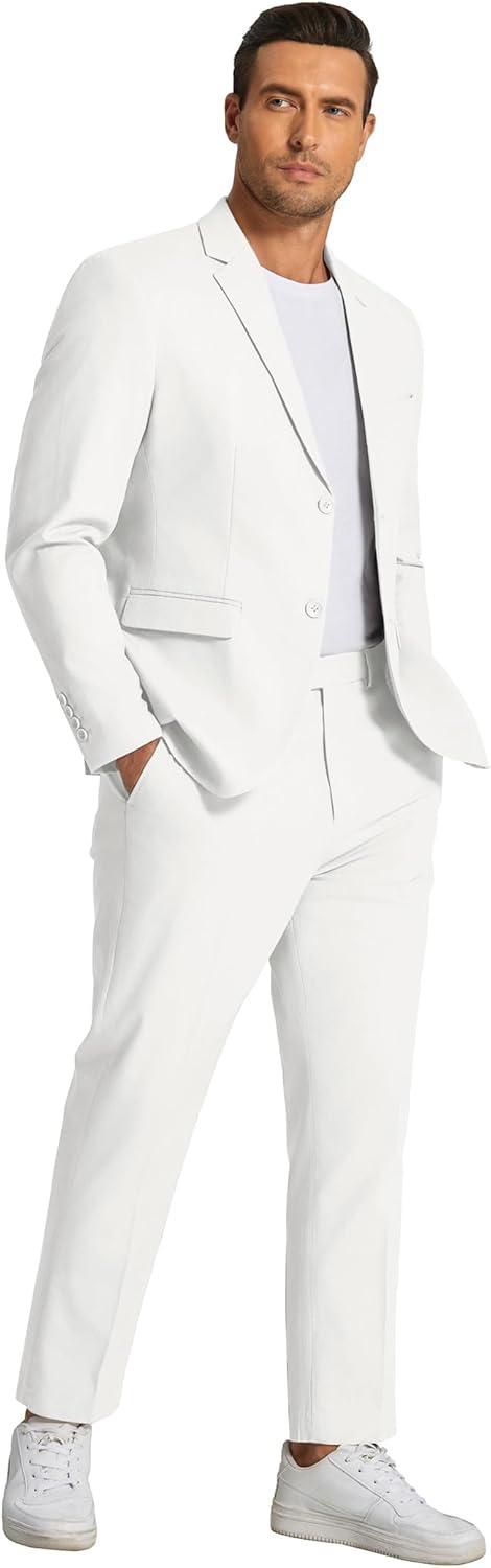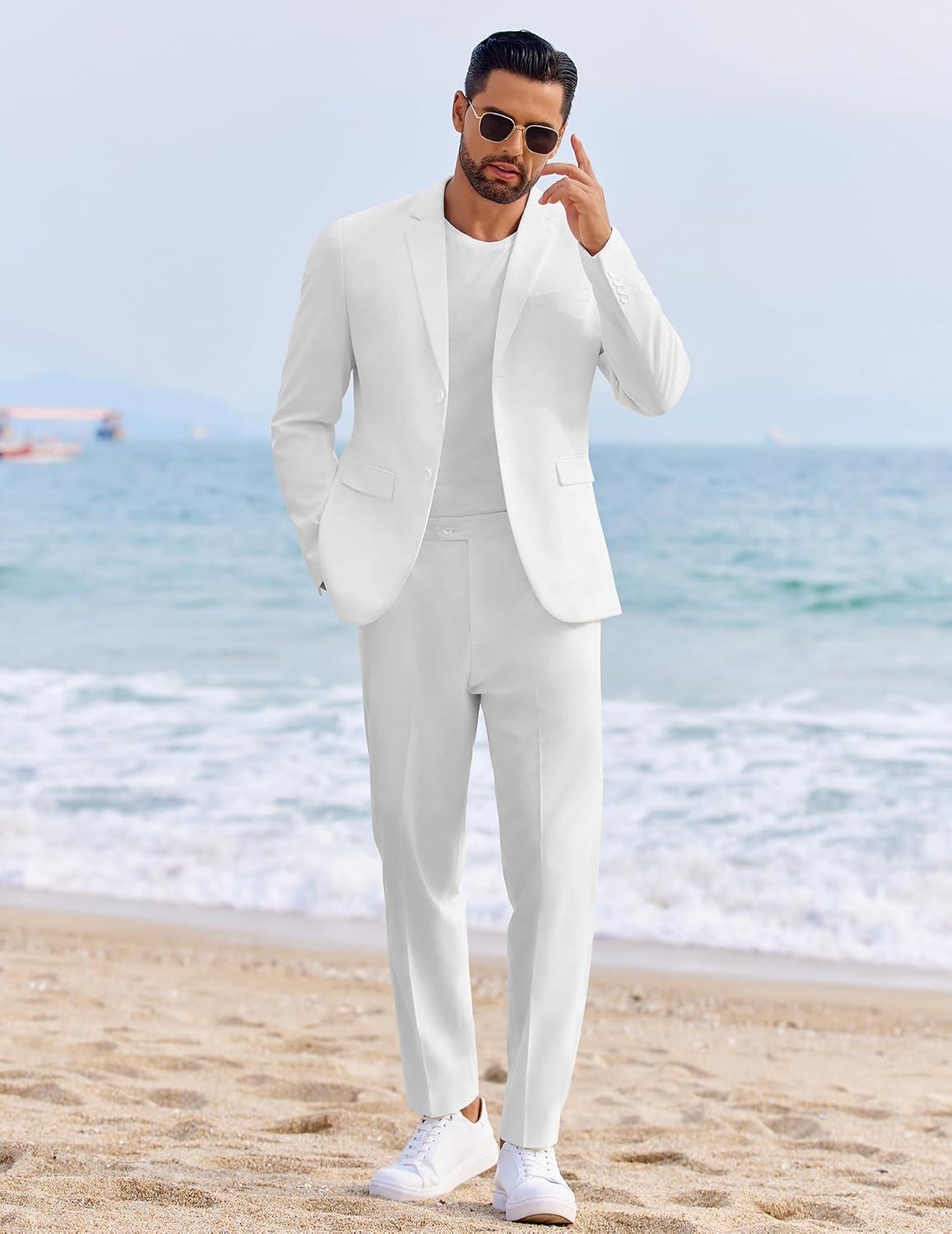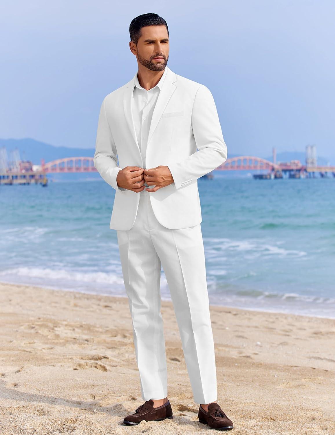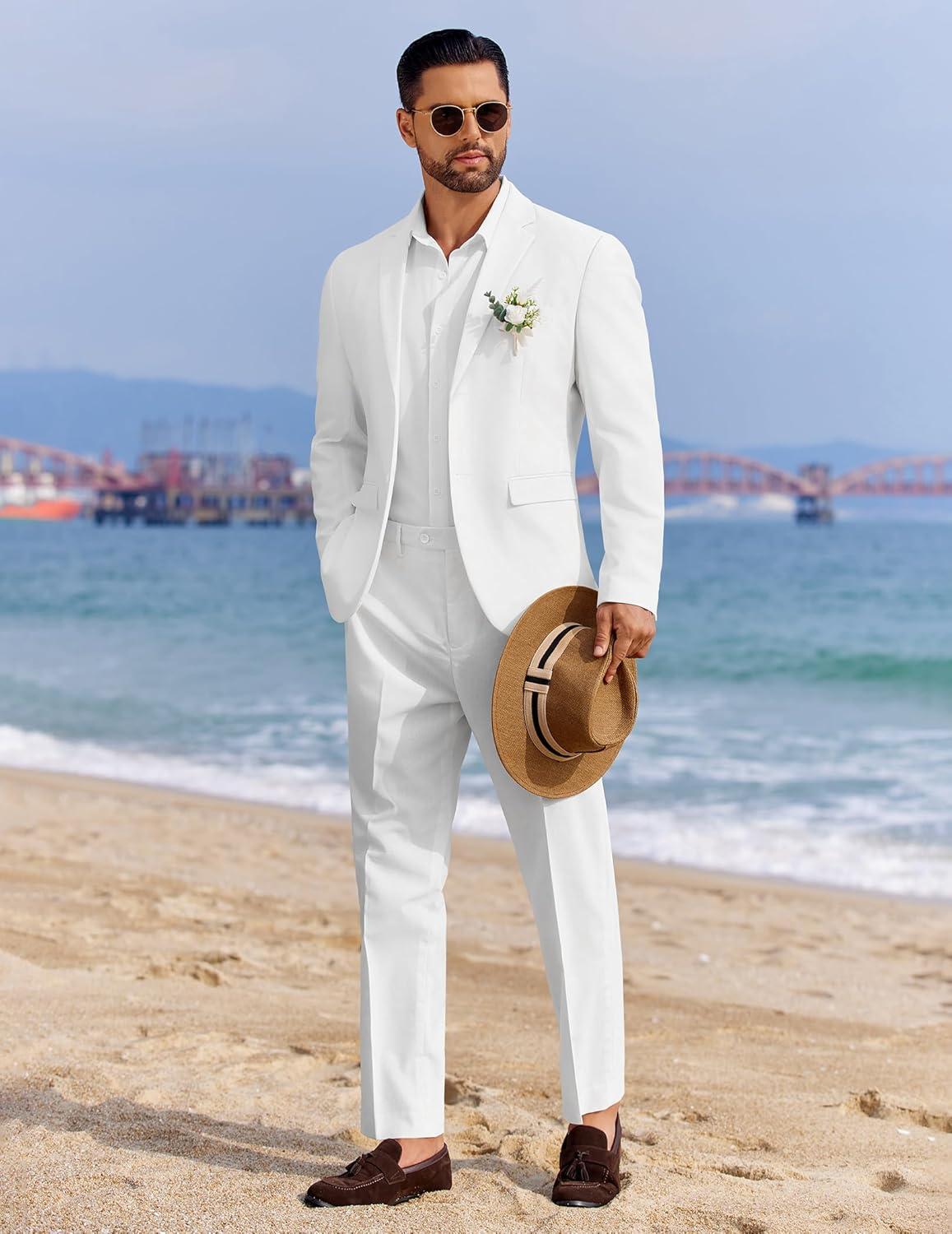 COOFANDY Men's 2 Piece Linen Suits Set Regular Fit Casual Linen Lightweight Suit Summer Beach Wedding(White)